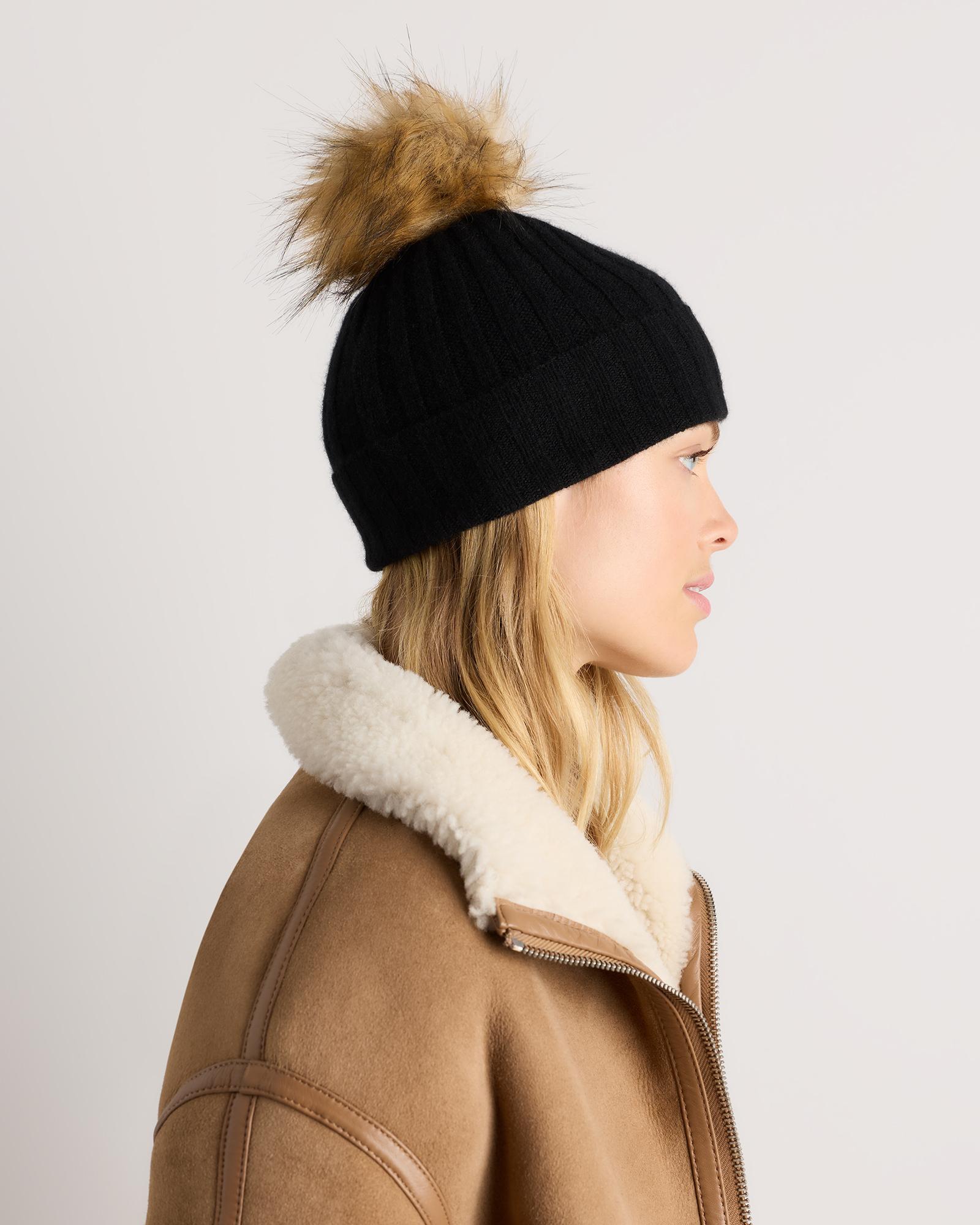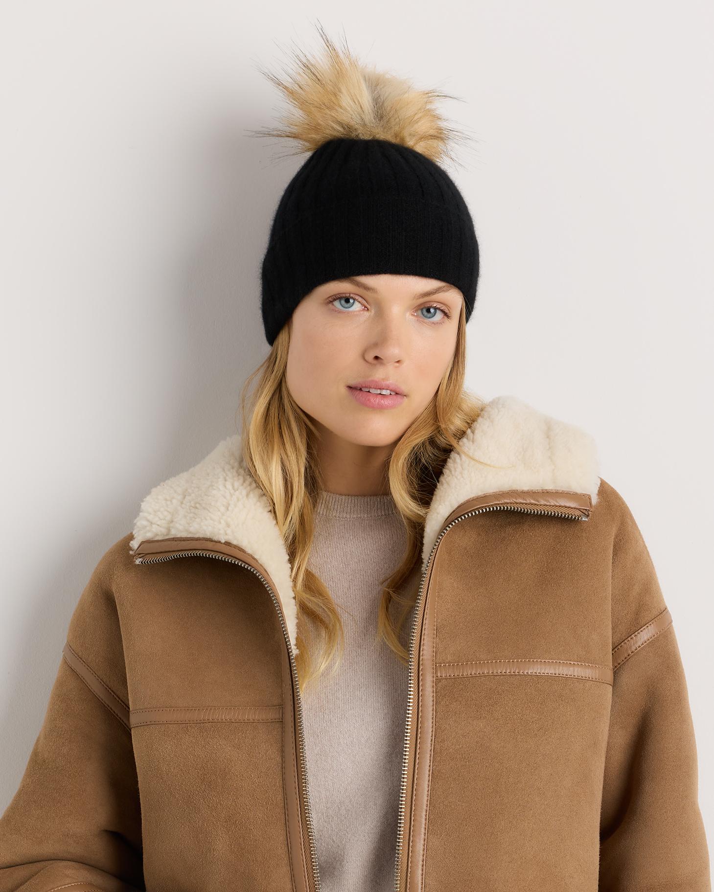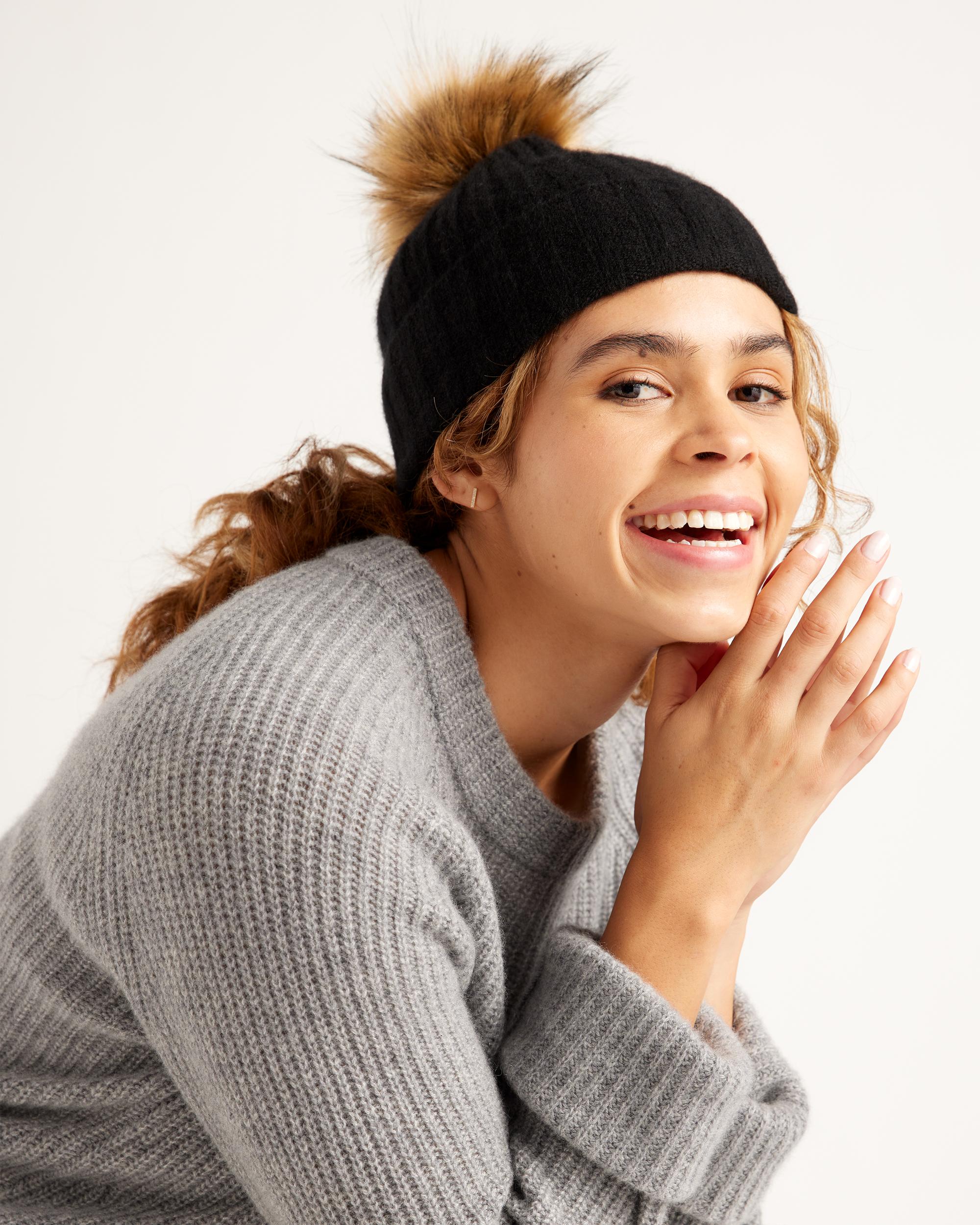 Our best-selling cashmere beanie with a playful pom pom detail to instantly add the perfect dose of warmth style, whether you're running errands or hitting the slopes. With a ribbed texture and adjustable folded cuff you can wear it exactly how you like it. Our quality cashmere is incredibly long-lasting and three times as warm as wool, sourced sustainably and ethically. Read more on what makes it special in our Cashmere 101. | Quince | Women's Cashmere Pom Pom Beanie in Black Grade A Mongolian Cashmere, Winter Hats