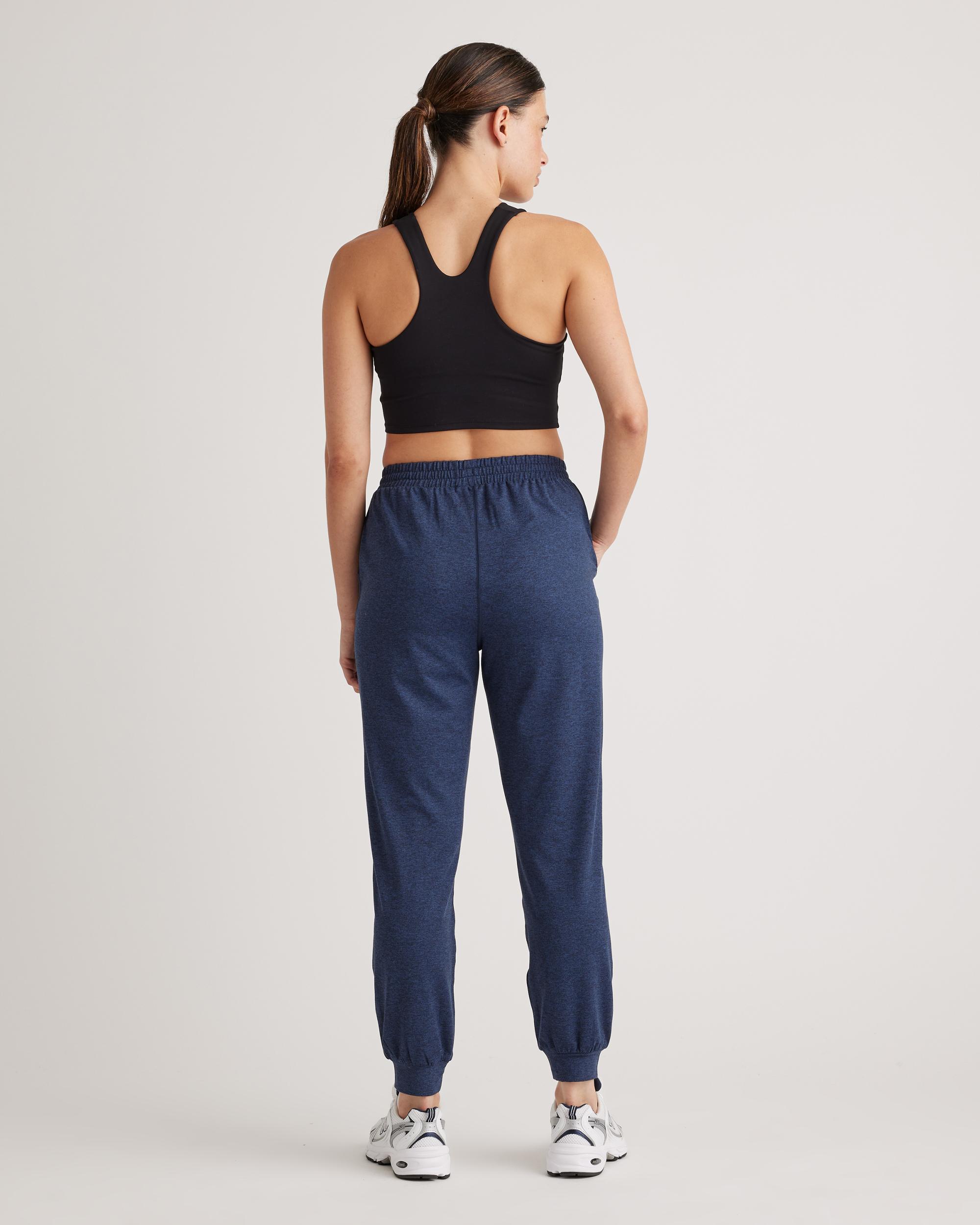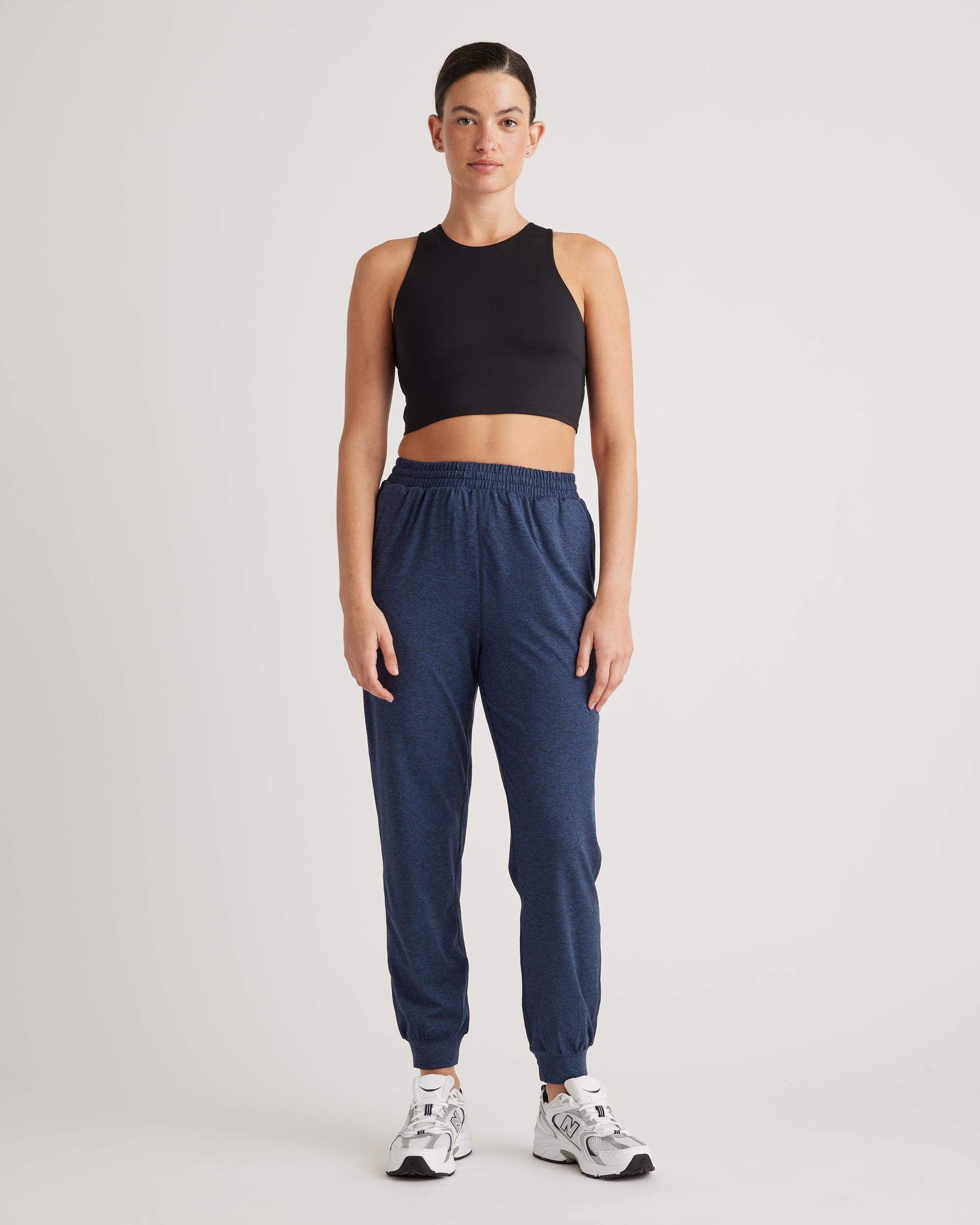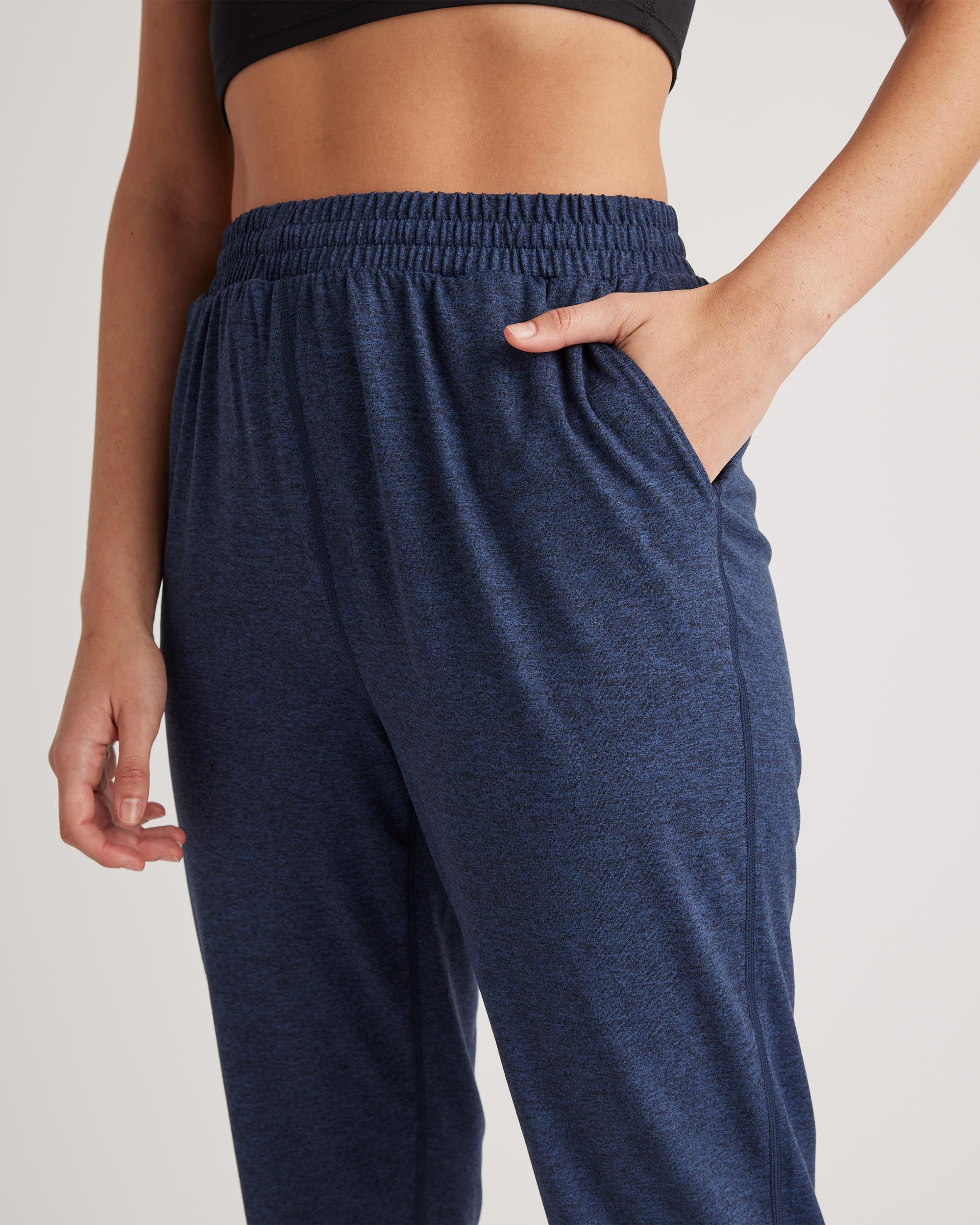 Meet the Flowknit High-Rise Boyfriend Jogger—a more relaxed update to our best seller. With a higher rise and longer inseam, these joggers will keep you comfortable and stylish whether you're out on a walk, running errands, or lounging at home. And just because they're comfy doesn't mean they skimp on performance: They're made in our signature Flowknit fabric for quick-dry, moisture-wicking, and 4-way stretch benefits. | Quince | Women's Flowknit High-Rise Boyfriend Jogger in Heather Navy, Size Small, Recycled Polyester / Spandex