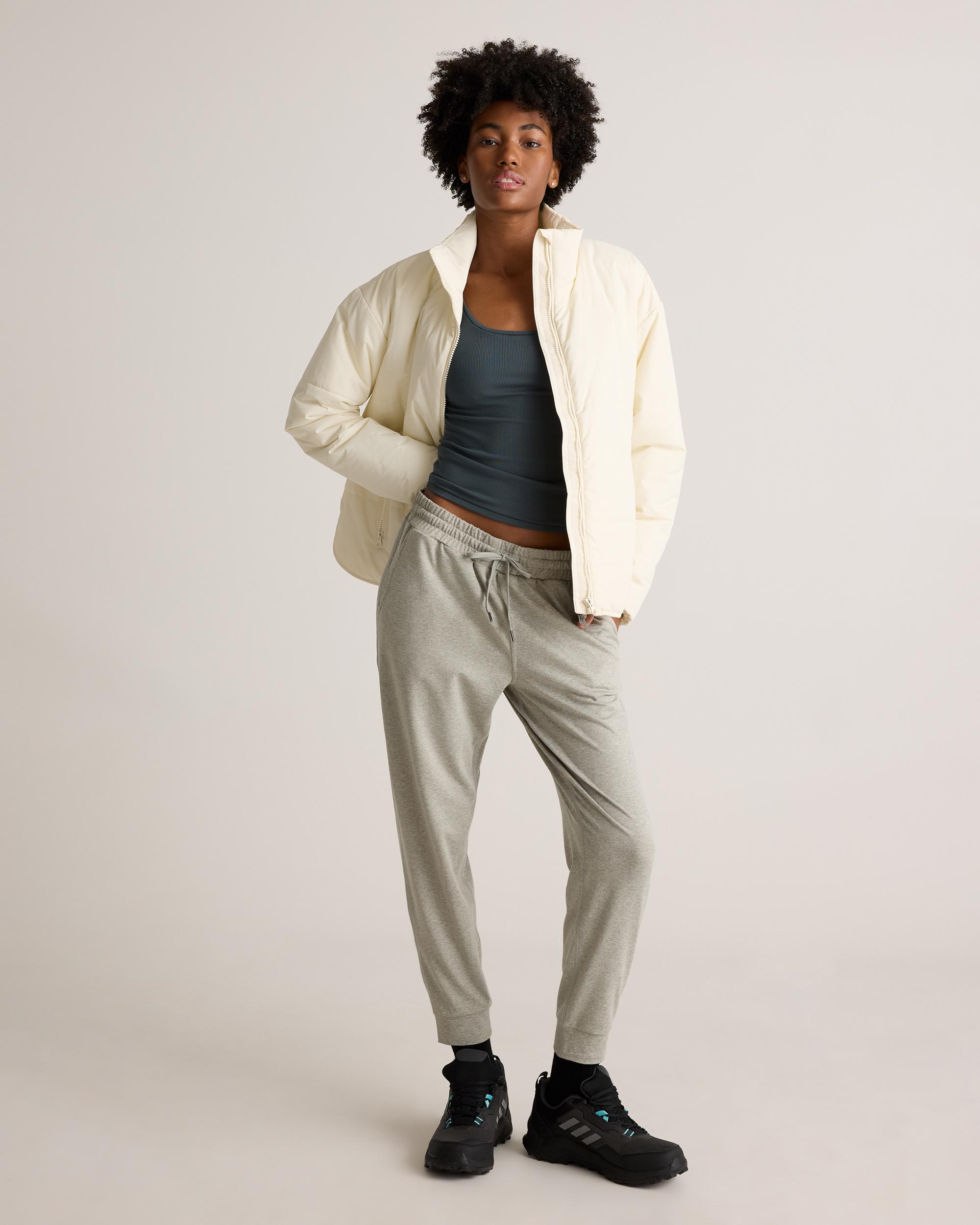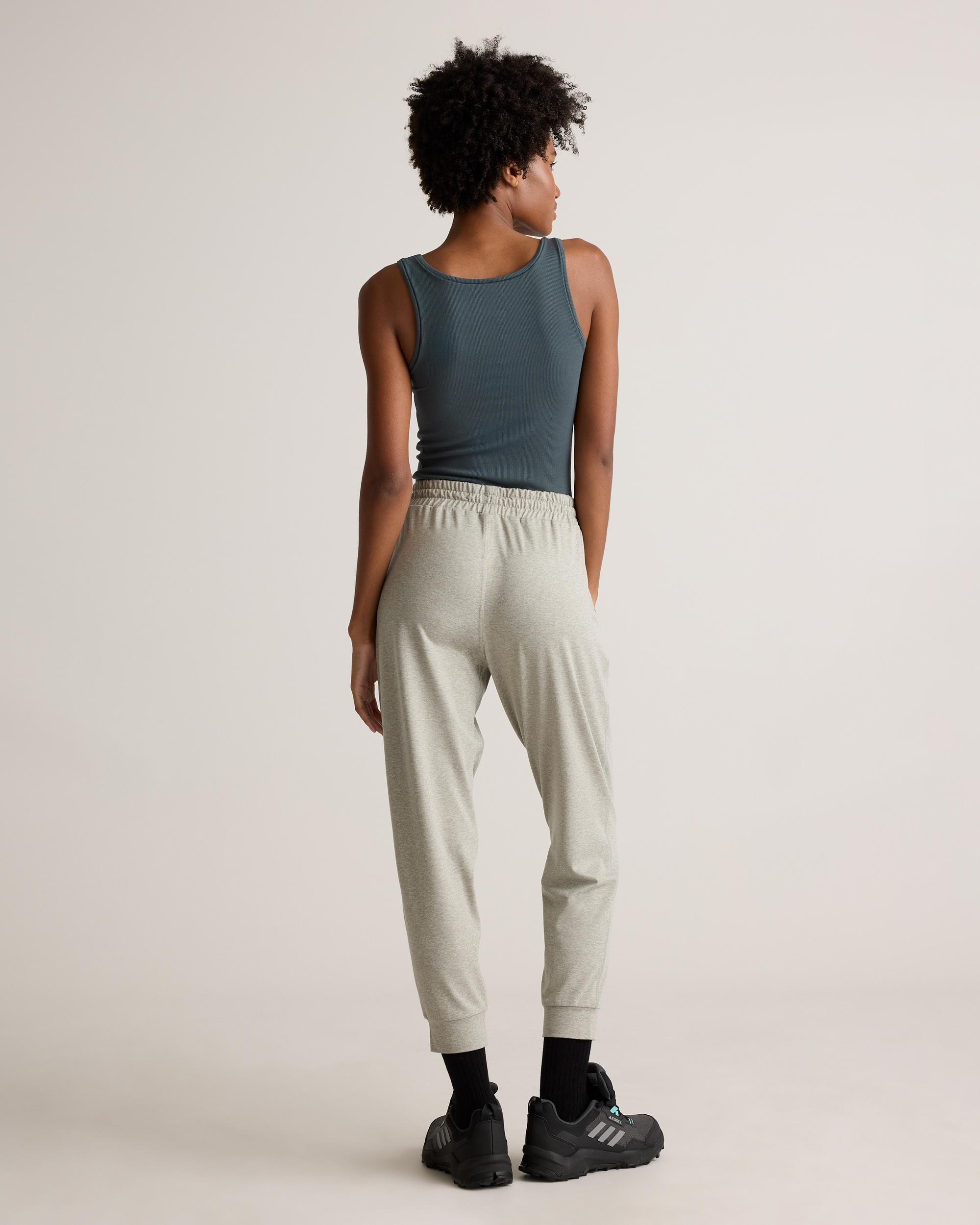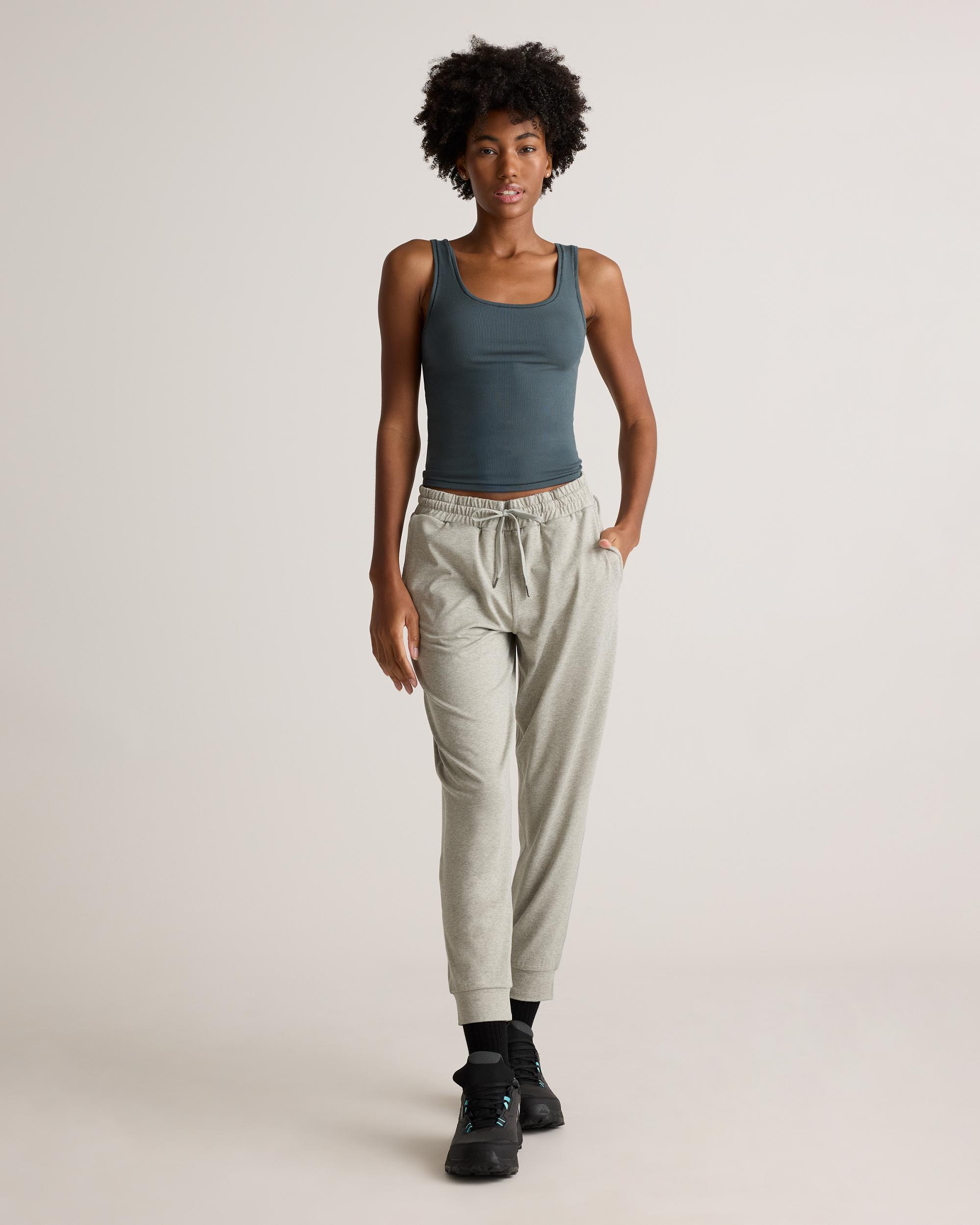 Our favorite performance joggers are a slim fit with the perfect amount of stretch for ultimate comfort. Thick drawstrings, cuffed ankles, and two pocket design give them a premium feel. Our Flowknit fabric is made from Global Recycle Standard poly yarn, which diverts and recycles plastics destined for landfill or the ocean, so you can feel and look good in what you wear. | Quince | Women's Flowknit Mid-Rise Jogger in Heather Aloe, Size Medium, Recycled Poly with Stretch
