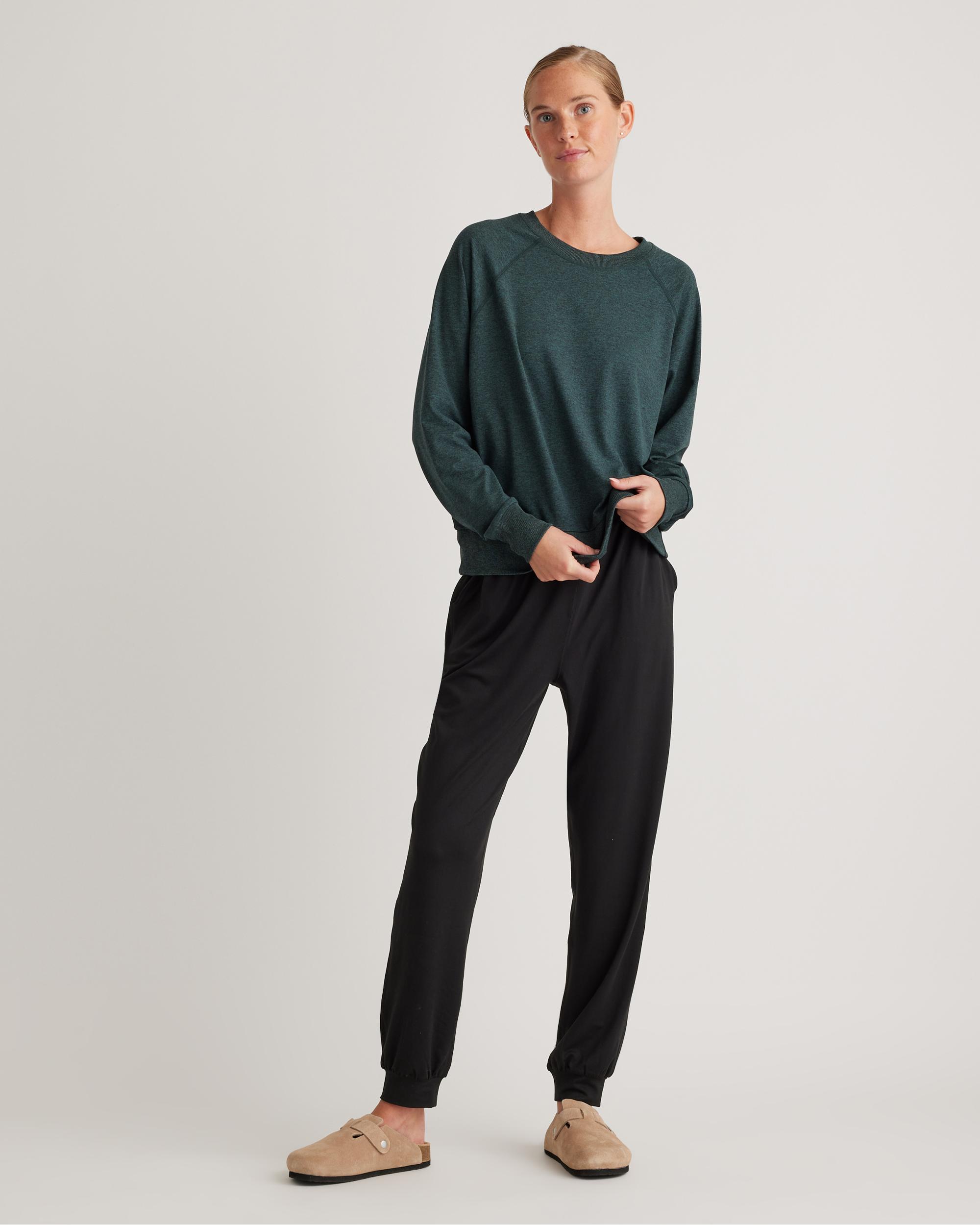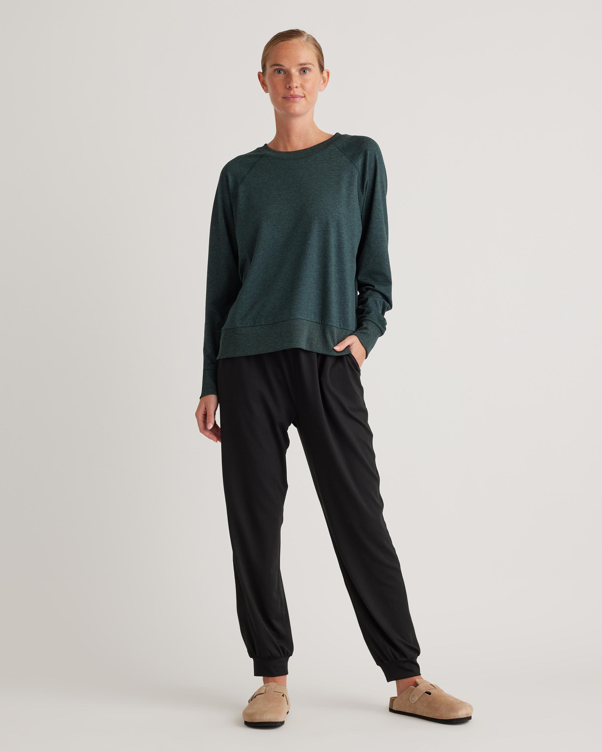 When comfort and performance is the priority, grab this Flowknit Pullover Crew. Perfect for staying cozy to and from your favorite workout class, this pullover offers quick-drying and moisture-wicking properties, helping to keep you dry even when you're most active. Its fabric also helps keeps you feeling fresh, while the 4-way stretch gives extra flex. | Quince | Women's Flowknit Pullover Crew Neck Alpaca Sweater in Heather Green, Size XS, Recycled Polyester / Spandex