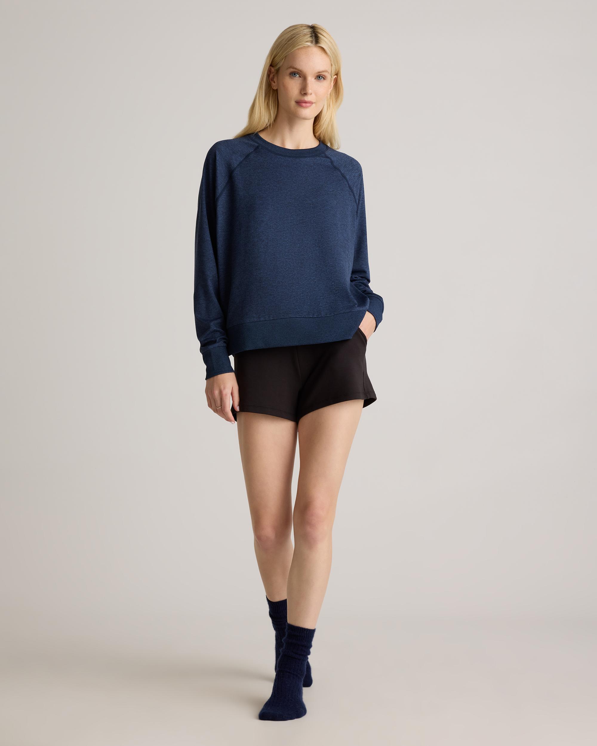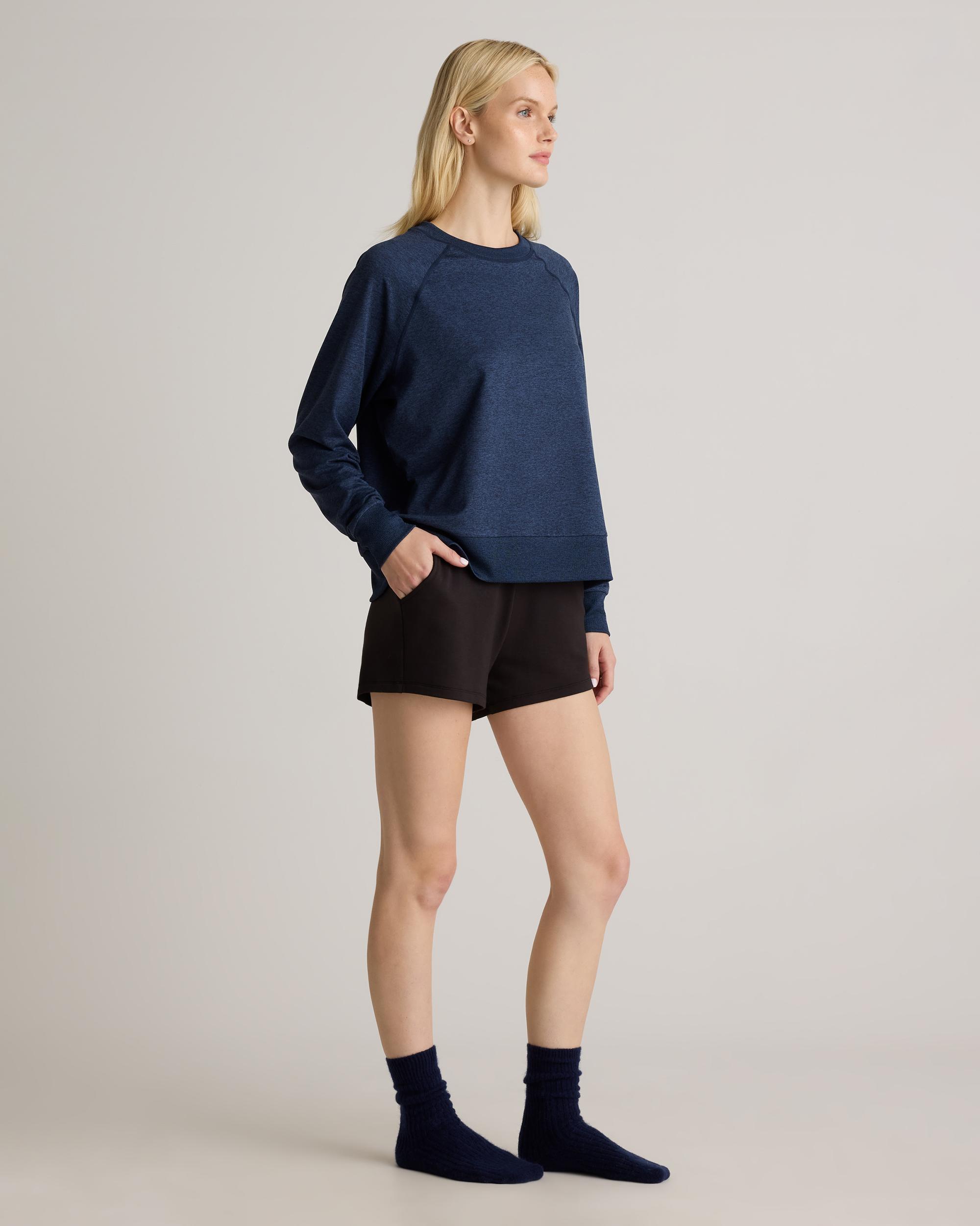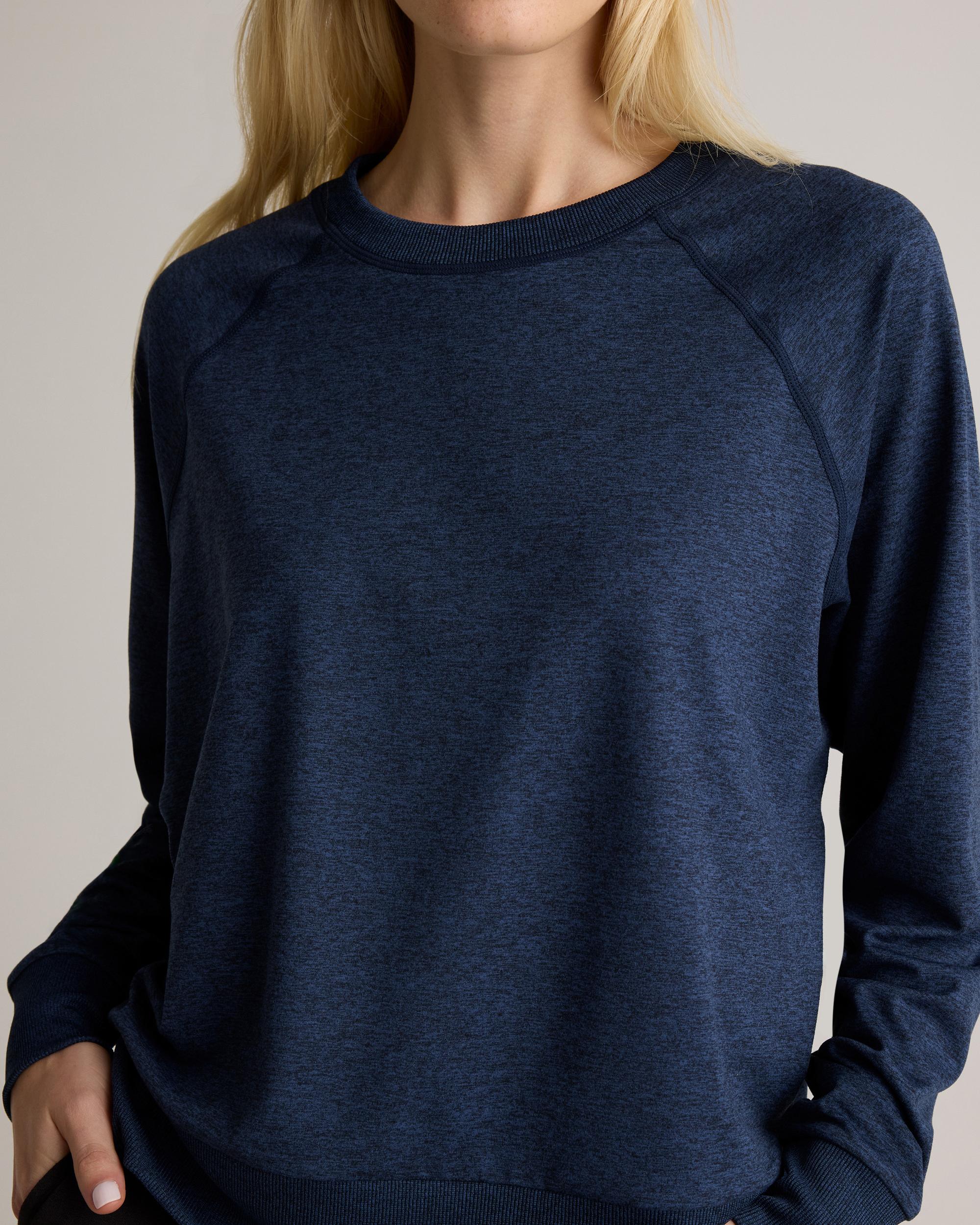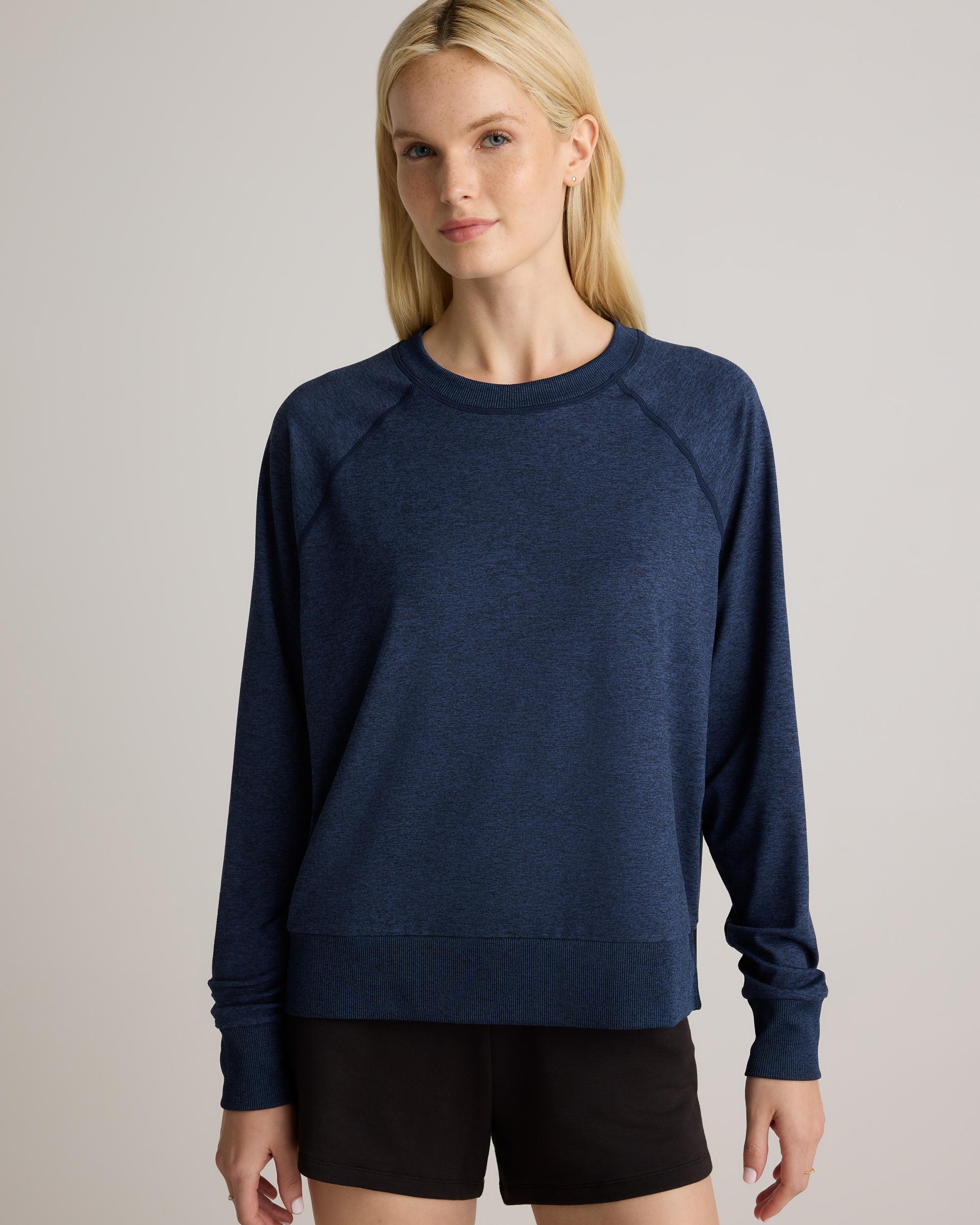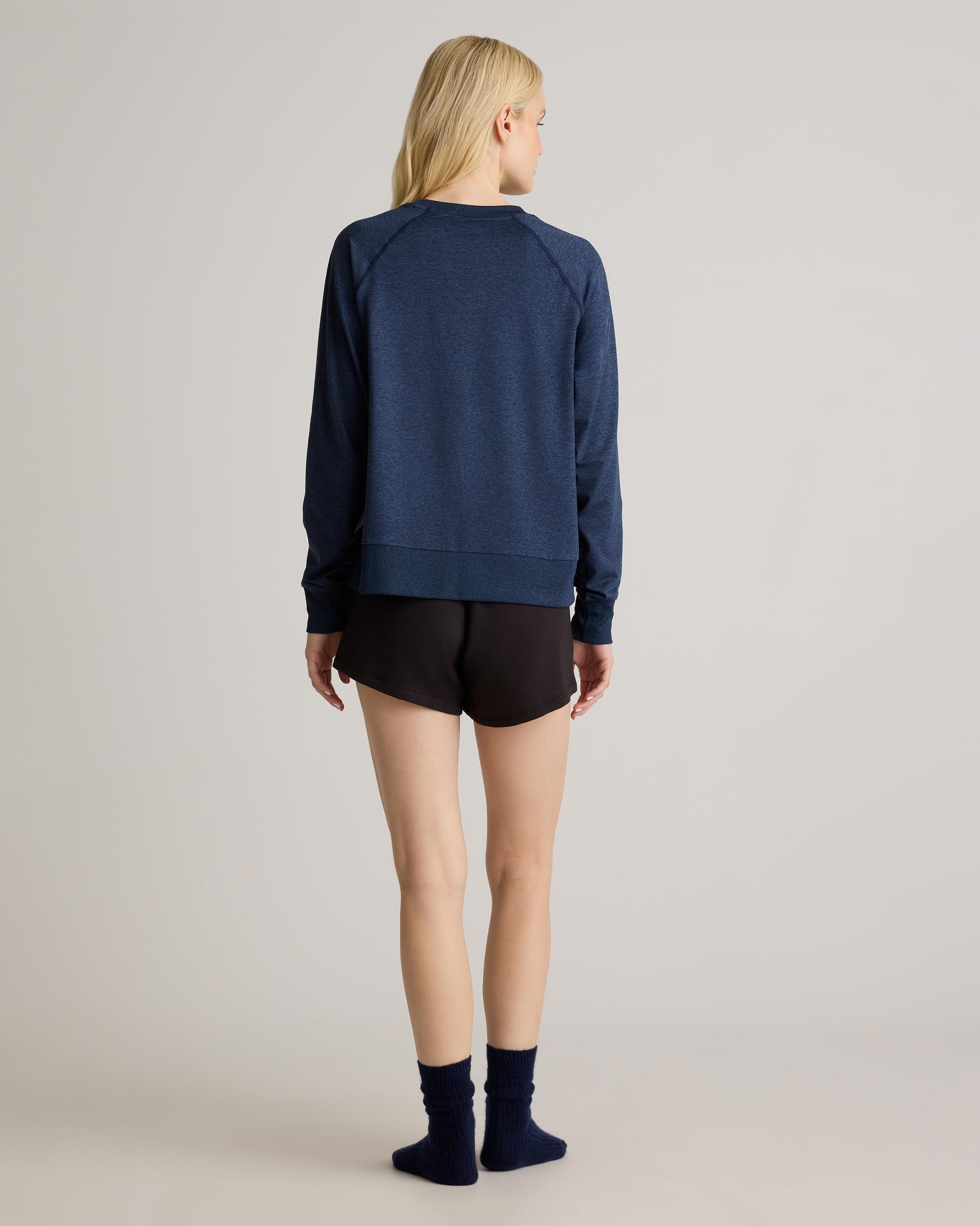 When comfort and performance is the priority, grab this Flowknit Pullover Crew. Perfect for staying cozy to and from your favorite workout class, this pullover offers quick-drying and moisture-wicking properties, helping to keep you dry even when you're most active. Its fabric also helps keeps you feeling fresh, while the 4-way stretch gives extra flex. | Quince | Women's Flowknit Pullover Crew Neck Alpaca Sweater in Heather Navy, Size Small, Recycled Polyester / Spandex