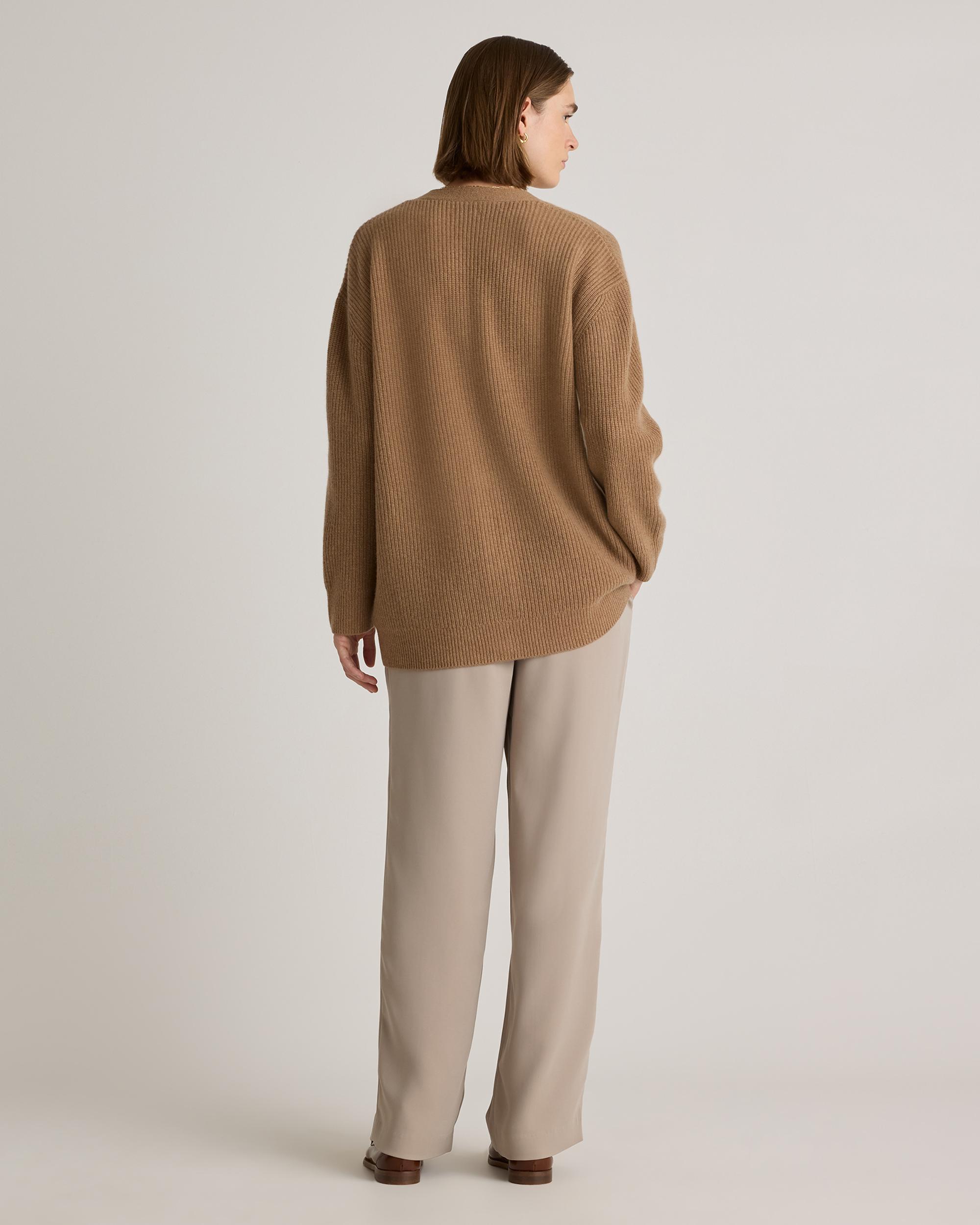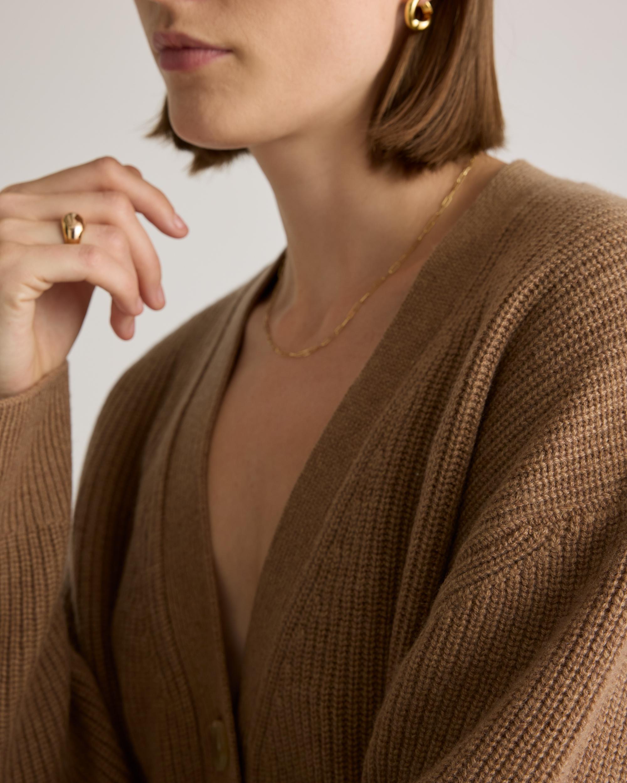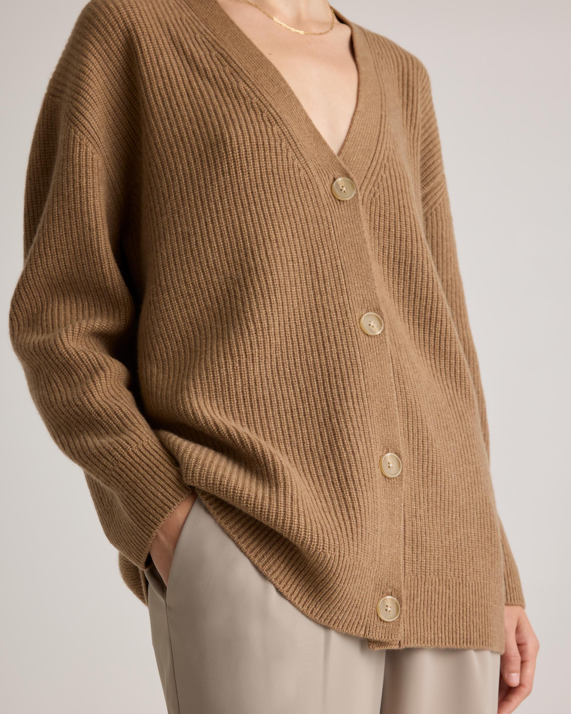 Our cashmere boyfriend cardigan perfectly blends comfort and style. Crafted from irresistibly soft Grade-A Mongolian cashmere, it's now smoother, more durable, and more substantial than ever. We've refined the fit to be true to size, thanks to your feedback. With allover fisherman rib detailing, it brings a subtle coastal charm. Explore what makes it special and how to care for it in our Cashmere 101 guide. Also offered in sizes 1X-3X. | Quince | Women's Mongolian Cashmere OverSized Boyfriend Cardigan Sweater in Teak, Size Large