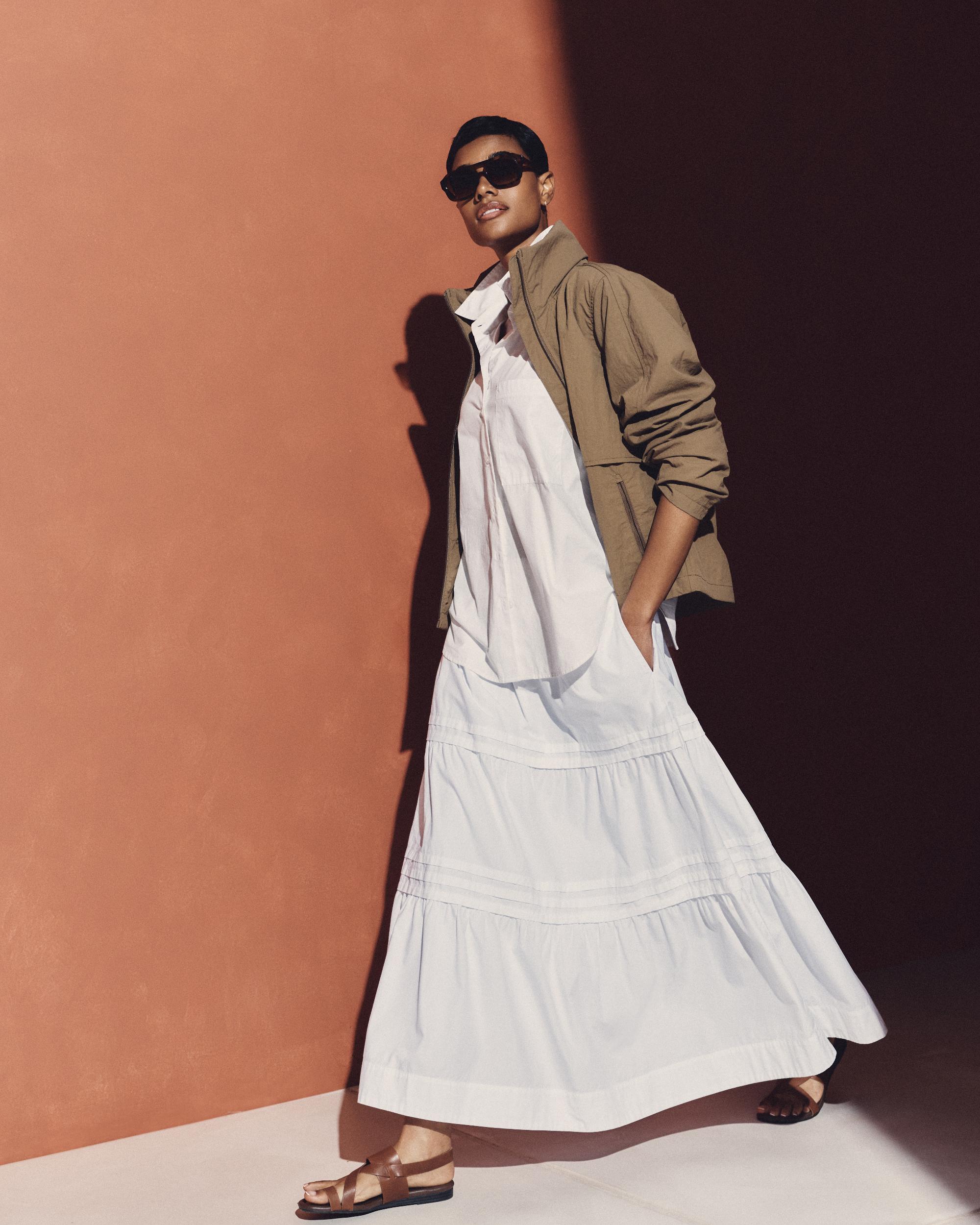 Go with the flow in our 100% Organic Cotton Tiered Maxi Skirt. Crafted with care from crisp organic cotton poplin, this effortless skirt is a perfect blend of softness and structure. With a timeless tiered silhouette, a comfy wide elastic waistband, and, yes, pockets, we covered all the details to create a go-to style you're sure to love. | Quince | Women's Poplin Tiered Maxi Skirt in Classic White, Size Medium, Organic Cotton