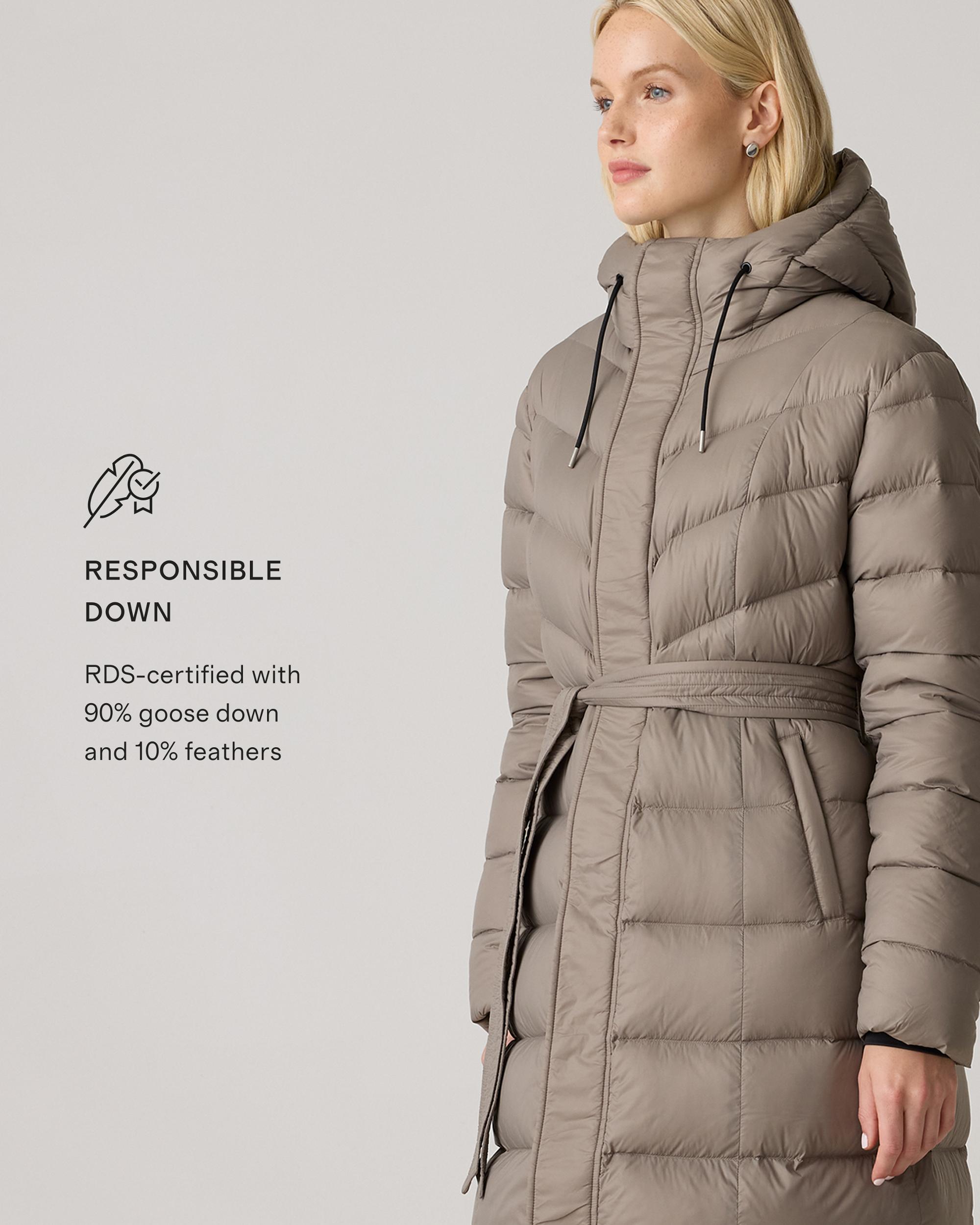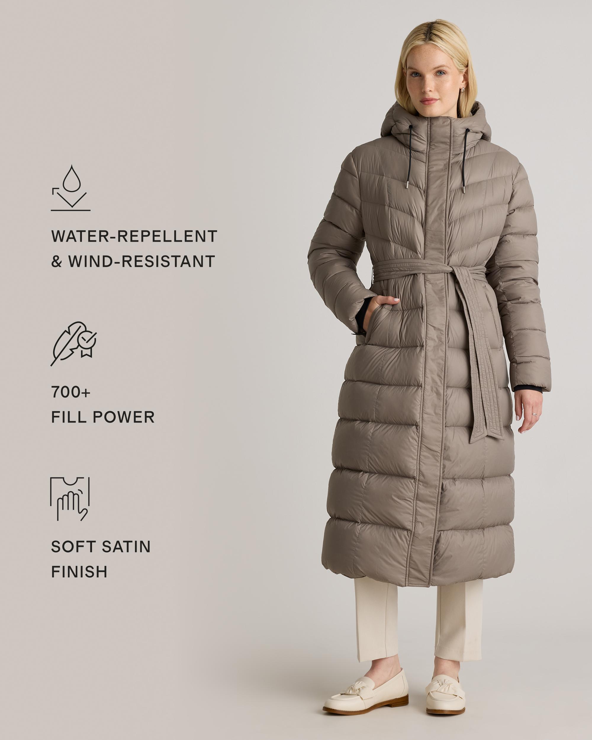 Wrap yourself in ultimate comfort with our Responsible Down Belted Puffer Maxi Coat, offering full-body coverage while maintaining a modern, polished aesthetic. This coat is crafted from 100% recycled nylon that is both water-repellent and wind-resistant and features a soft satin finish with a subtly peached handfeel. The sleek silhouette is enhanced by a removable belt, allowing you to cinch the waist for a flattering fit or wear it loose for a relaxed look. Bonus: Our down products are sourced responsibly to ensure best practices in animal welfare. Meet your new winter wardrobe essential and enjoy it for years to come. | Quince | Women's Responsible Down Belted Puffer Maxi Coat in Stone Taupe, Size Medium, Recycled Polyester