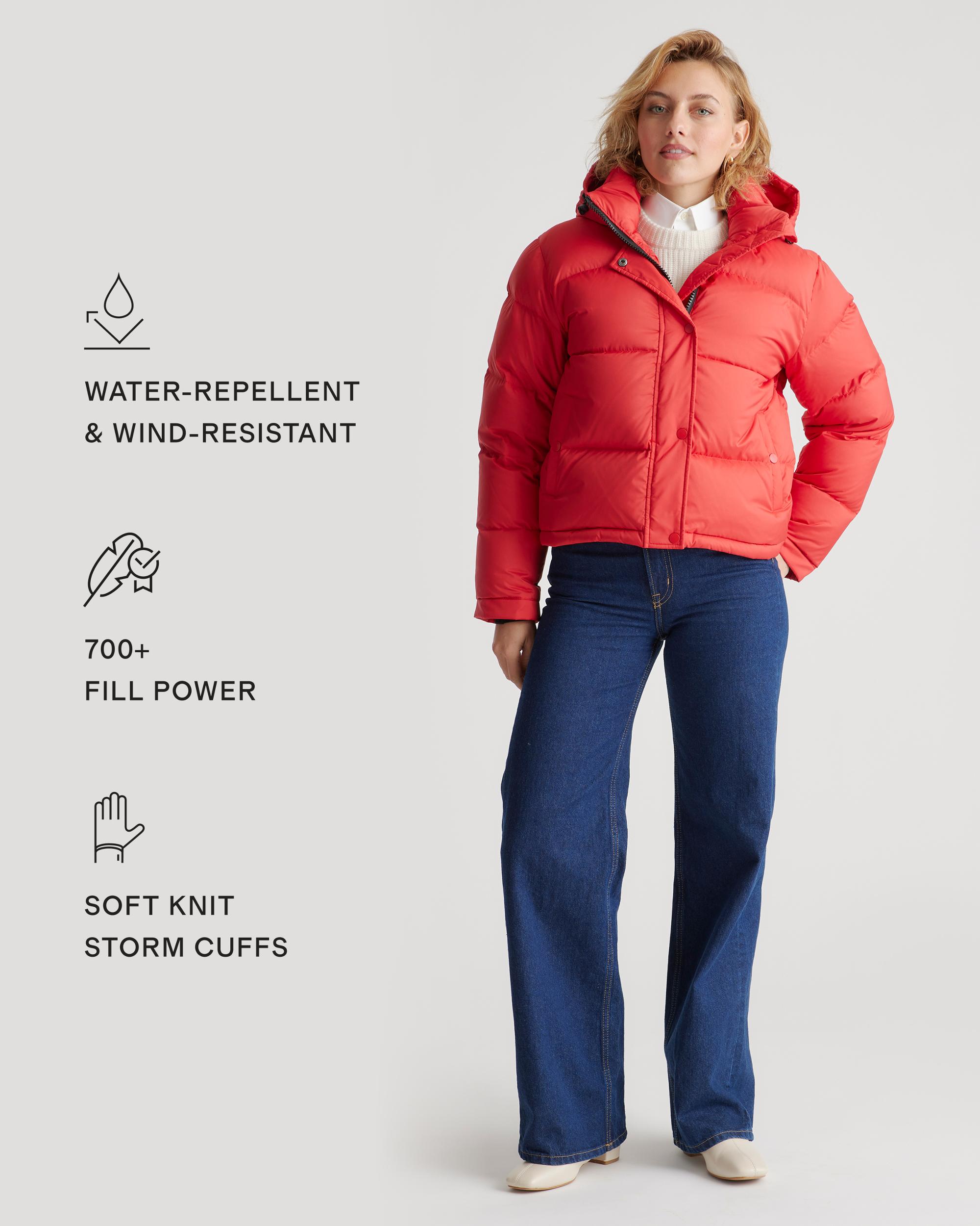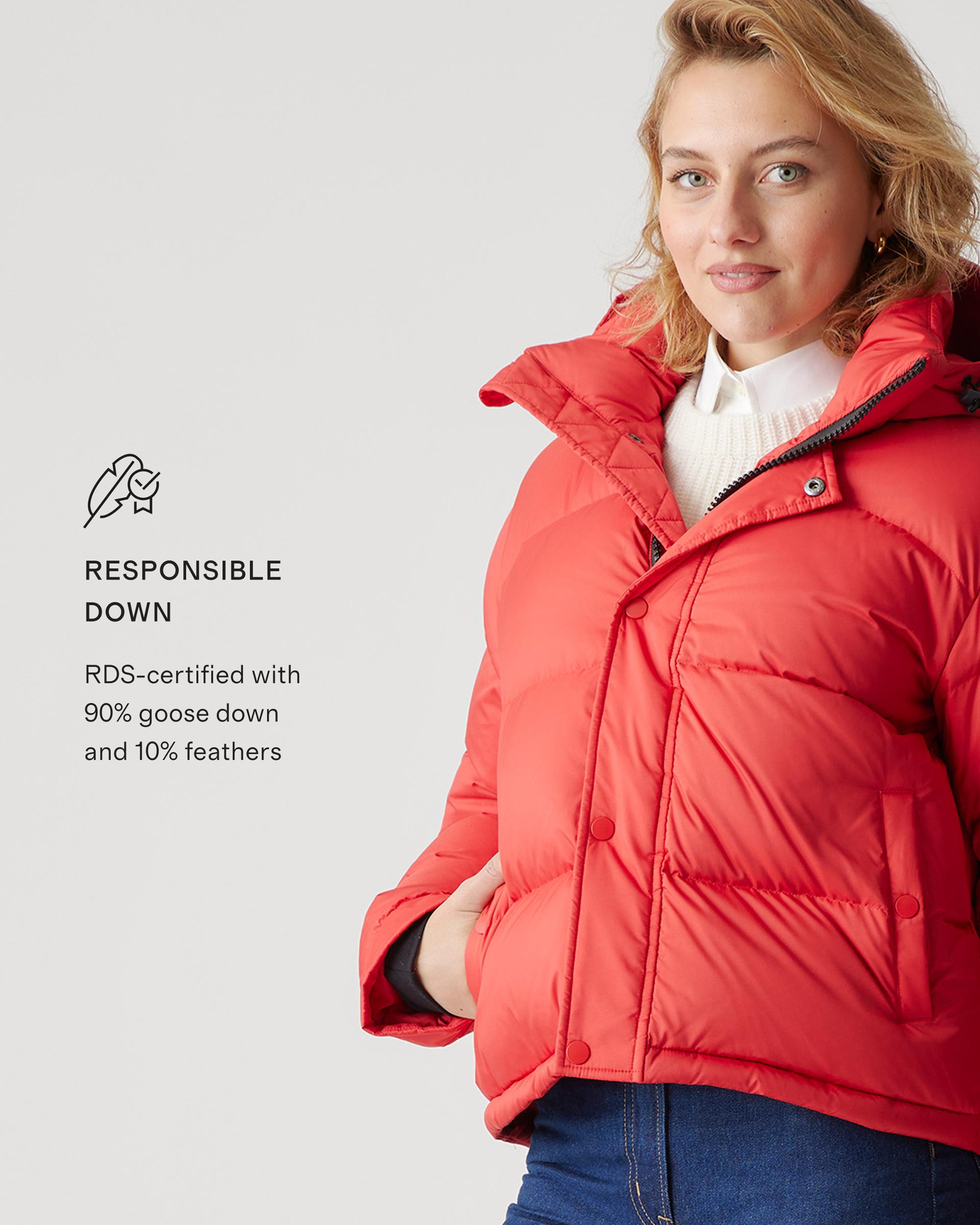 The perfect jacket for your cold-weather adventures is here: our Responsible Down Cropped Puffer Jacket. You'll be warm all winter long in even the coldest of climates, and the water-repellent and wind-resistant fabric make this jacket perfect for any winter activity. Plus, our down products are sourced responsibly to ensure best practices in animal welfare. Meet your new winter wardrobe staple for years to come. | Quince | Women's Responsible Down Cropped Puffer Jacket in Red, Size XL, Recycled Polyester