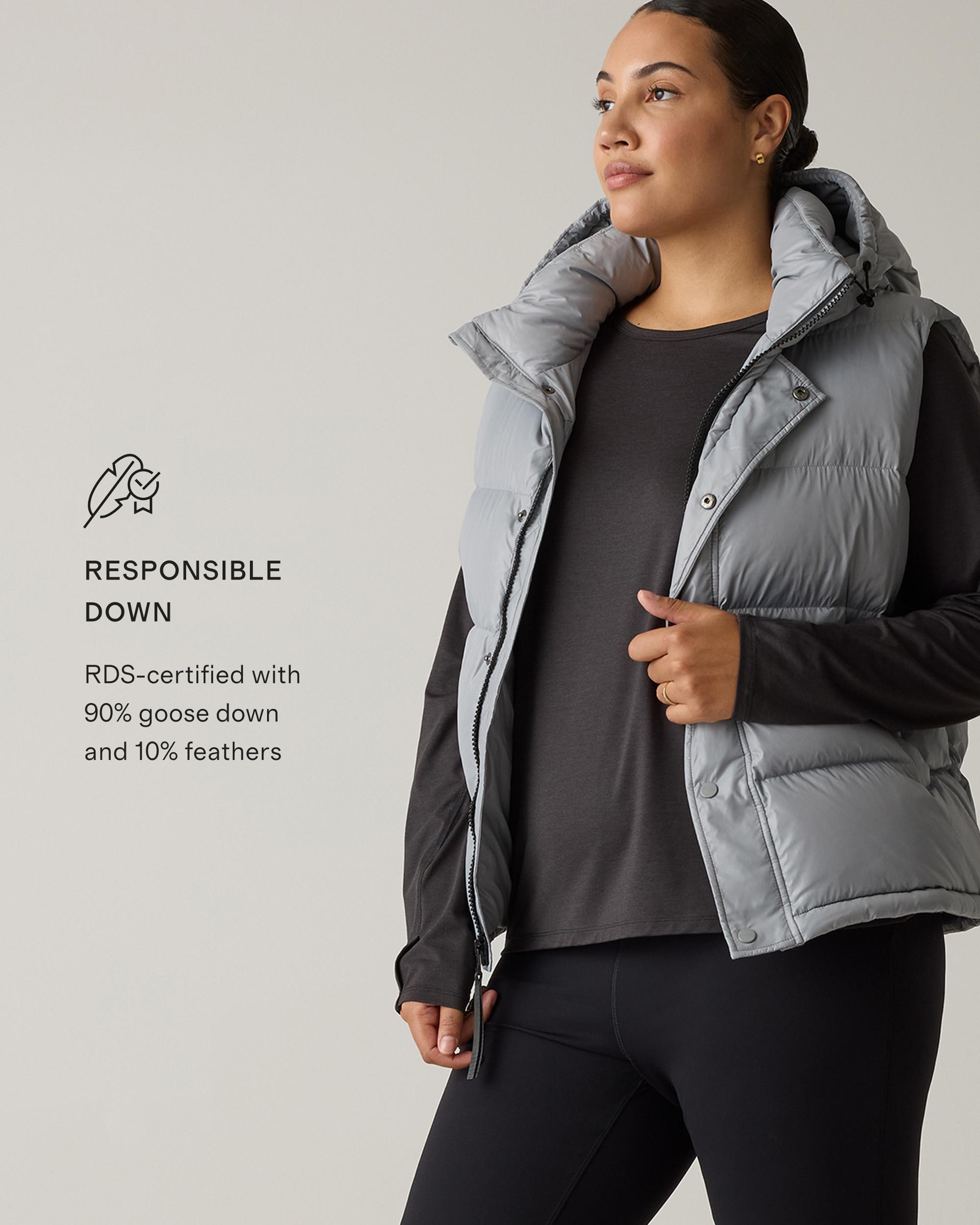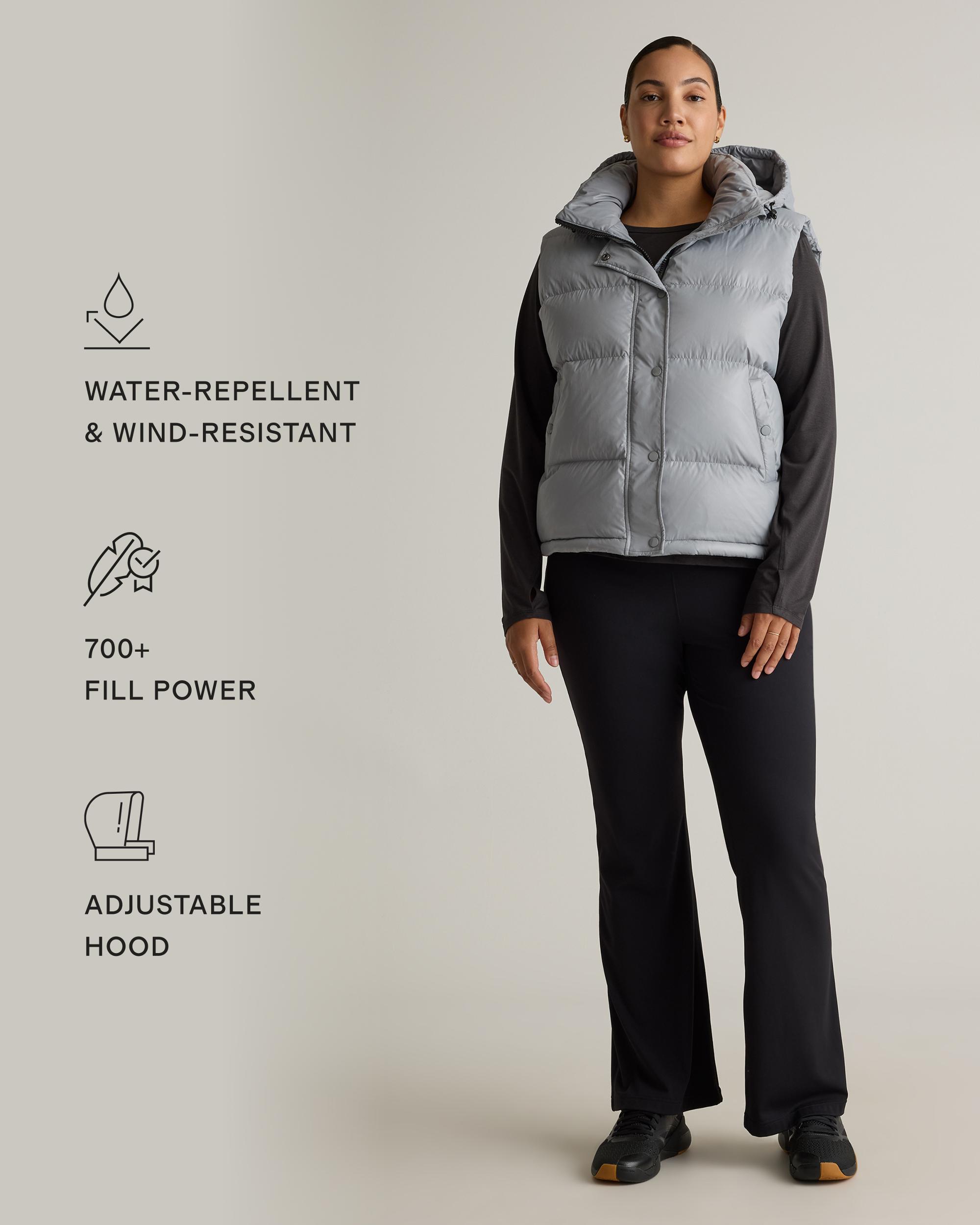 Designed for easy layering and extra warmth, our Responsible Down Puffer Vest is your new go-to for cold-weather adventures. With water-repellent and wind-resistant fabric, this vest will keep you warm and protected in all types of weather. The classic fit follows the natural contour of your body with extra room for layering, so you can wear it as a layering piece in cooler temperatures, or on its own as the temperature rises. Plus, our down products are sourced responsibly to ensure best practices in animal welfare. This vest will quickly become your new favorite outerwear piece that you'll wear everywhere, with everything, for years to come. | Quince | Women's Responsible Down Puffer Vest in Feather Grey, Size XS, Recycled Polyester