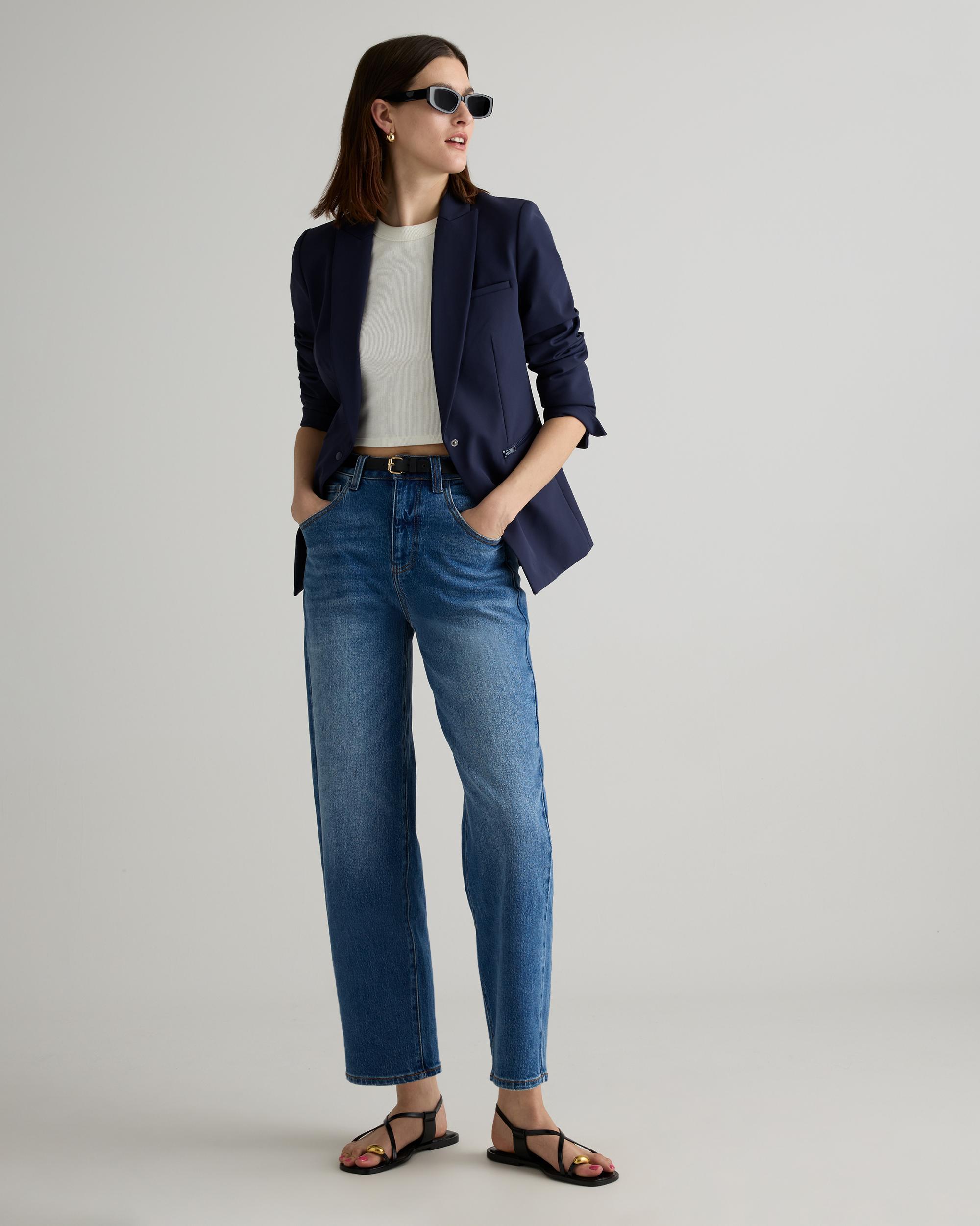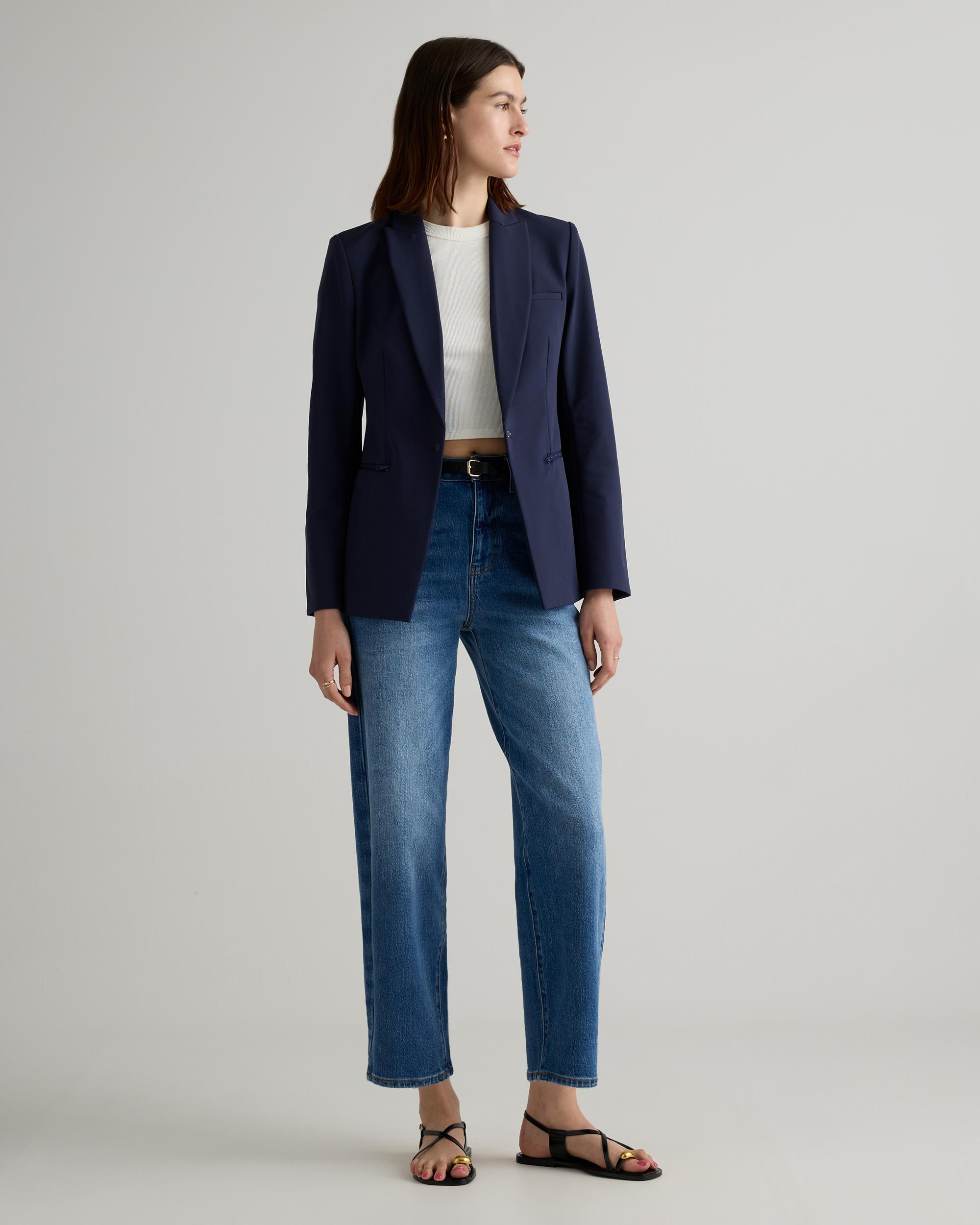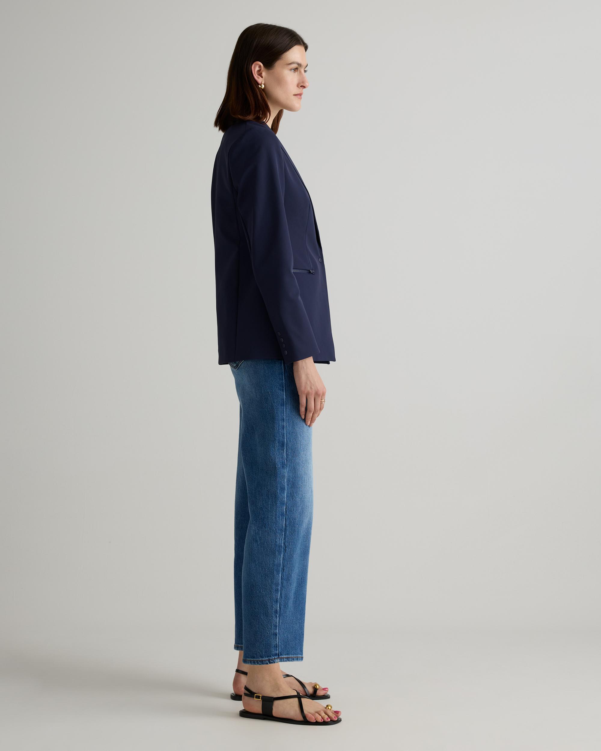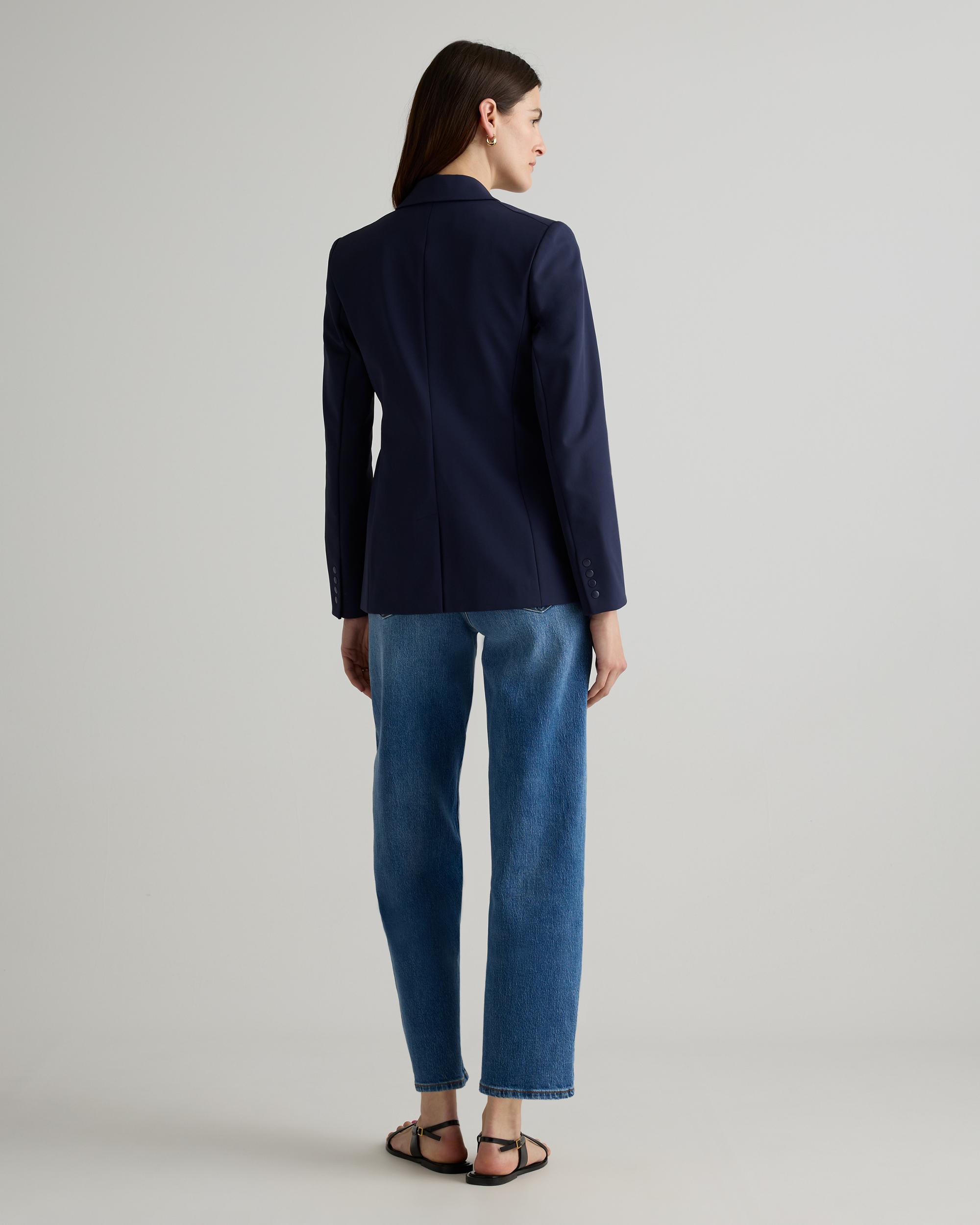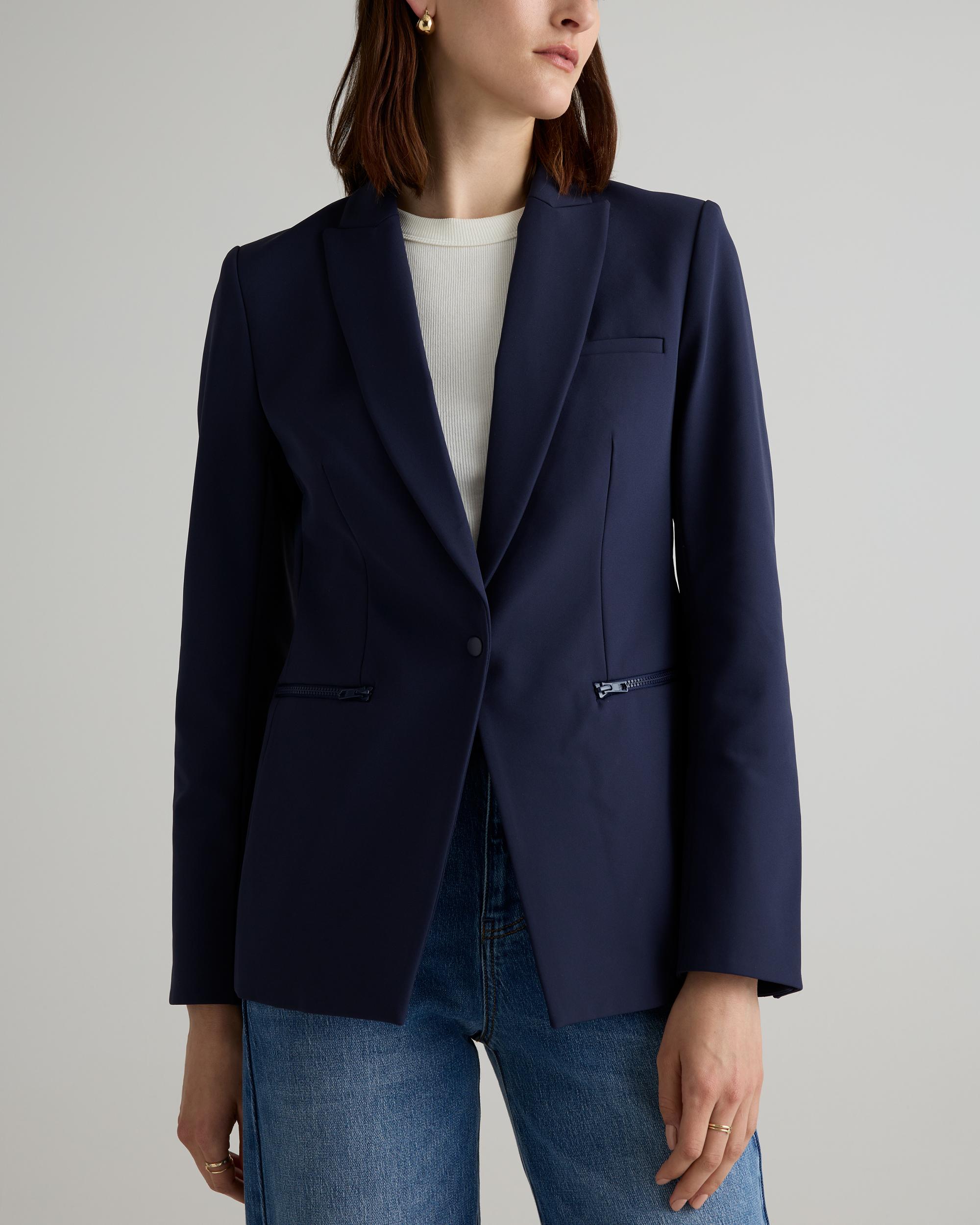 Crafted from durable, recycled stretch nylon fabric, this convertible blazer effortlessly combines style and versatility. The zip pockets and single button snap closure add a modern touch. Wear it solo for a sleek look or effortlessly layer with an insert for added flair. Choose from our selection of three inserts to personalize your style: 100% Mongolian Cashmere Ribbed Collar Blazer Insert, 100% Mongolian Cashmere Hoodie Blazer Insert, or Organic Heavyweight Fleece Hoodie Blazer Insert. | Quince | Women's Scuba Single Breasted Convertible Blazer in Deep Navy, Size XS, Nylon