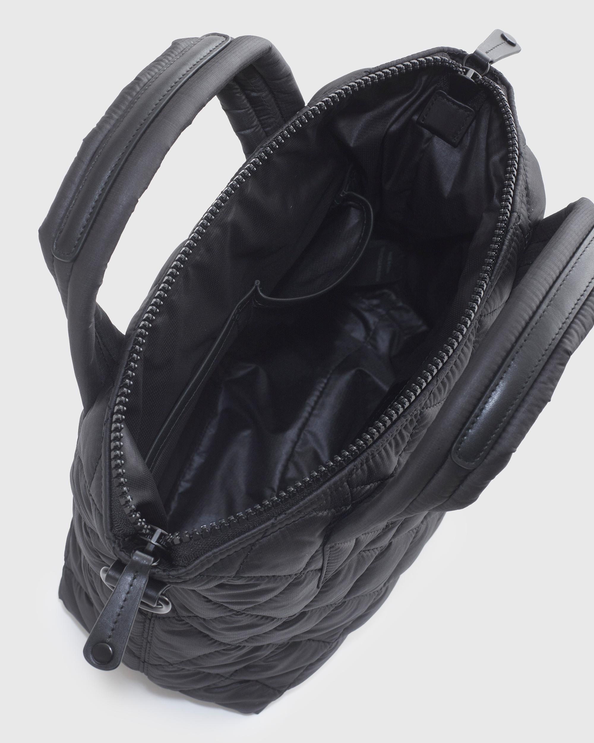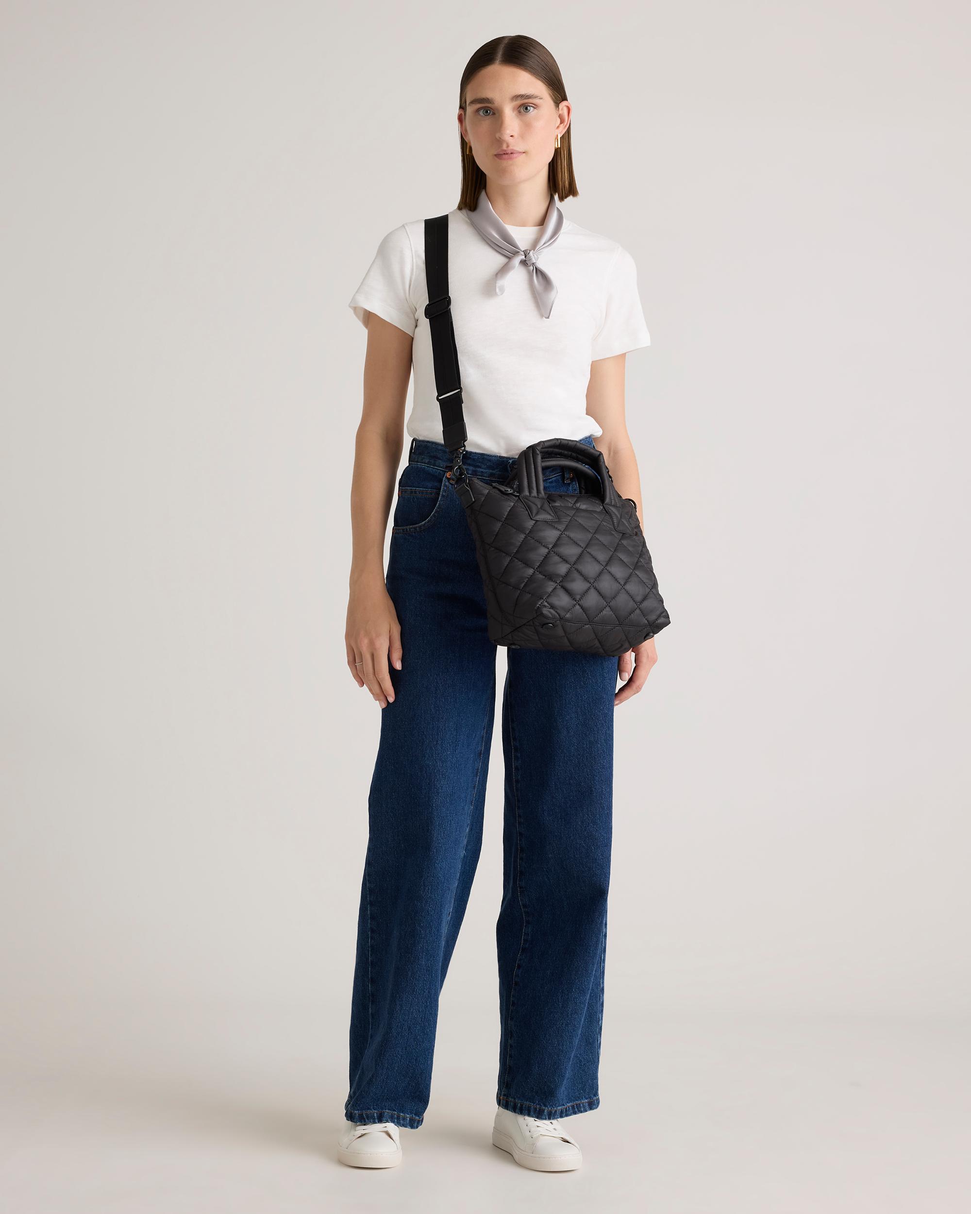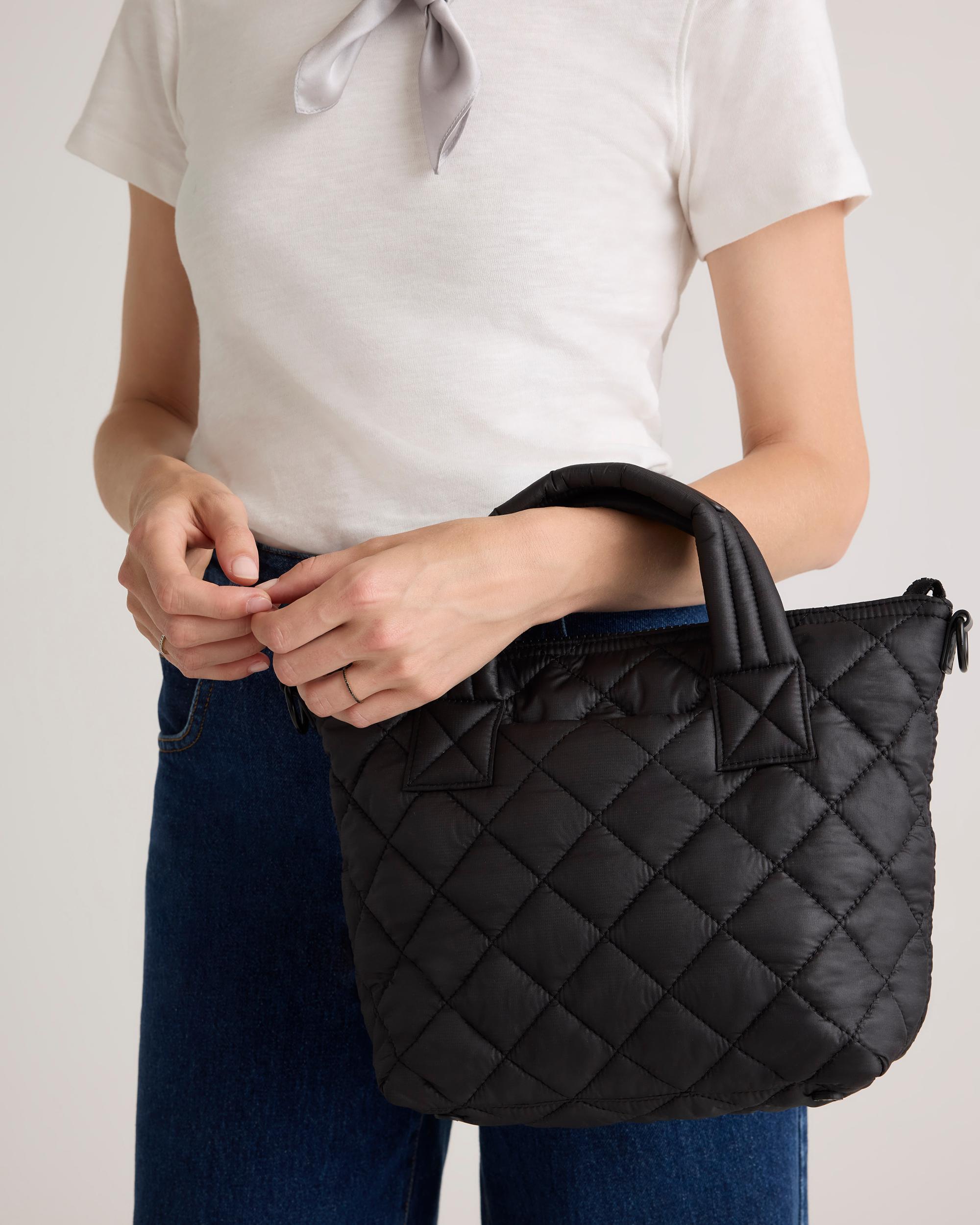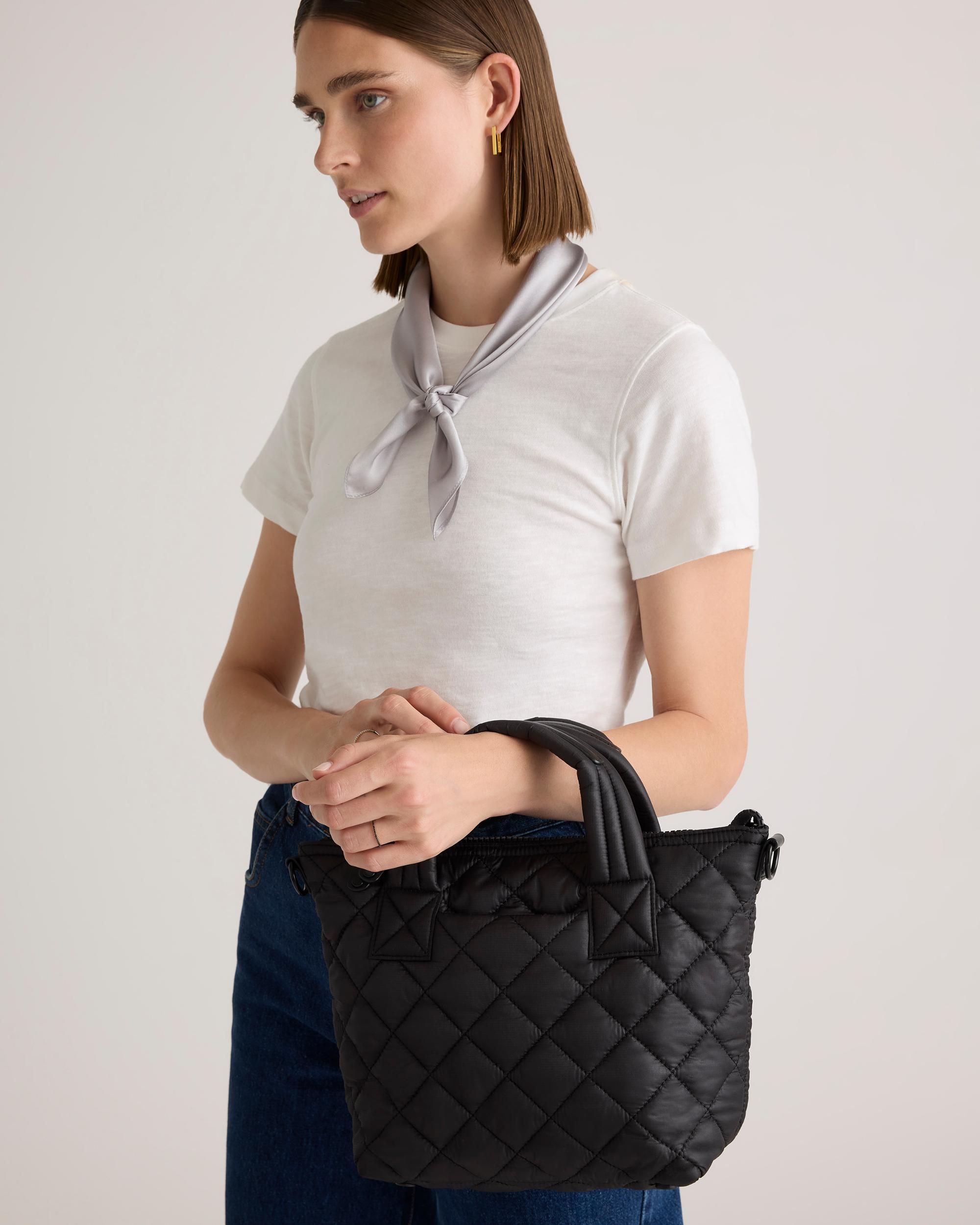 Meet your new daily sidekick. Our Transit Quilted Small Crossbody Tote has the texture of your favorite puffer, in a compact crossbody size perfect for carrying one-the-go essentials. Featuring convenient interior and exterior slip pockets and 1 interior zip pocket. Bonus: its water-resistant material is made from recycled materials and keeps plastic bottles out of oceans and landfills. | Quince | Women's Transit Quilted Small Crossbody Tote in Black, Recycled Polyester