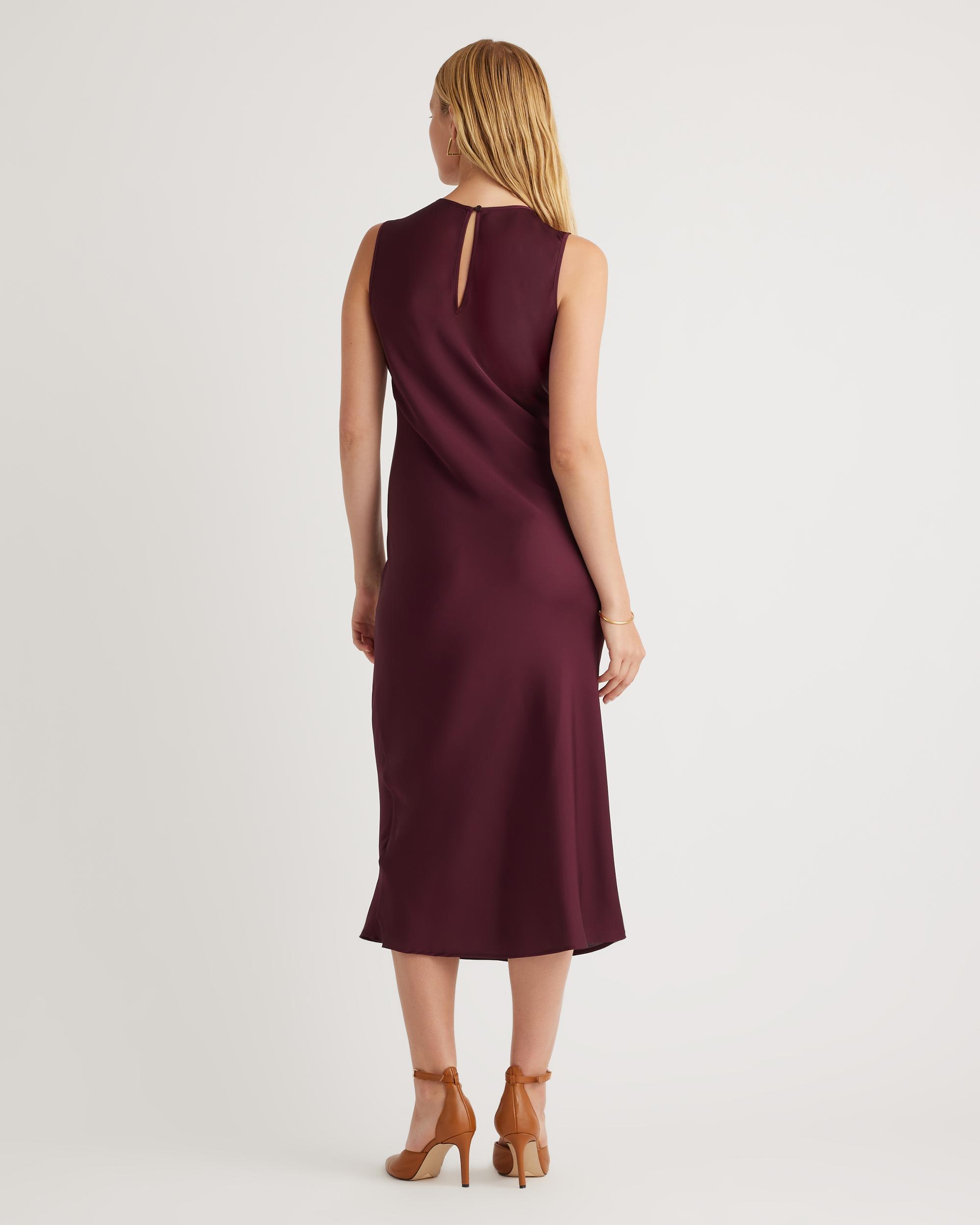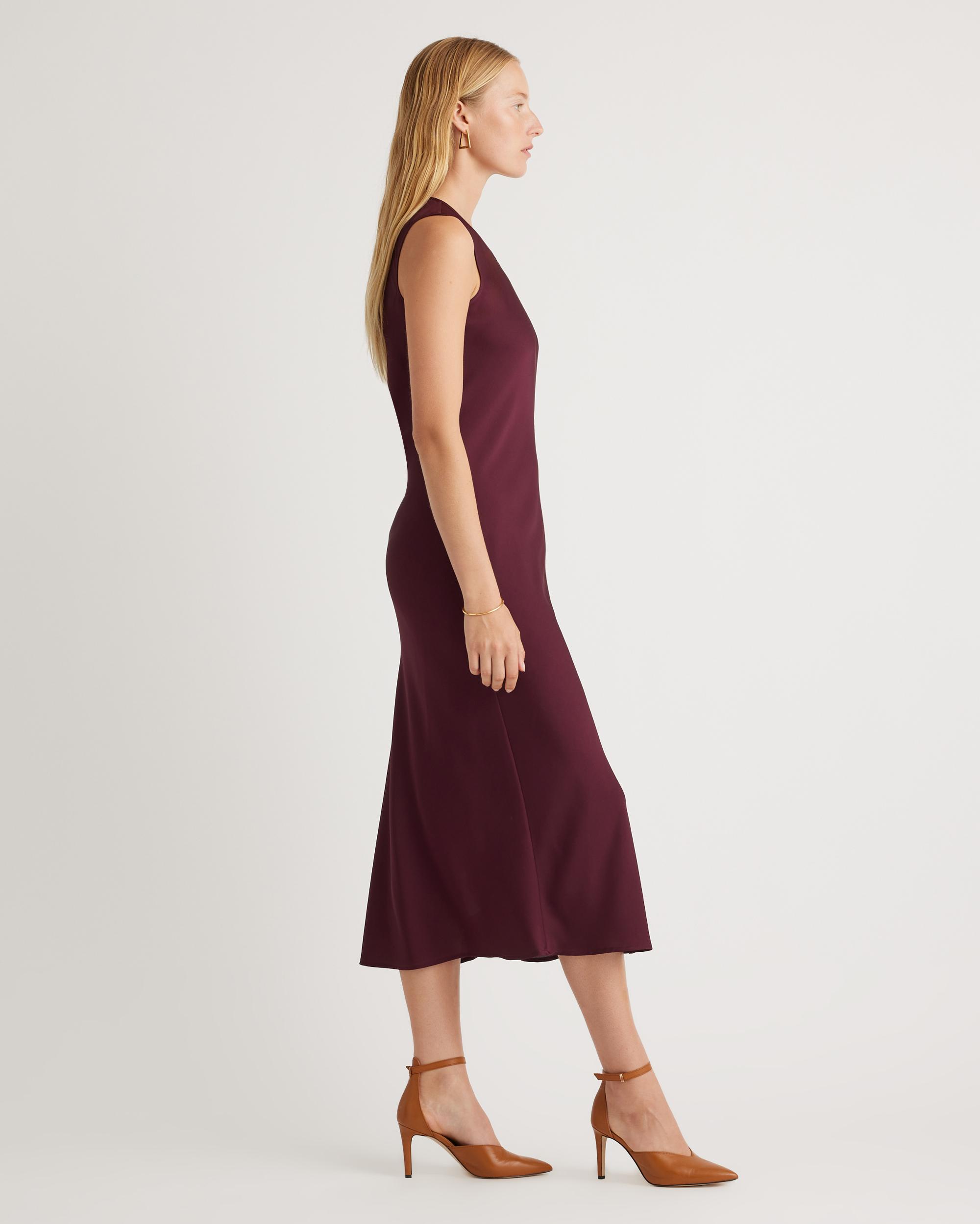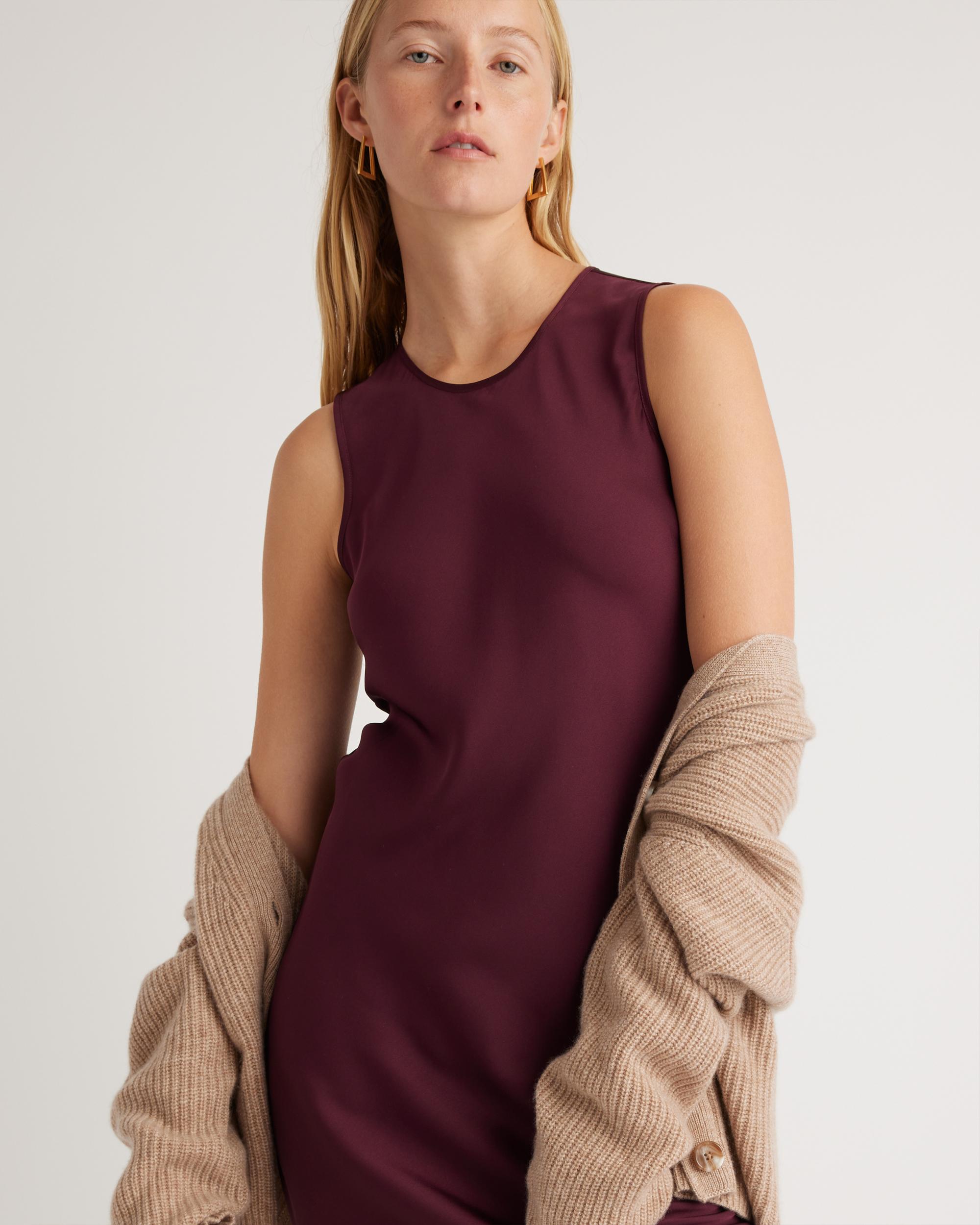 Got bra straps? We’ve got you. A higher tank neckline with back button closure makes this sleeveless midi dress friendly to all bras. In premium mulberry silk with a hint of stretch, the bias cut skims the body in an incredibly flattering way. And like all our silk, it’s washable. As a bonus, silk fiber contains 18 kinds of amino acids that make it amazing for skin nourishment, hypo-allergenic, and naturally thermoregulating to help maintain body temperature. | Quince | Women's Washable Stretch Silk Tank Top Midi Dress in Wine Tasting Red, Size Small