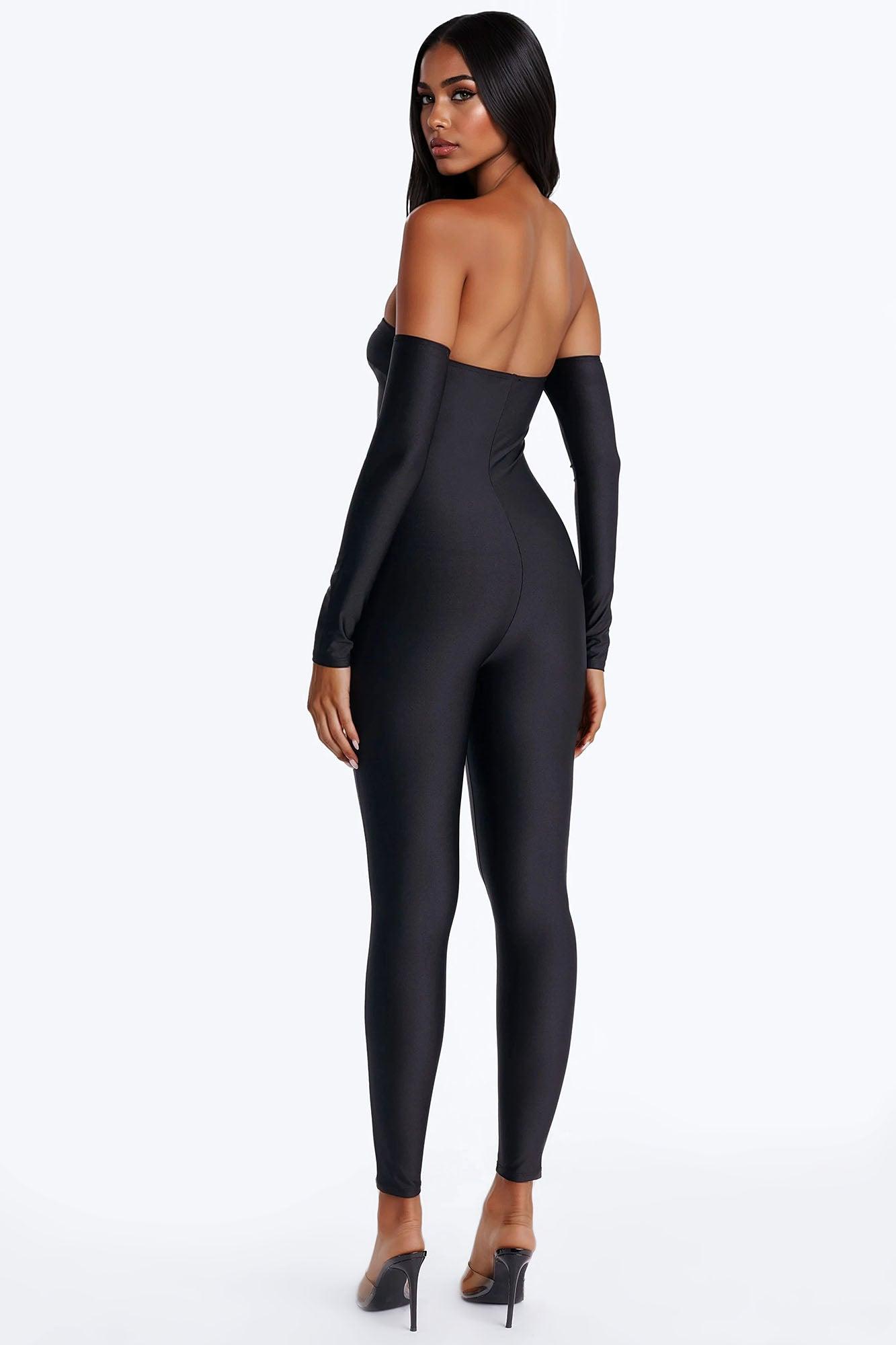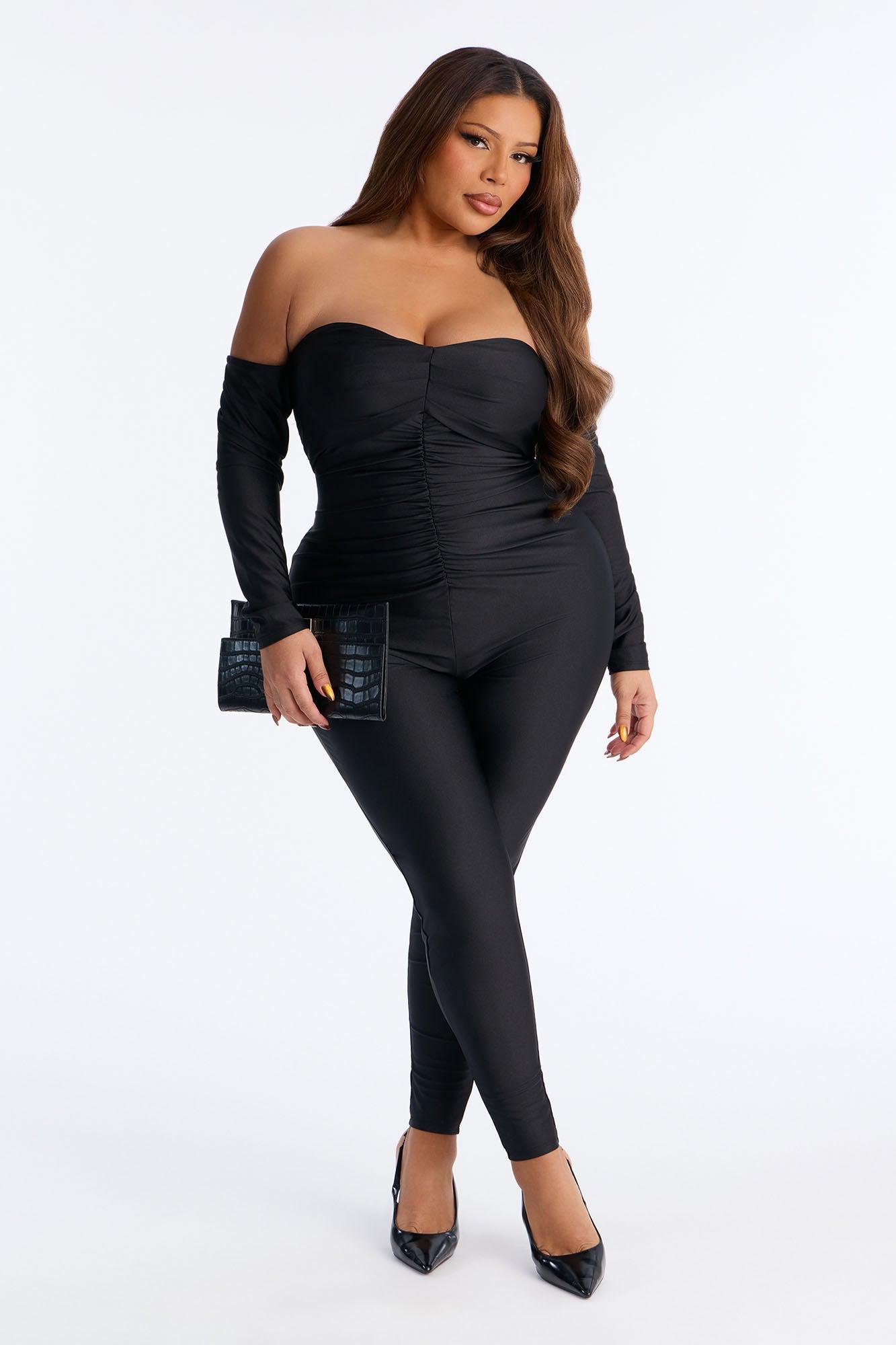 Available In Black. Jumpsuit Stretch Long Sleeve Off Shoulder Straight Neck Skinny Leg 29" Inseam 82% Polyester 18% spandex Imported