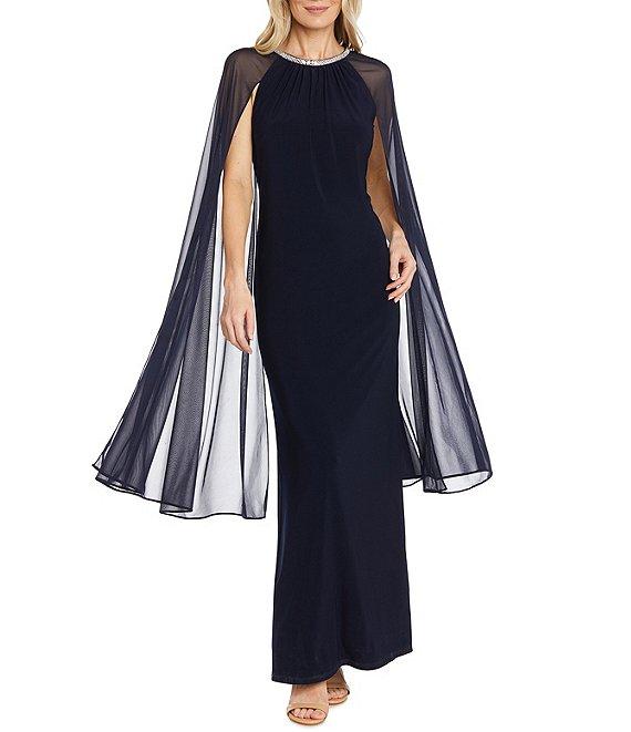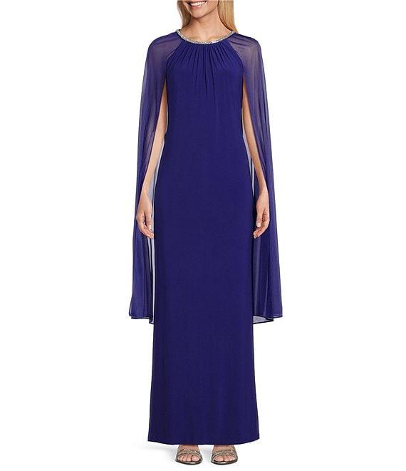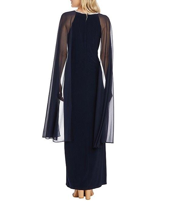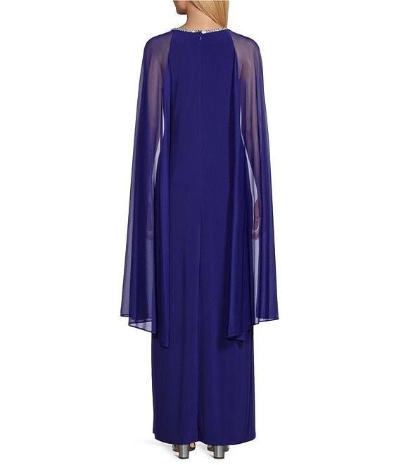 From R & M Richards, this dress features:Beaded crew necklineSleeveless with a capeSheath silhouetteLinedZip back closureApprox. 59" in length from high point shoulderPolyester/spandexHand washImported.