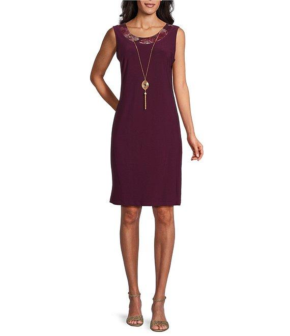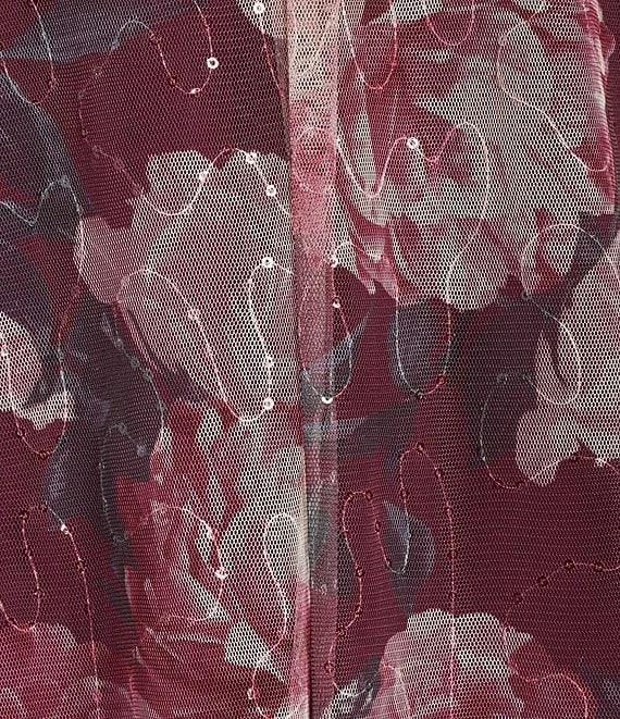 From R & M Richards, this dress features: Jacket: Embroidered clear sequin fabrication Open neckline 3/4 sleeves Duster jacket silhouette Floral print Open front; no closure Approx. 34" in length Polyester Hand wash Dress: Solid ITY fabrication Crew neckline Sleeveless Tank shift silhouette Printed neckline Approx. 39" in length Polyester/spandex Hands wash Imported.