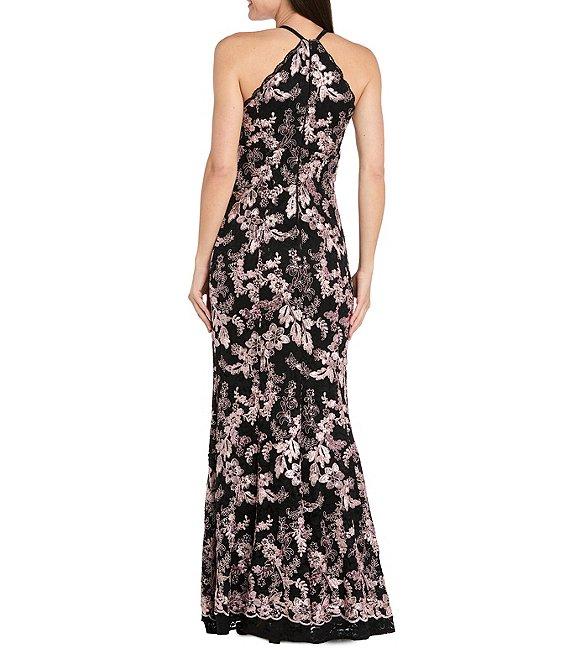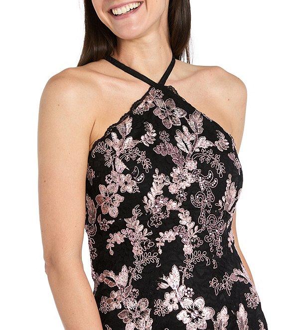 From R & M Richards, this dress features: Embroidered sequin cord stretch lace fabrication Criss-cross halter neckline Sleeveless Mermaid silhouette Lined Center back zipper closure Approx. 60" in length Nylon/rayon/spandex Hand wash/dry flat Imported.