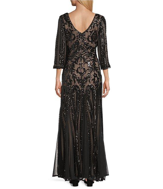 From R & M Richards, this dress features: Embroidered sequin power mesh fabrication V-neckline 3/4 sleeves Contrast lining Beaded detail Godet skirt Center back zipper closure Approx. 59" in length Polyester/spandex Hand wash/dry flat Imported.