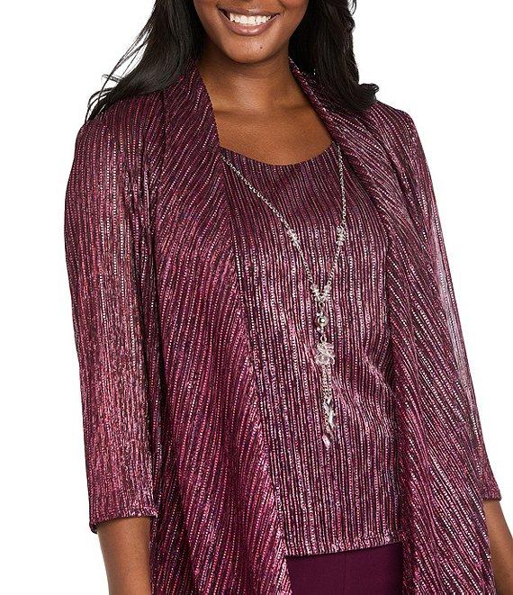 From R & M Richards, this 3-piece set features: Jacket: Festival with hologram sequin trens fabrication Open front construction 3/4 sleeves Pull on construction Approx. 38" in length Polyester/metallic Hand wash Tank: Festival with hologram sequin trens fabrication Round neckline Sleeveless Lined Pullover construction Approx. 25" in length Polyester/metallic Hand wash Pants: Straight leg pants Pull on construction Approx. 31" in length Polyester/spandex Hand wash Imported.