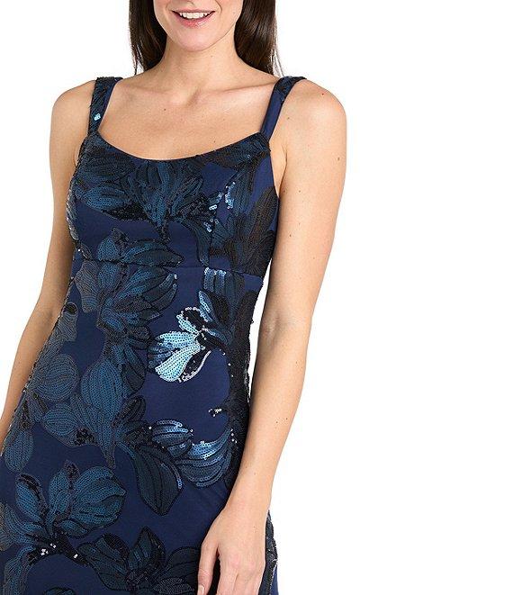 From R & M Richards Petite, this dress features: Sequin power mesh fabrication Sheath silhouette Square neckline Sleeveless Floral pattern Zip back closure Approx. 58" length Polyester/spandex Hand wash Imported.