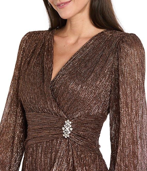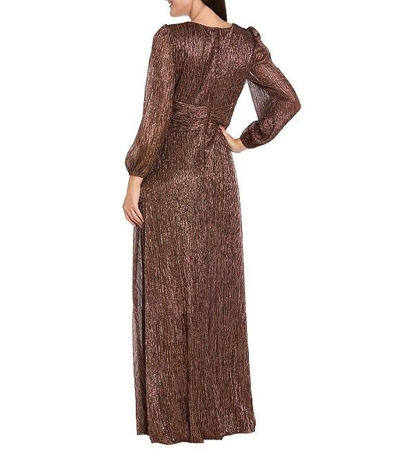 R & M Richards Petite Size Metiallic Crinkle V-Neck Long Sleeve Side Draped Slit Pleated Dress