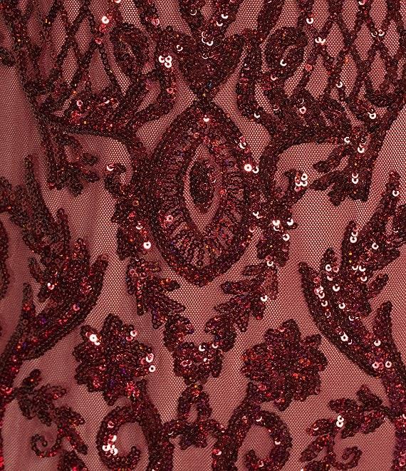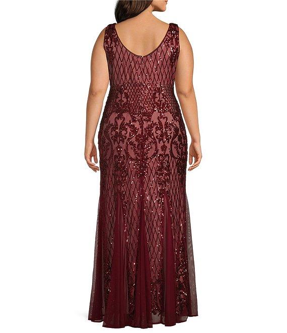From R & M Richards Plus, this dress features: Sequin mesh fabrication Mermaid silhouette V-neckline Sleeveless Beaded detail Fully lined Flutter hemline Center back zip closure Approx. 61" length Polyester/spandex Hand wash Imported.