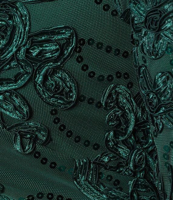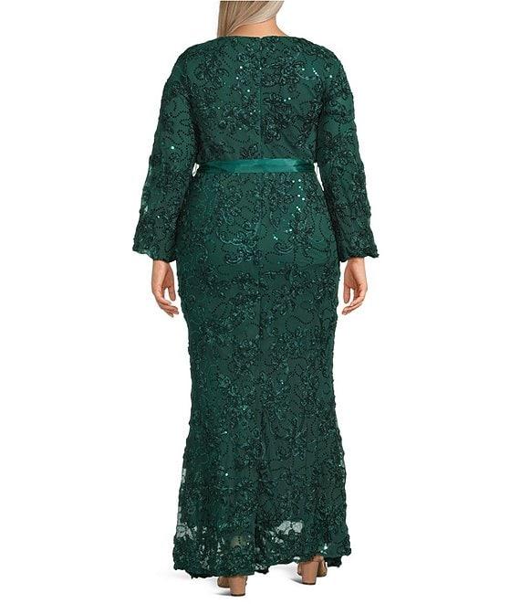 From R&M Richards Plus, this dress features: Power mesh fabrication Embroidered soutache sequin detail Round neckline 3/4 balloon sleeves Tie sash Lined Center back zipper closure Approx. 62" in length Polyester/spandex Hand wash/dry flat Imported.