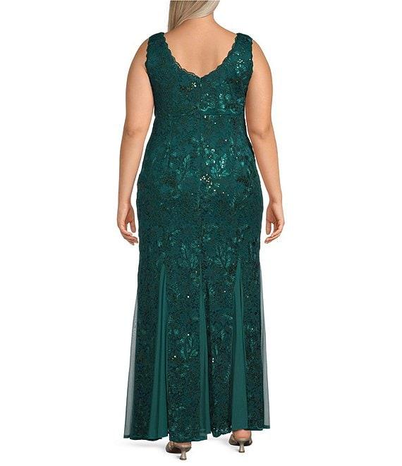 From R & M Richards Plus, this dress features: Cord stretch lace fabrication V-neckline Sleeveless Embroidered sequin floral print Lined Mesh godet skirt Center back zipper closure Approx. 61" in length Nylon/rayon/spandex Hand wash/lay flat Imported.