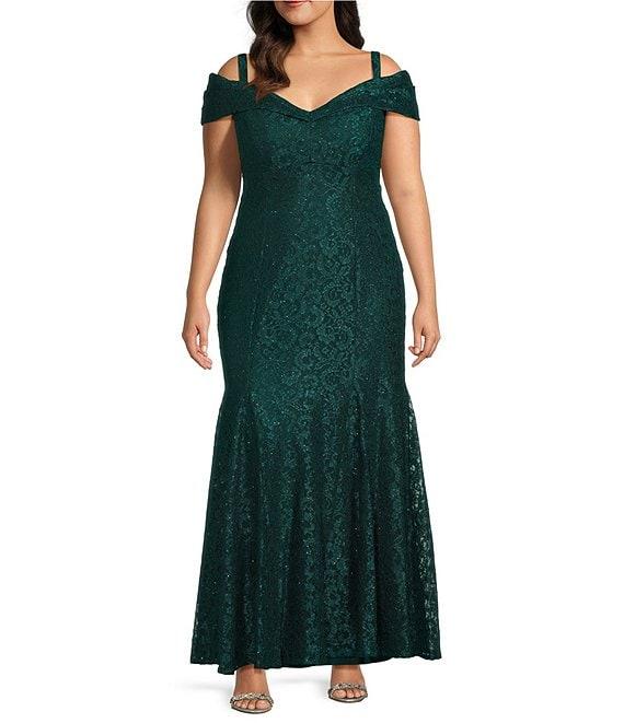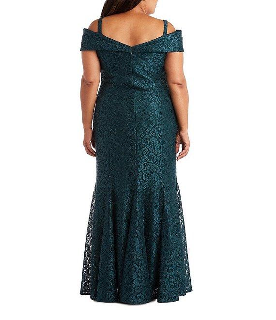 From R & M Richards Plus, this gown features: Stretch tonal lace fabrication Mermaid silhouette Off-the-shoulder neckline Cold shoulder cap sleeves Godet skirt hem Back zipper closure Approx. 62" length Polyester/spandex Hand wash Imported.