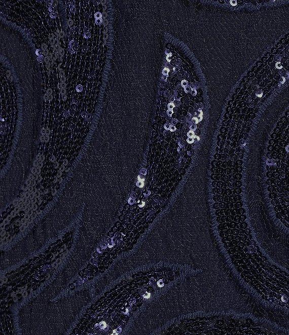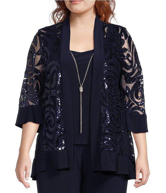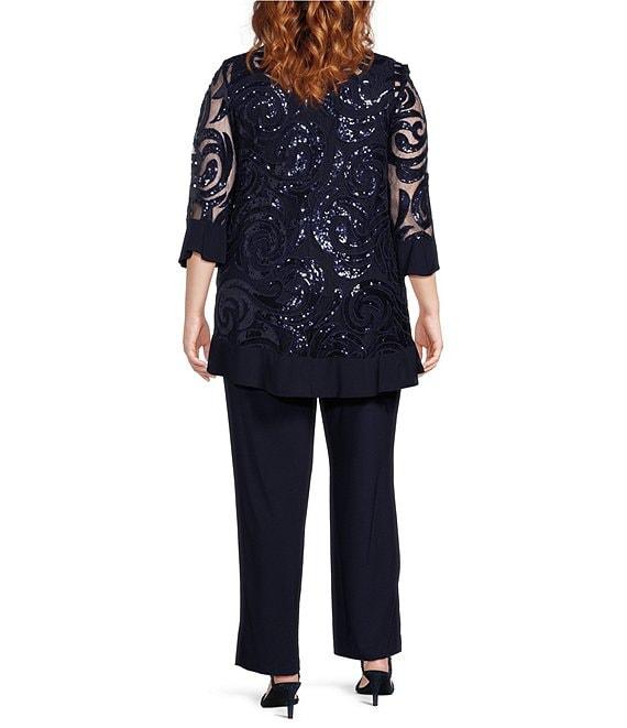 From R & M Richards Plus, this 2-piece pant set features: Top/Jacket: sheer illusion swirl sequin jacket open front 3/4 sleeves with bell detail attached jersey knit tank scoop neckline detachable necklace pull-on styling Approx. 35" length polyester/spandex Hand wash/dry flat Pants: jersey knit fabrication mid rise elastic waistband straight hemline pull-on construction approx. 31" inseam Polyester/spandex hand wash Imported.