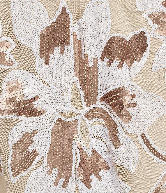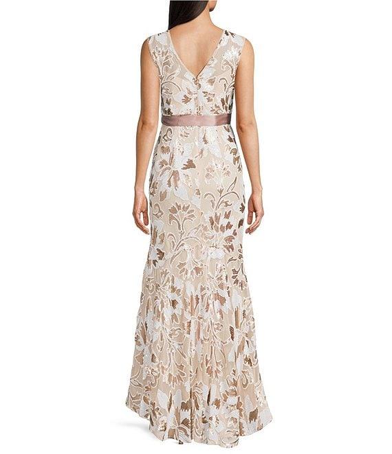 From R & M Richards, this dress features: Embroidered sequin power mesh fabrication Round neckline Sleeveless Floral print 2 tone print Satin tie sash Mermaid silhouette Lined Center back zipper closure Approx. 63" in length Polyester/spandex Hand wash Imported.