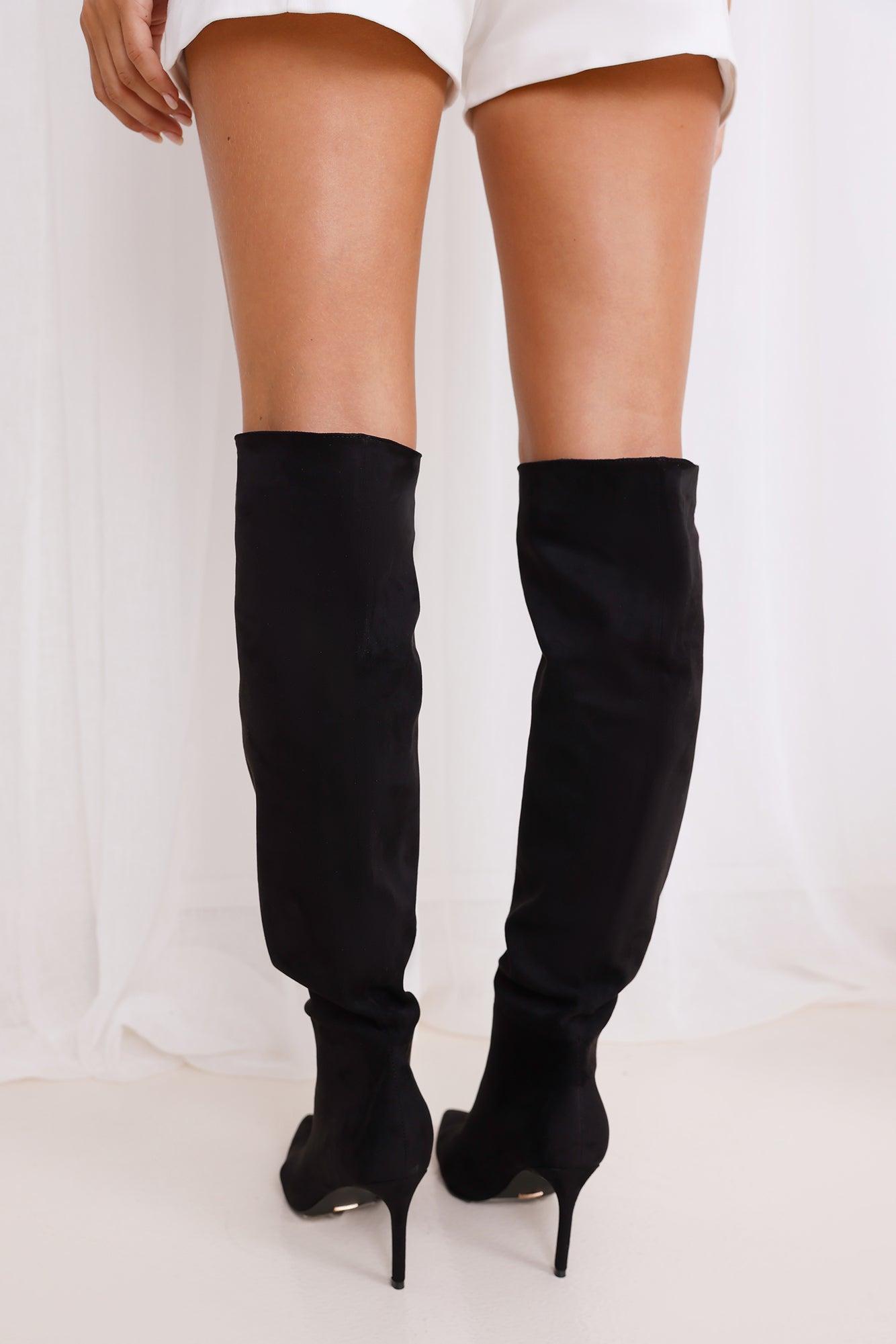 Mid stiletto heel. Closed pointed toe. Long upper designed to be slouched. Effortless pull on design. Synthetic upper, lining and outsole. Heel height: 8.5cm. Size 6 is EU 37. The knee high boots of the season. The BILLINI Raisa Boots feature a mid stiletto heel, a closed pointed toe and a long upper that has a slouched design. Style with your 'fits in the cooler months for a chic effect.