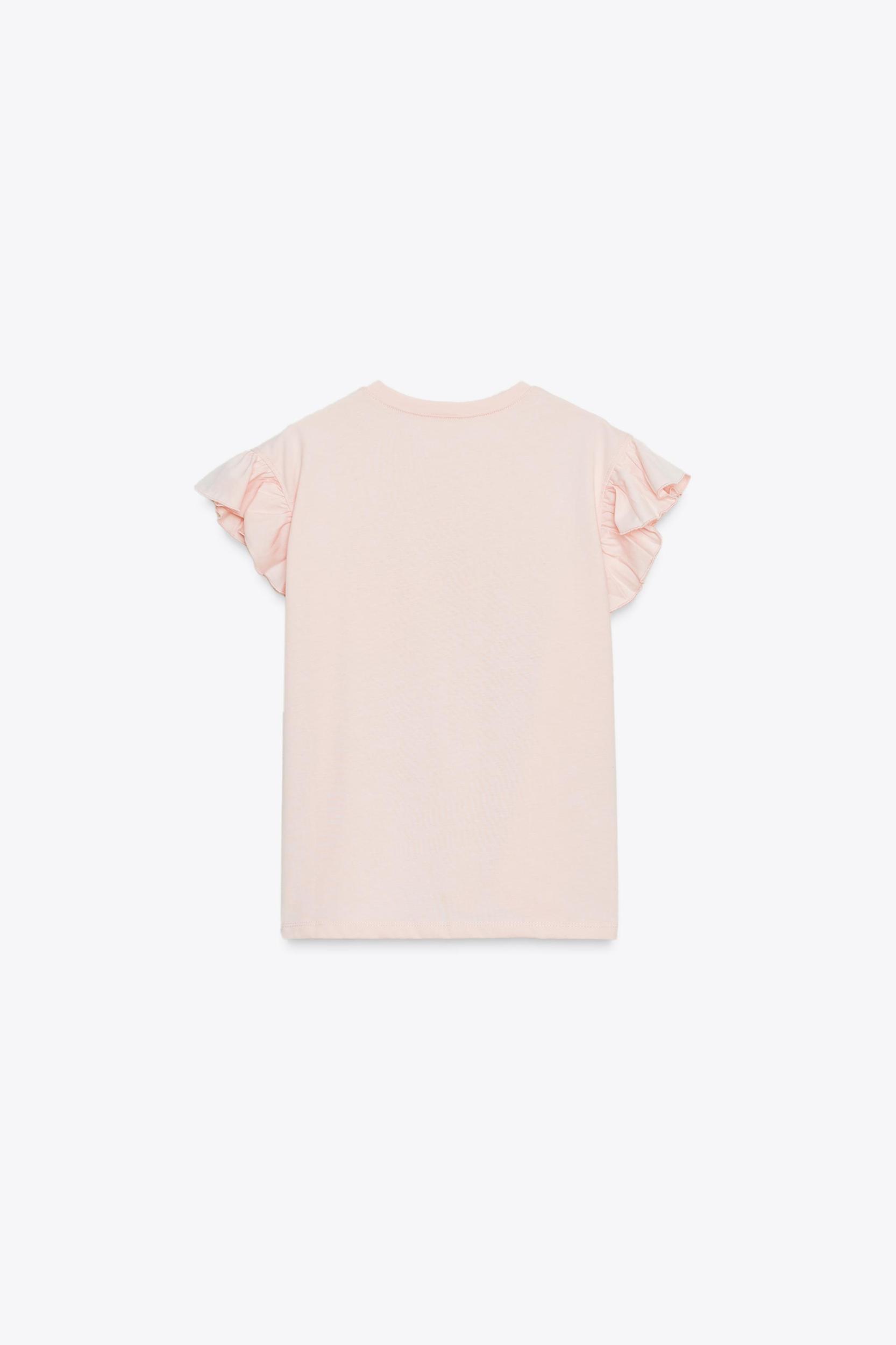 Round neck short sleeve T-shirt with ruffles. Raised floral detail.