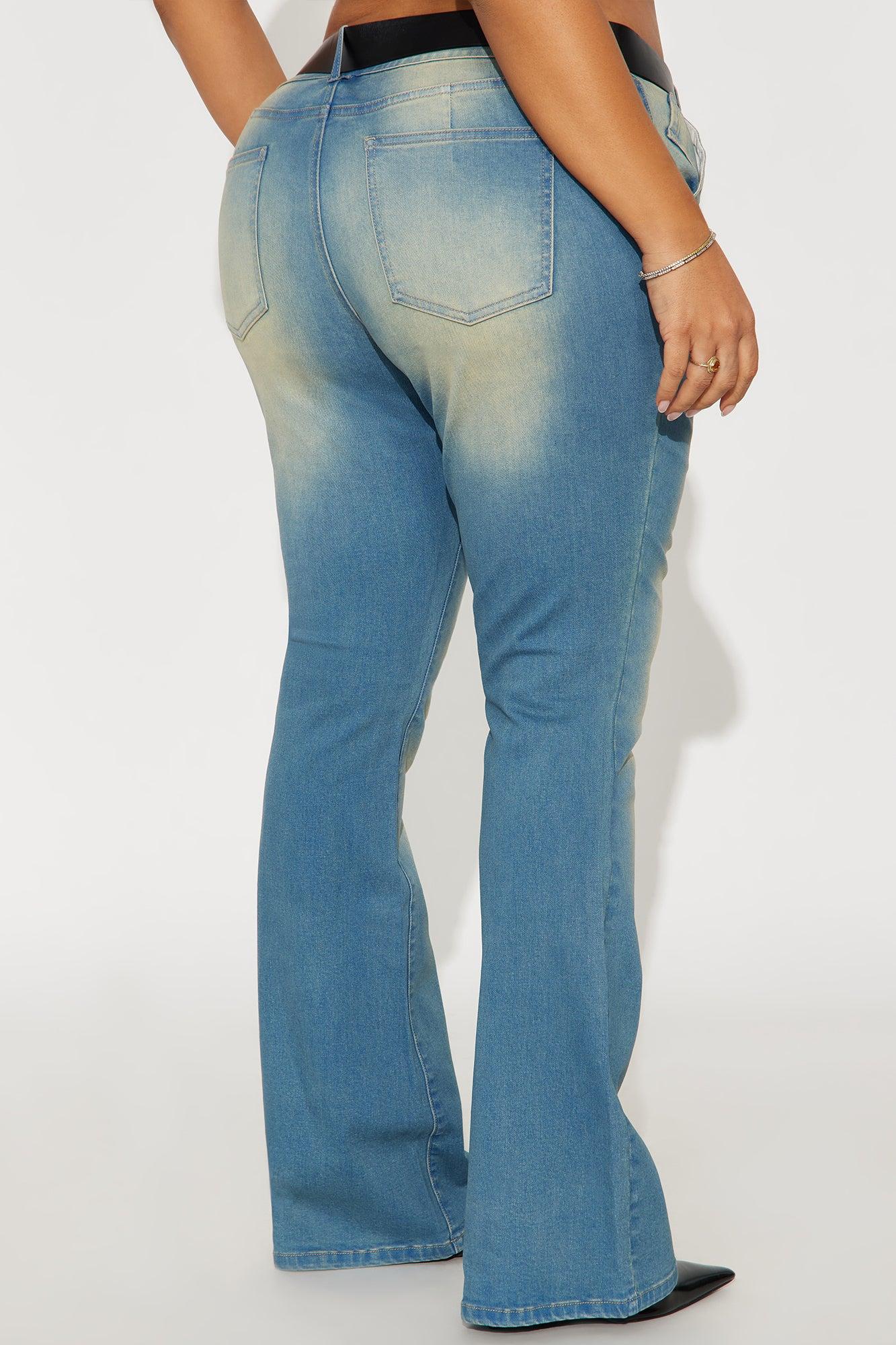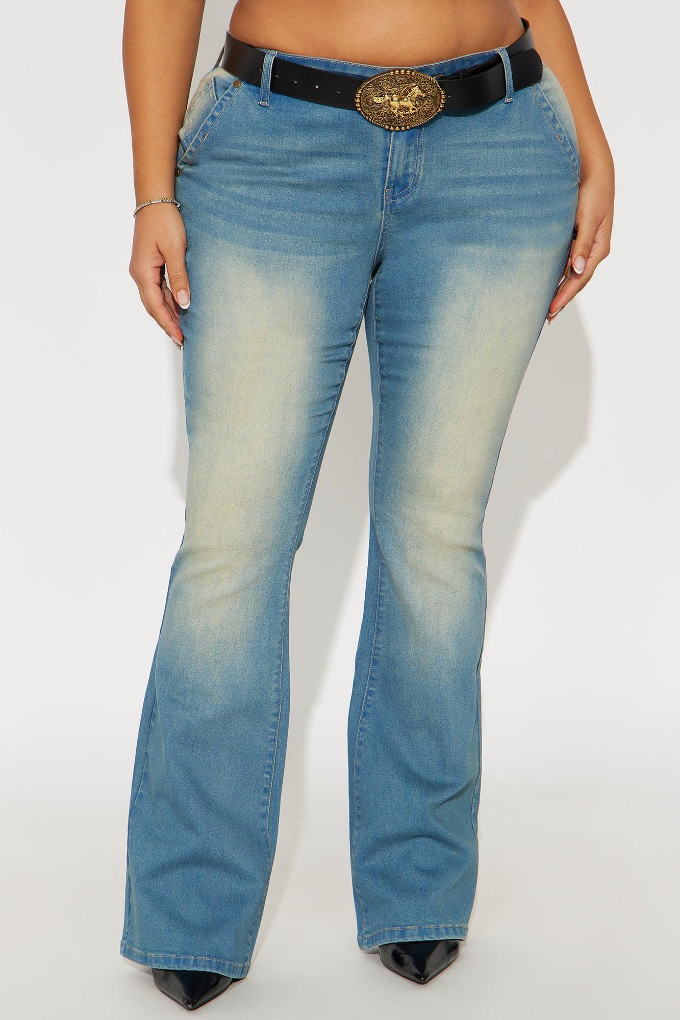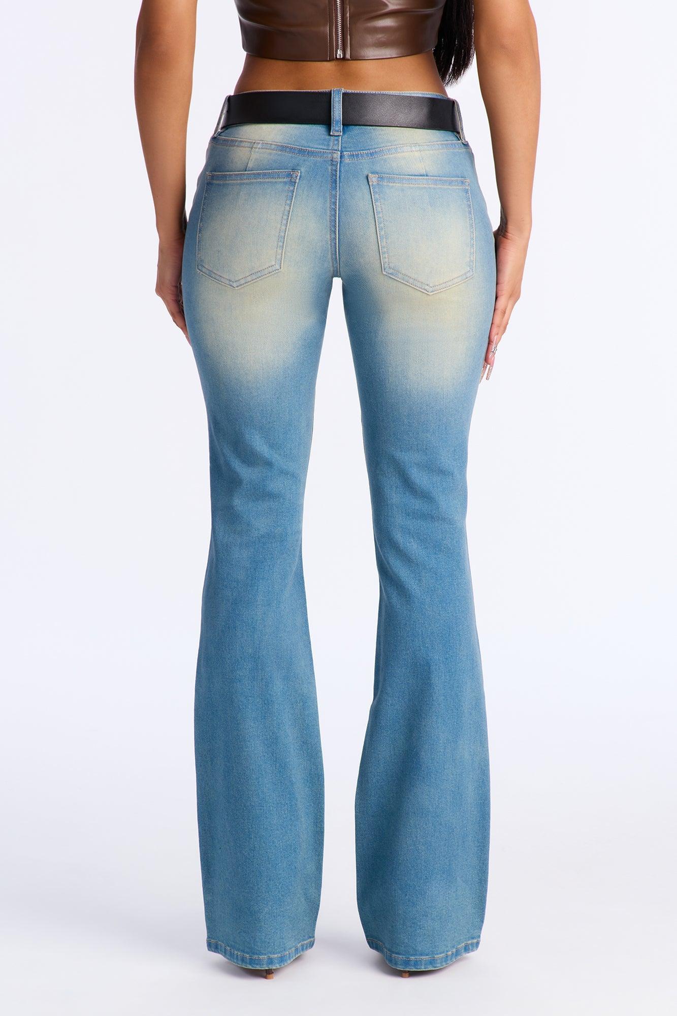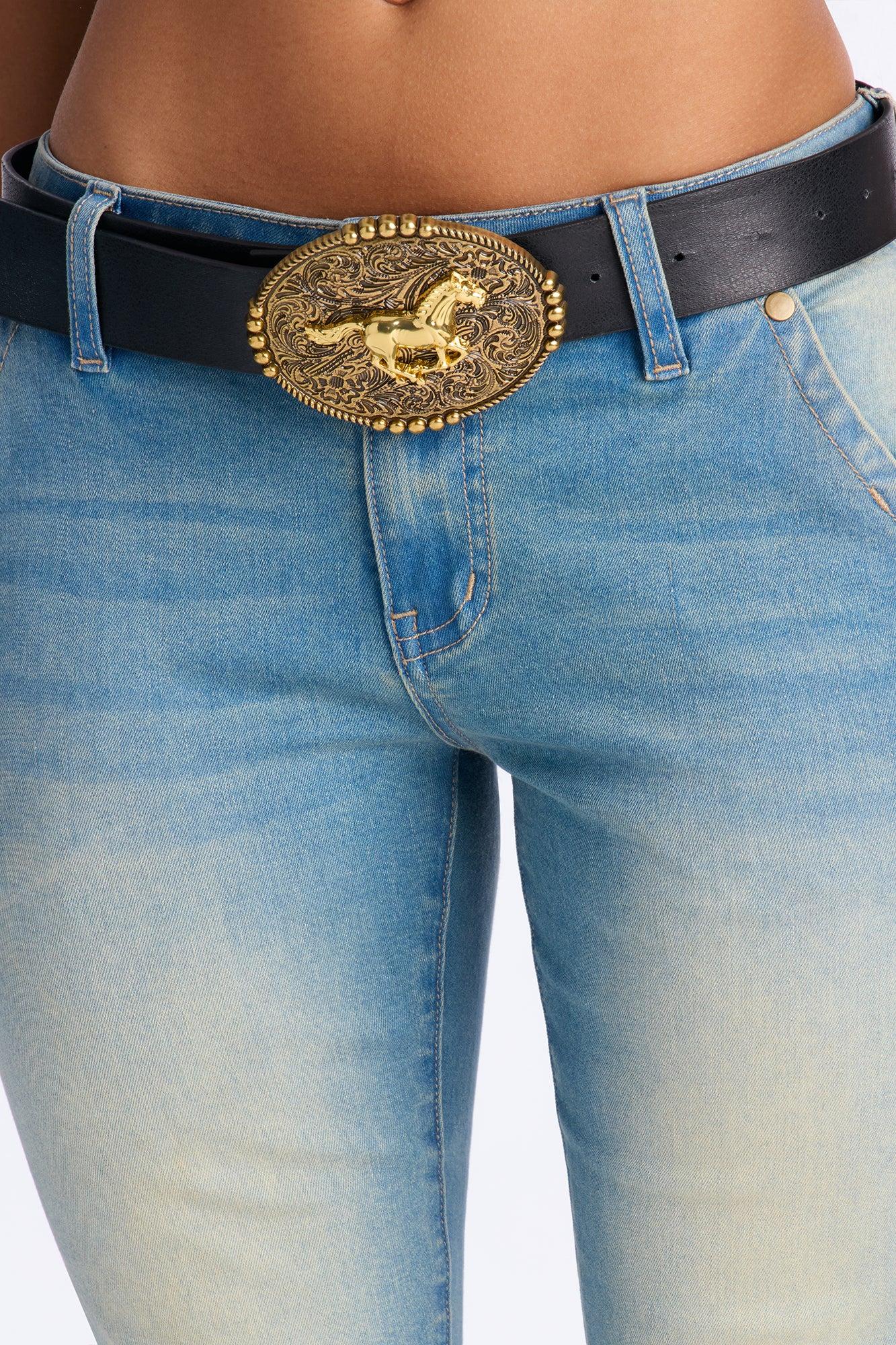 Available In Medium Wash. Bootcut Jean 5 Pocket Removable Buckle Belt Tinted 8" Low Rise 34" Inseam Medium Stretch Disclaimer: Due To The Specialized Wash, Each Garment Is Unique. 70% Cotton 28% Polyester 2% Spandex Imported California Proposition 65WARNING: Cancer and Reproductive Harm - www.P65Warnings.ca.gov.