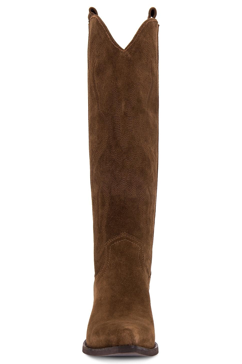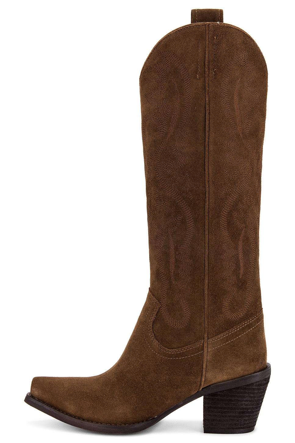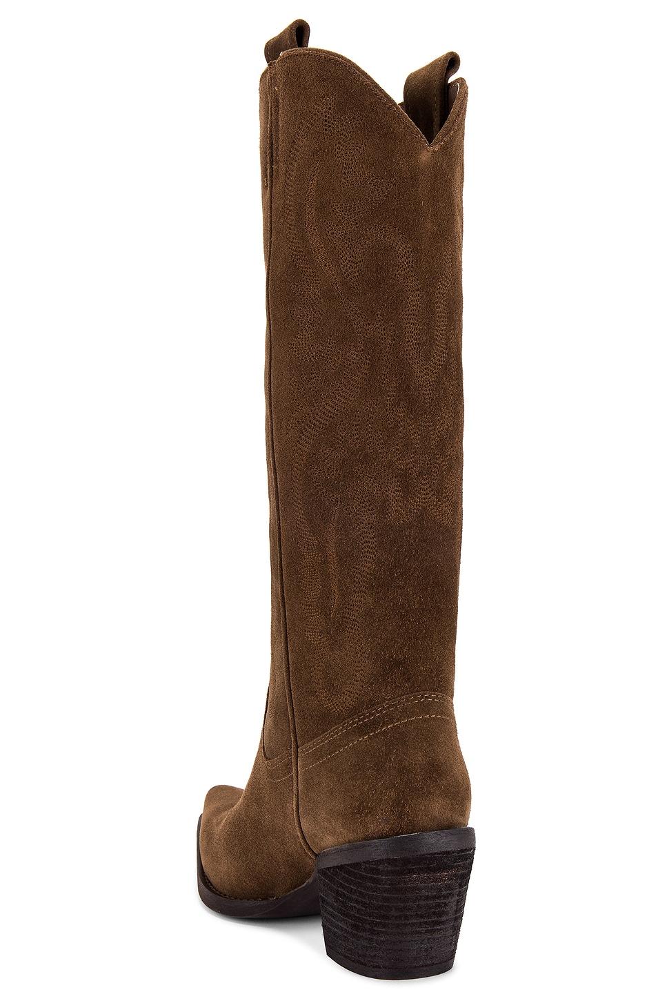 Suede upper with manmade sole. Made in China. Pull-on styling. Leather footbed with faux suede lining. Dual side pull-tabs. Tonal Western inspired stitching. Pointed toe with block heel. Approx 70mm/ 2.75 inch heelApprox 292mm/ 11.5 inch shaftShaft measures approx 10.99" in circumference. Revolve Style No. JCAM-WZ1719. Manufacturer Style No. RANCHER-K.