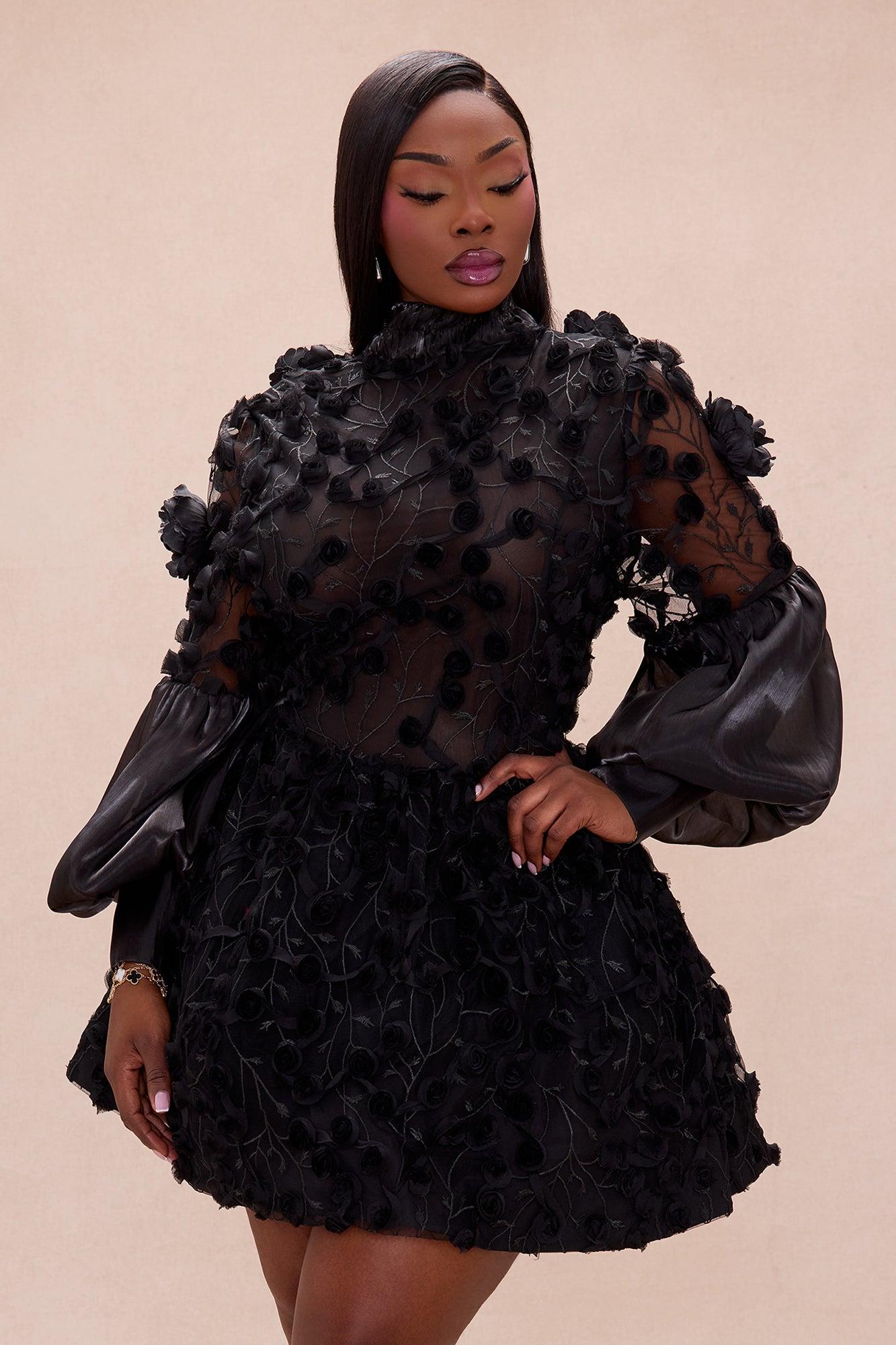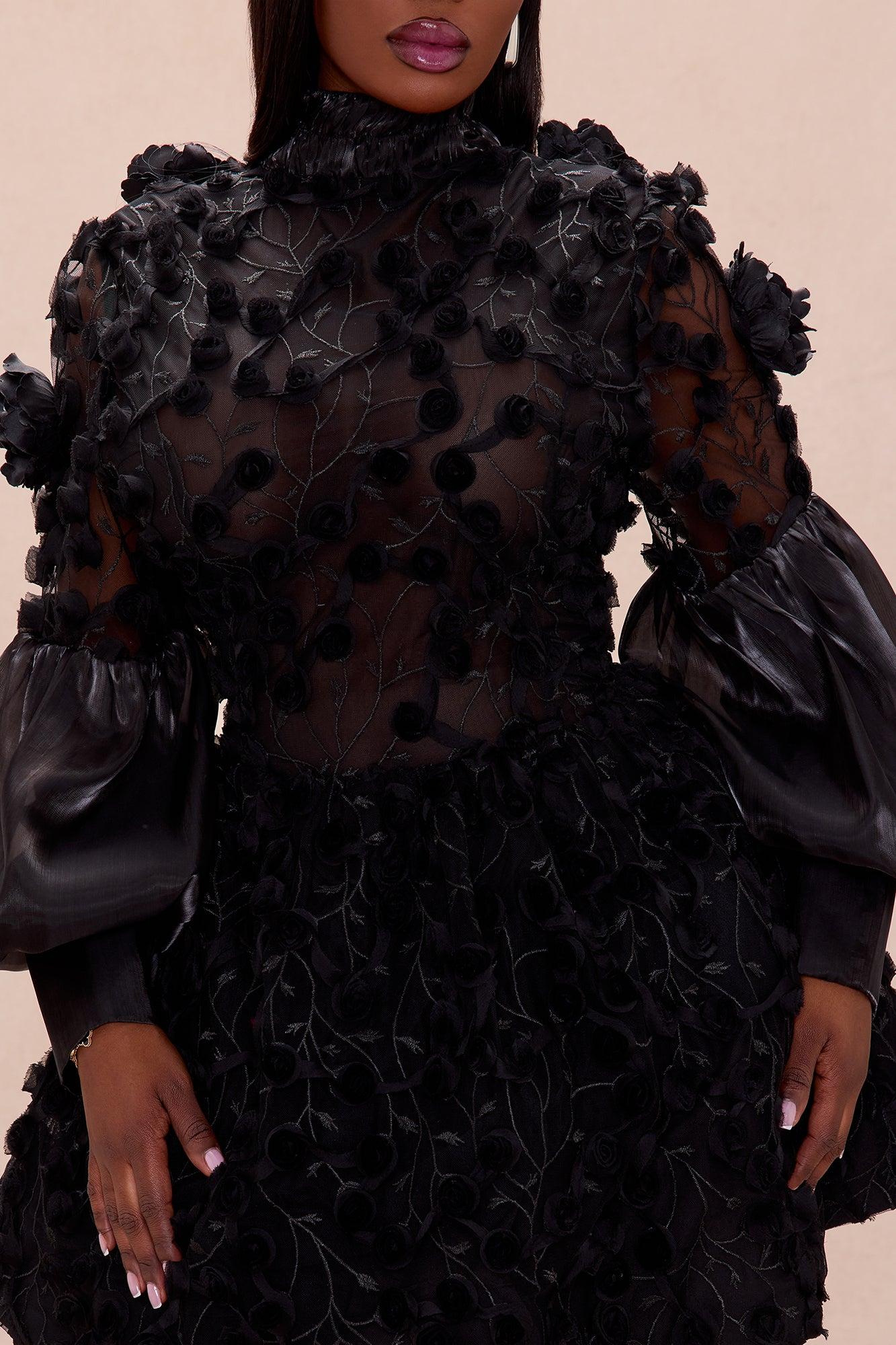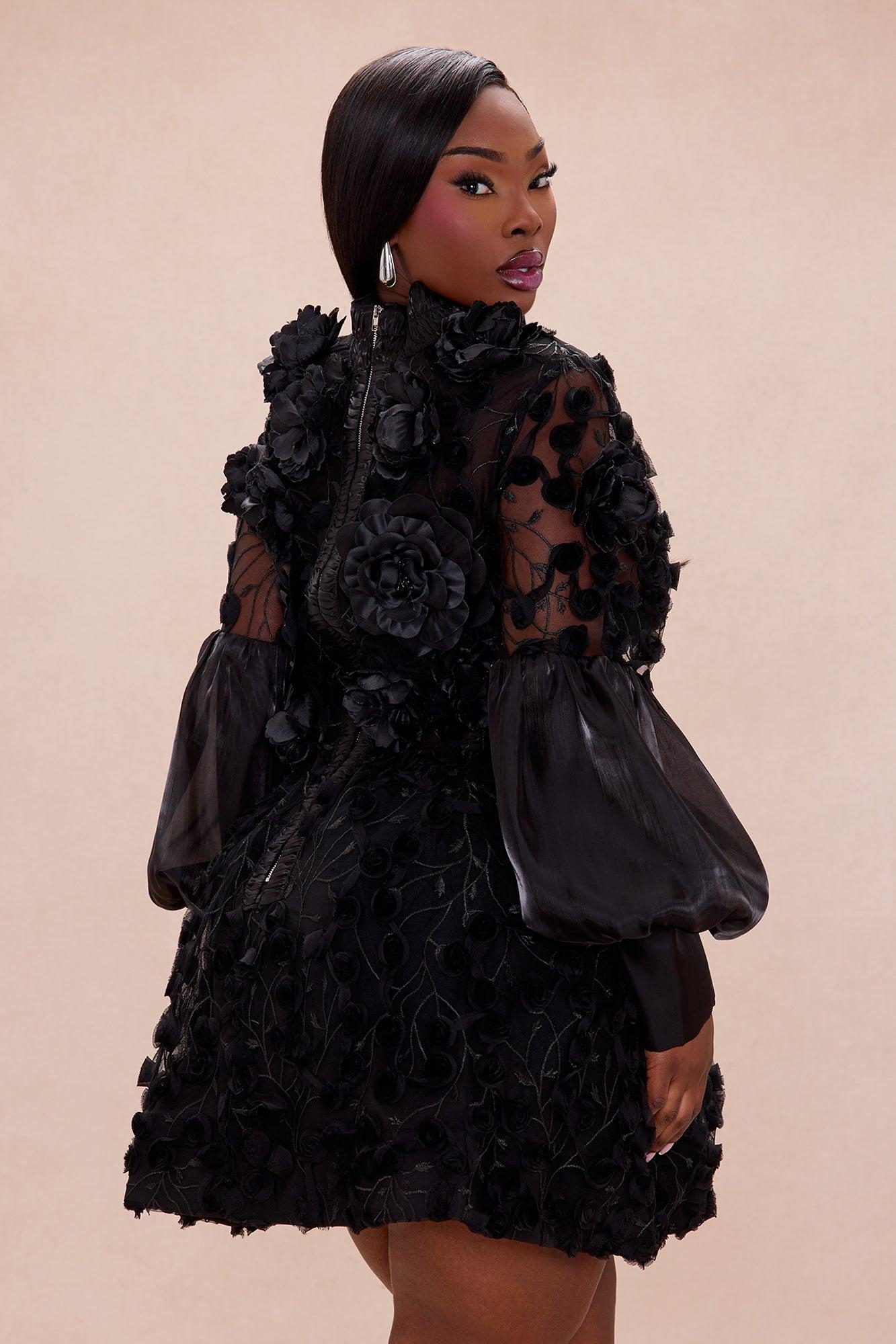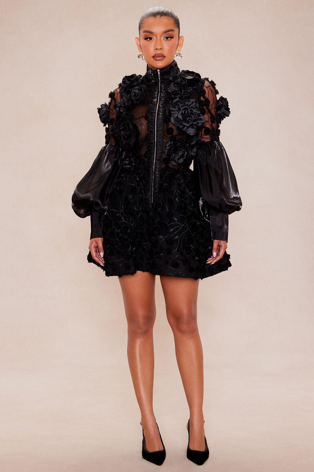 Available In Black And Rose. Embroidered Mini Dress Long Balloon Sleeve Mock Neckline 3D Floral Applique Front Zipper Closure Partially Lined Non Stretch Shell1 & 2: 100% Polyester Lining1: 90% Polyester 10% Spandex Lining2: 95% Polyester 5% Spandex Imported
