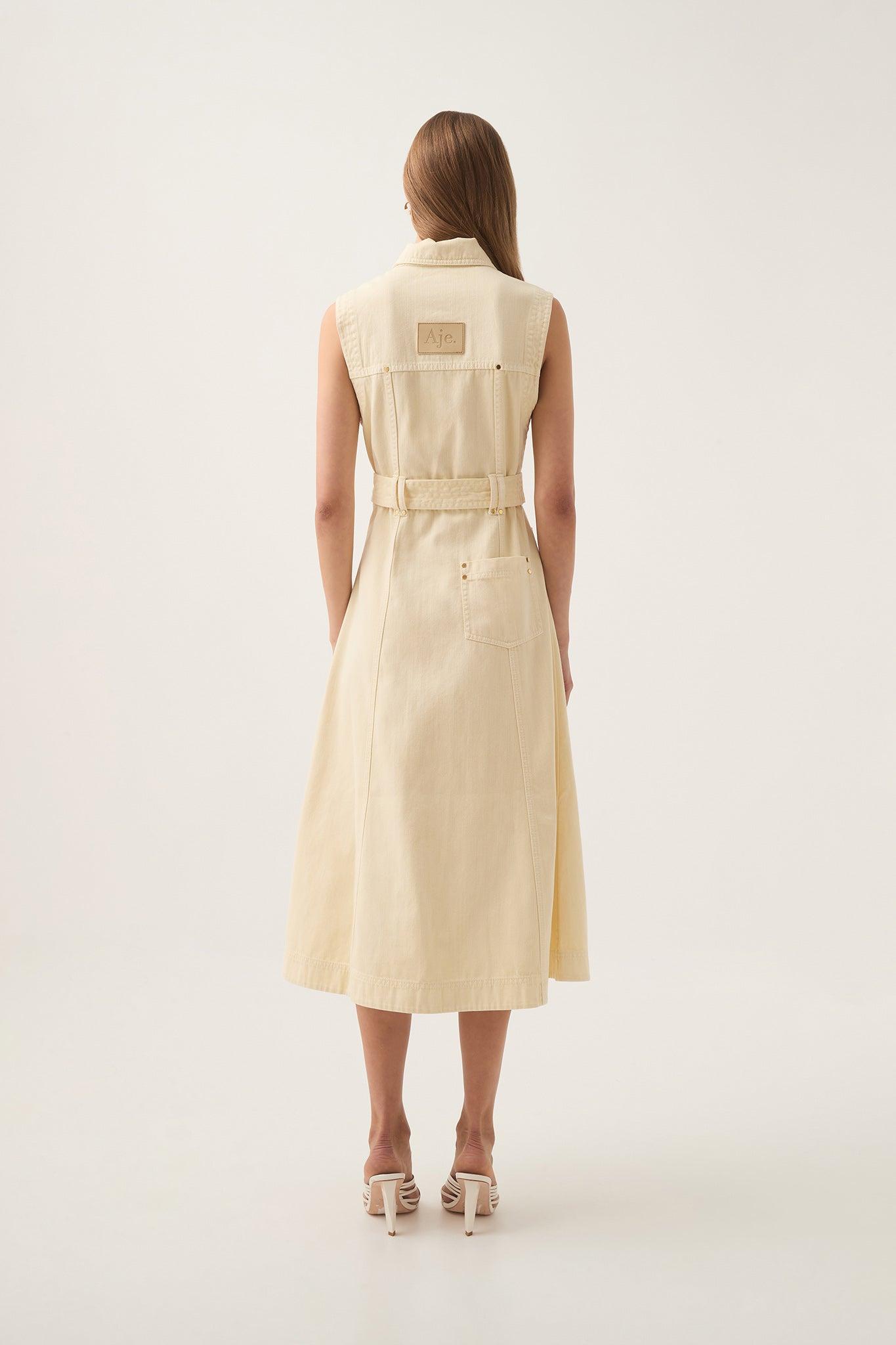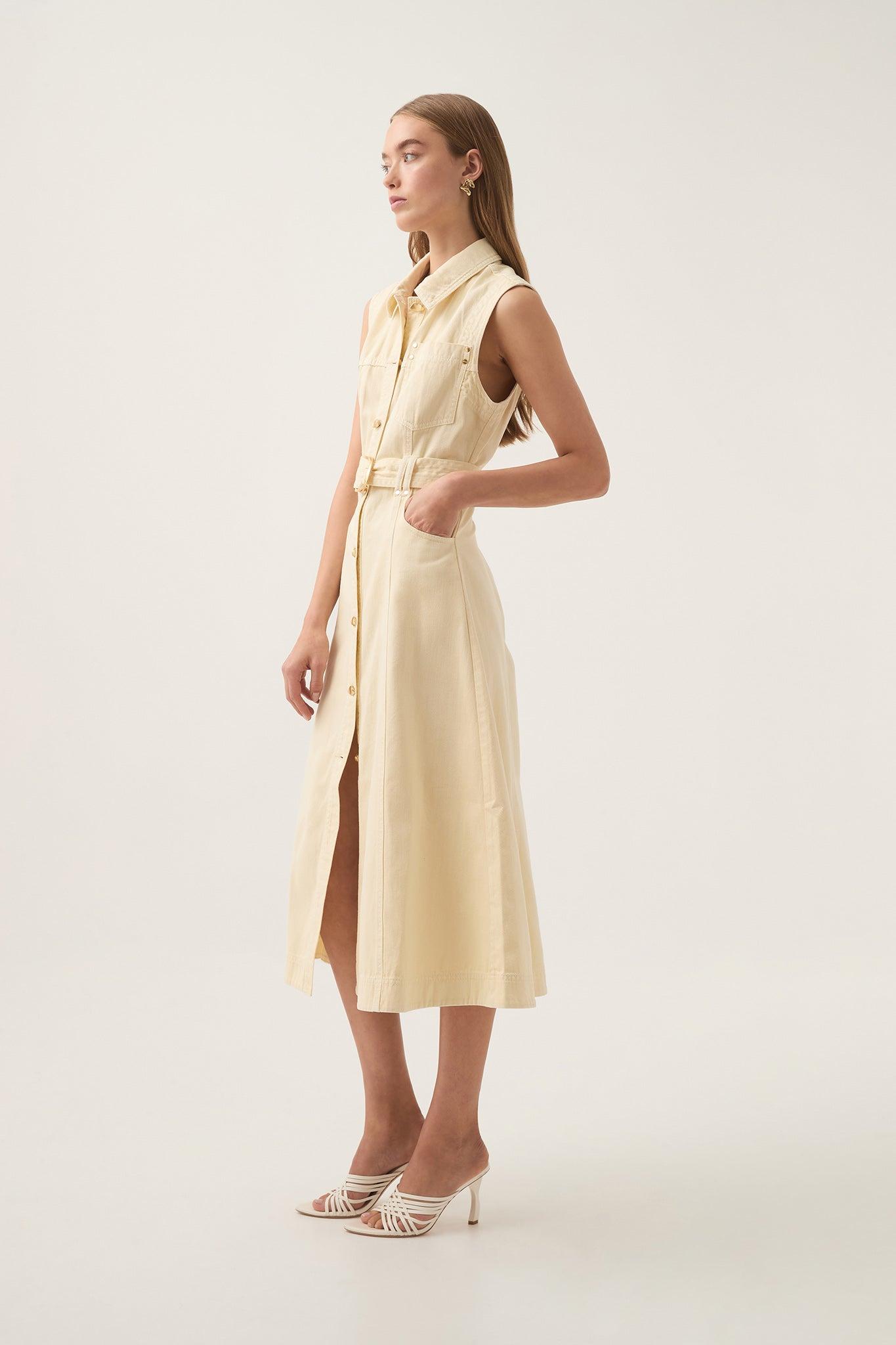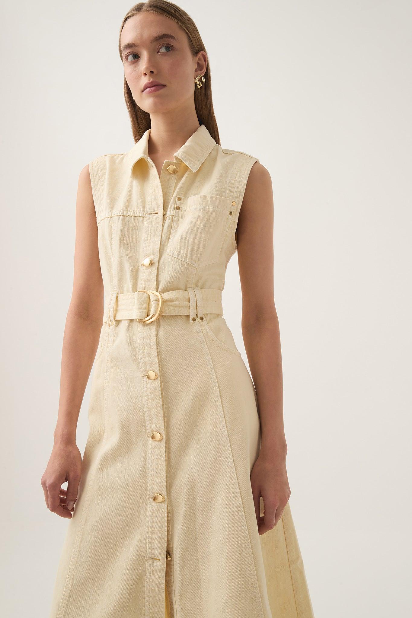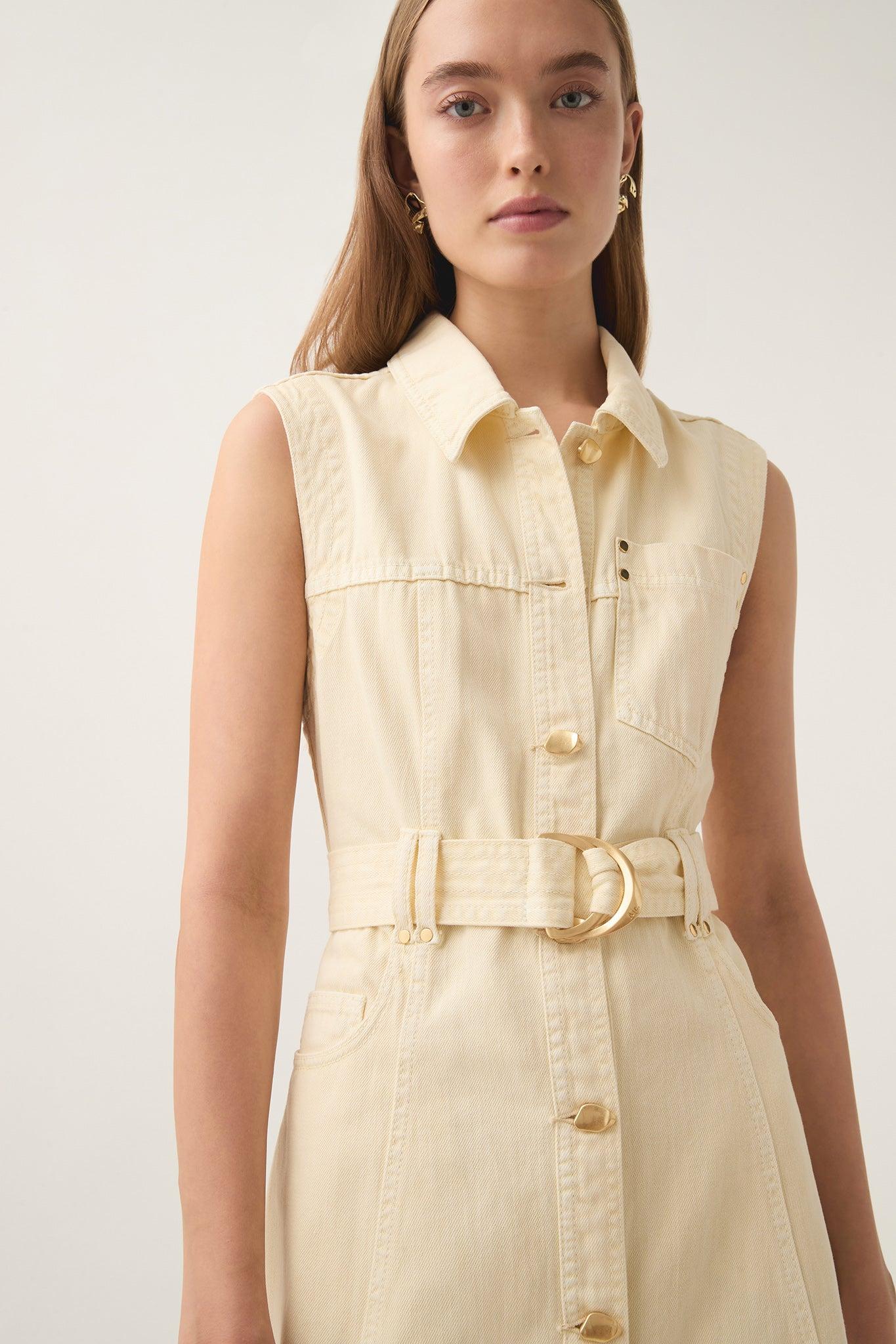 PRODUCT DETAILS Women's sleeveless denim dress Midi length Shirt collar Gold hardware details Twin belt loops Removable D-ring belt Front button-up placket Back logo patch detail 100% Cotton Delicate Cold Hand Wash Separately Shop All Dresses SIZE AND FIT Model wears a size AU 8/S Height: 175cm/ 5’9 Bust: 81cm Waist: 60cm Hips: 89cm
