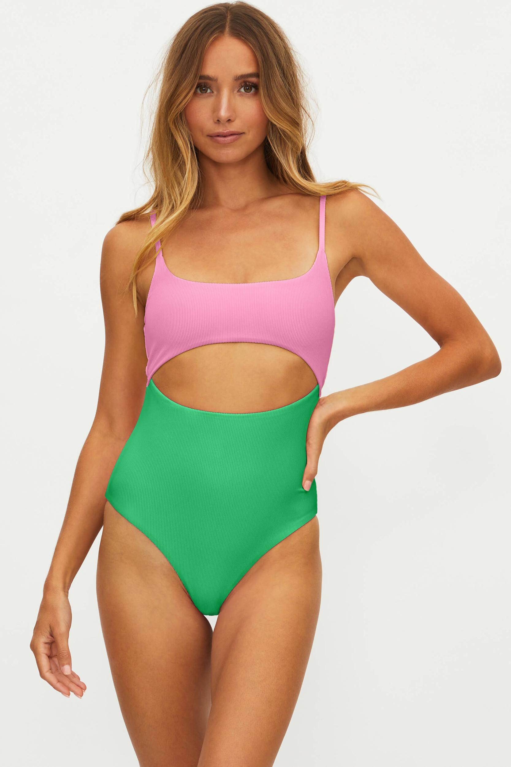 The Ray One Piece is a two toned colorblock swim suit is featured in our ultra soft ribbed fabric and has adjustable straps and a back hook closure with cut outs on the front and back. Featuring bright neon bubble gum pink and island green shades, perfect for the summer months ahead. This swimsuit has cheeky coverage. Poly/Elastne blend Hand wash cold; lay flat to dry Made in the USA Model is wearing Size Small FINAL SALE