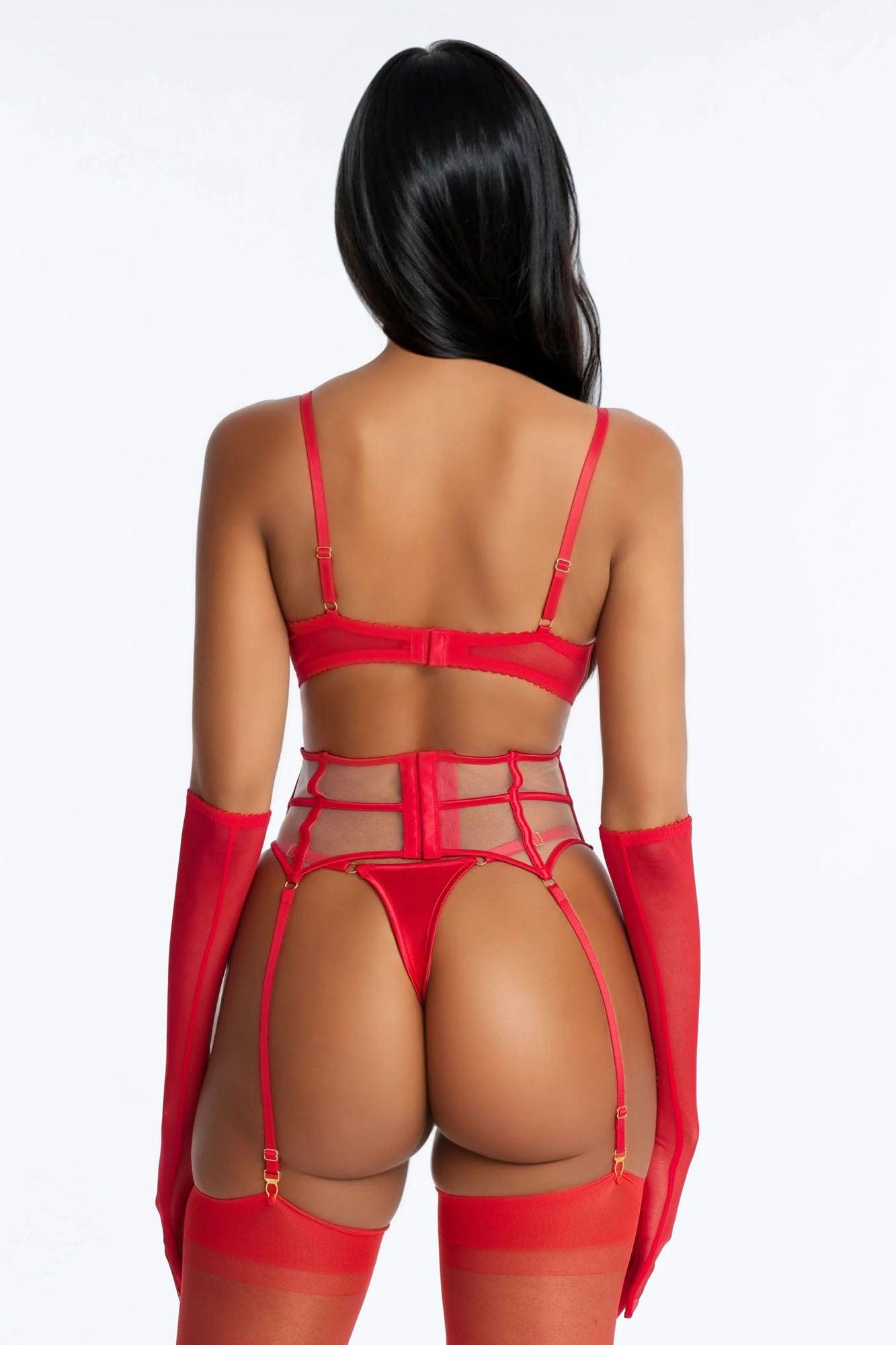 Raya Strappy Mesh 4 Piece Bra And Panty Garter Set - Red Female
