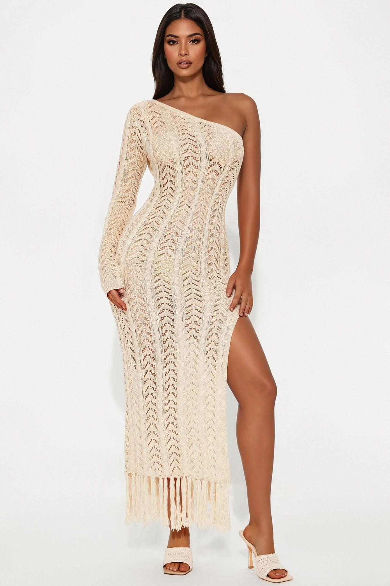 Available In Black And Sand. Crochet Maxi Dress Long Sleeve One Shoulder Fringe Trim Stretch Self:100% Acrylic Imported