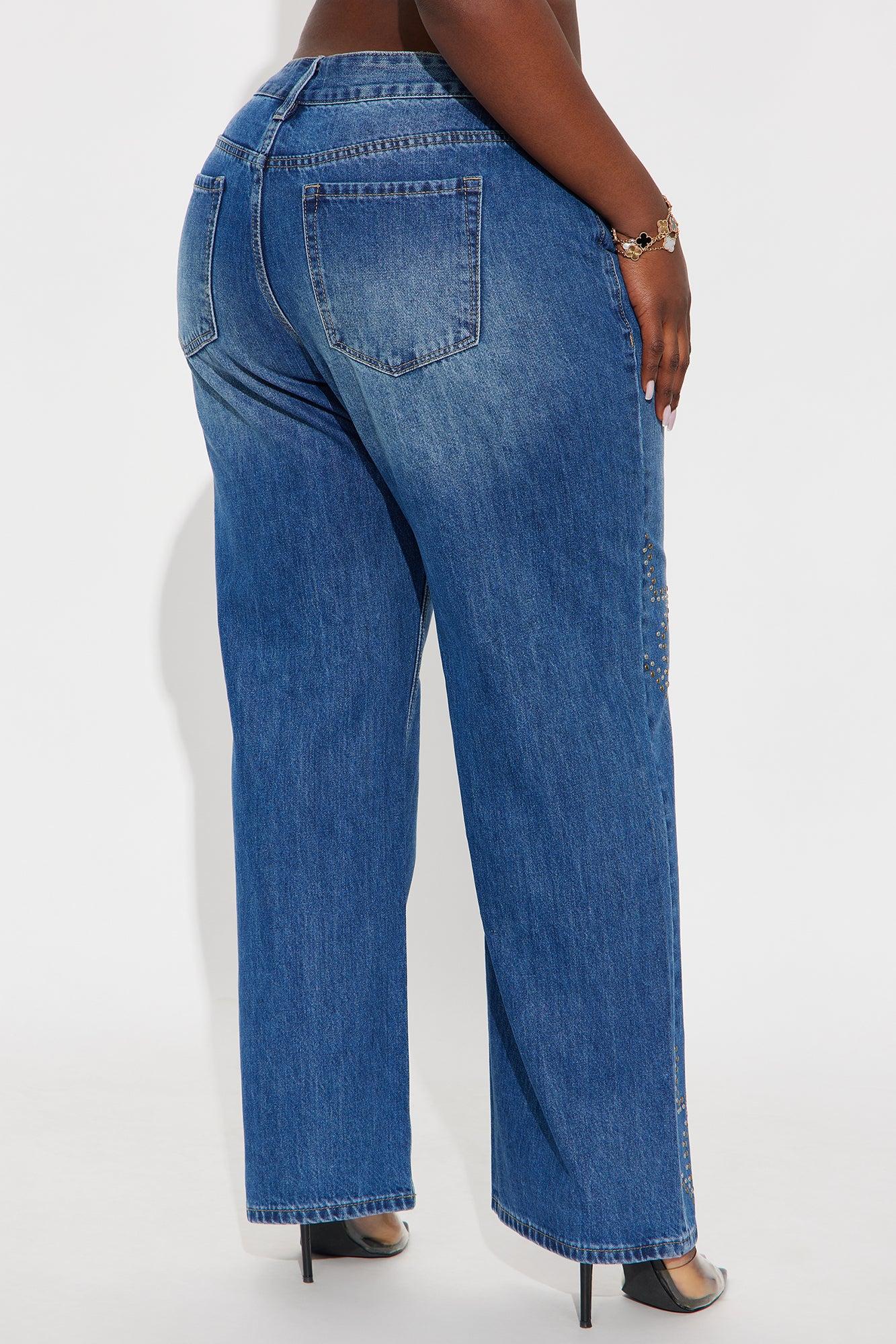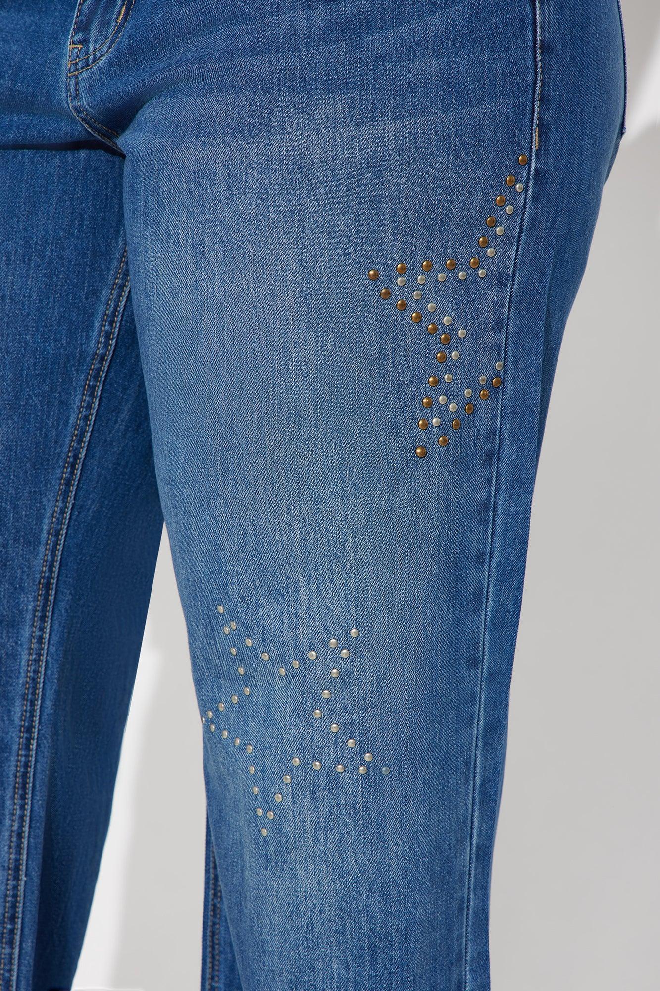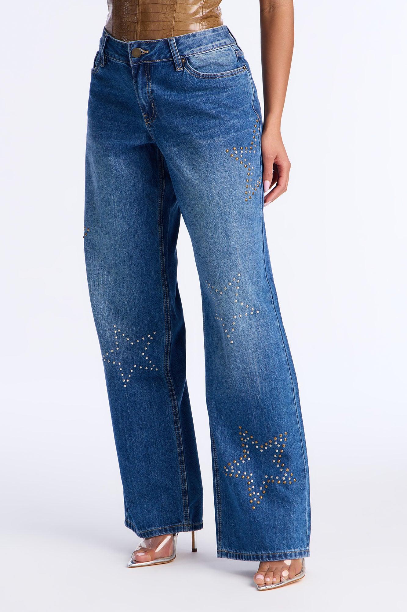 Available In Dark Wash. Wide Leg Jean 5 Pocket Studded Star Shapes 9" Rise 32" Inseam Non Stretch Disclaimer: Due To The Specialized Wash & Distressing Process, Each Garment Is Unique. 85% Cotton 8% Rayon 7% Polyester Imported