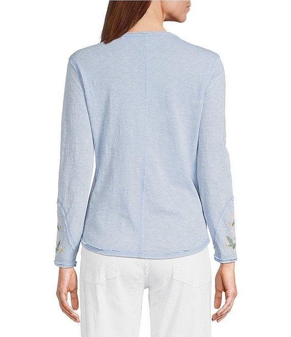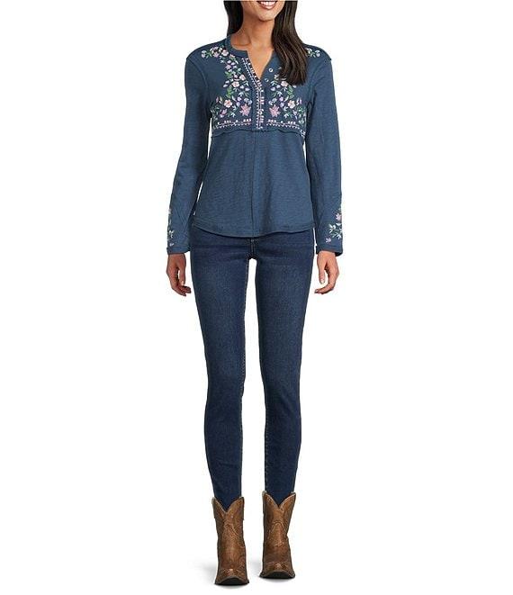 Reba Sedona Jersey Knit V-Neck Long Sleeve Embroidered Henley Top