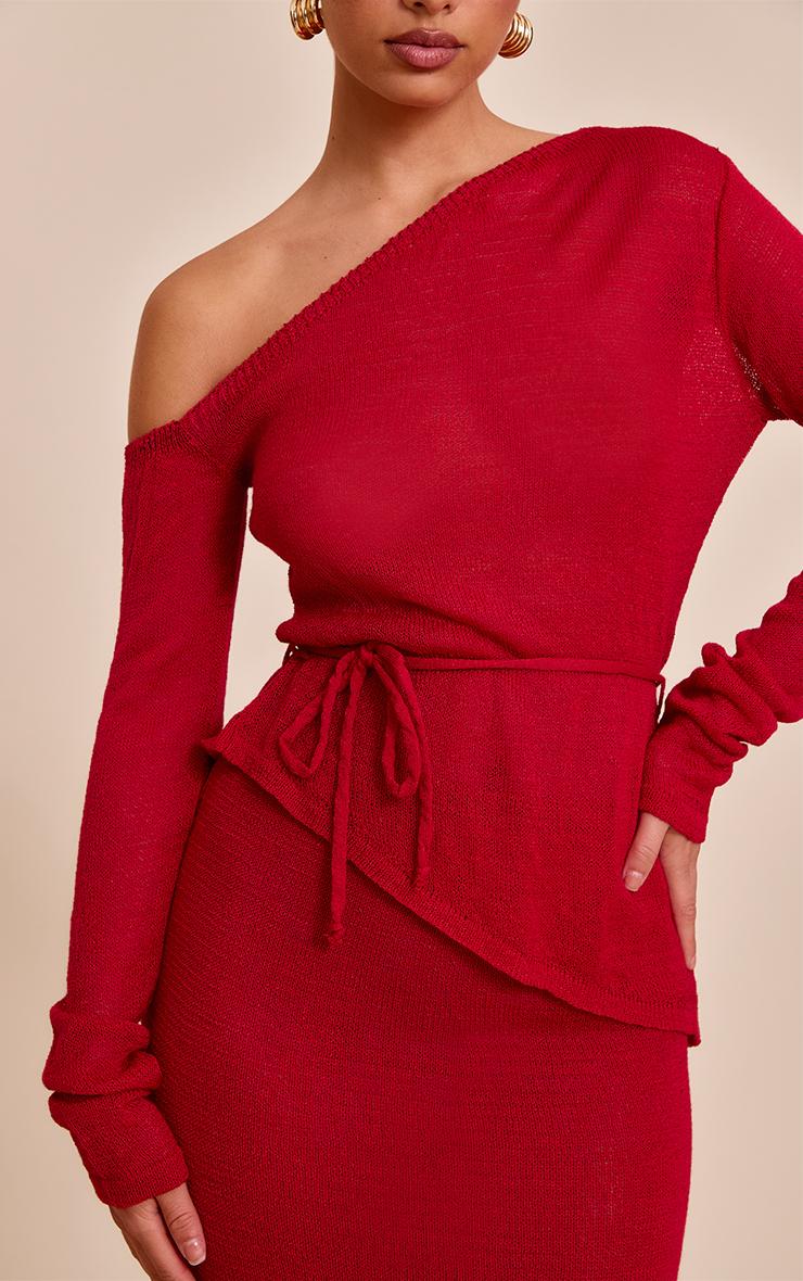 Embrace a distinctive vision for evening. The red asymmetric belted filigree top redefines knitwear with its artful cut, featuring a striking asymmetric neckline that reveals a confident shoulder line, while its long sleeves offer refined coverage. A clever tie belt cinches the waist, creating a flattering, directional peplum effect that cascades to an angled hem. This bold red top is perfect for making an impact; pair it with sleek tailored pants or a co-ordinating midi skirt and sharp heels for an ensemble that speaks to confident allure.Length approx 48.5cm/19inch (Based on sample size S)Model wears size SModel Height - 5ft 7inchp]:!mb-4inch>Brand: PrettyLittleThingCategory: KnitwearProduct type: T-ShirtColor: RedMaterial: KnitNeckline: AsymmetricSleeves: LongOccasion: Evening