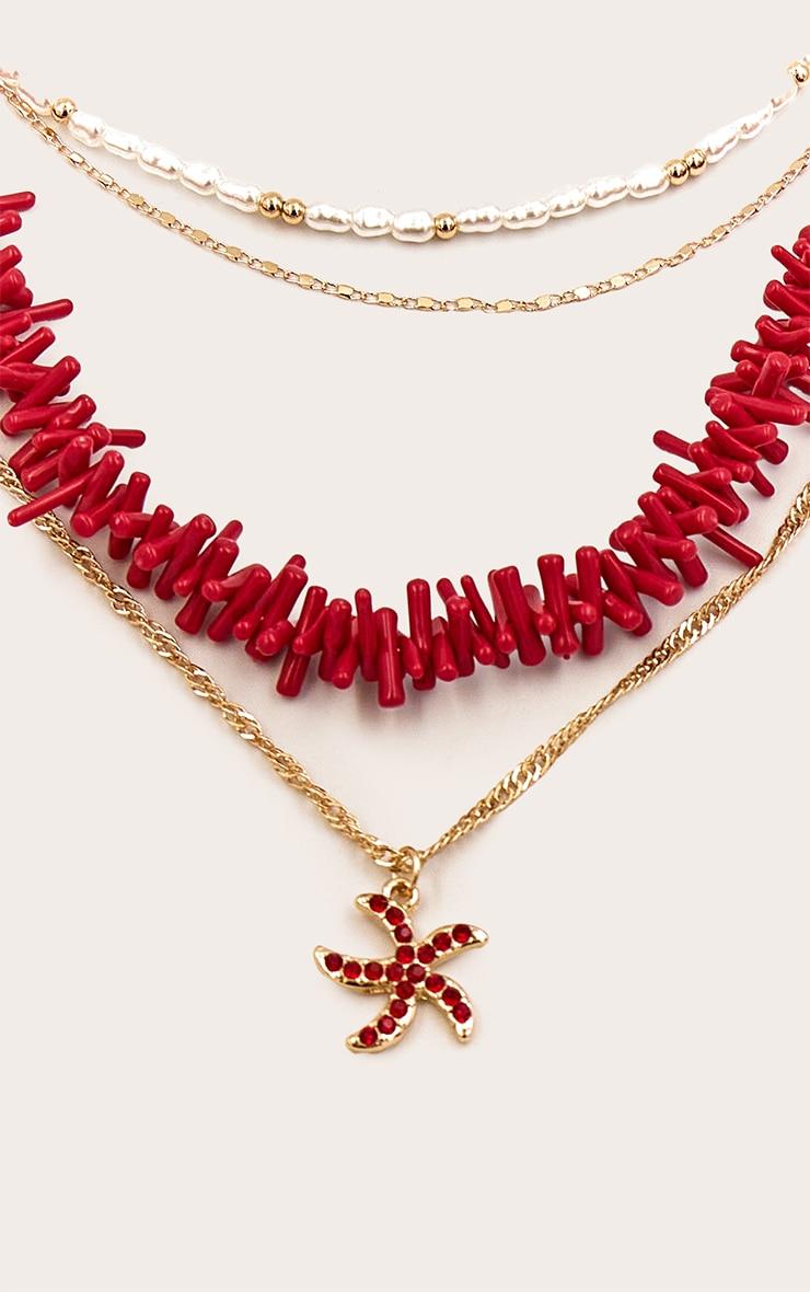 Bring a unique edge to your jewelry collection. This red beaded layered starfish pendant necklace is the ultimate day accessory, ready to make a statement. It features a striking trio of gold-tone chains, one adorned with a vibrant array of irregular red beads, another delicately strung with lustrous white pearl-effect beads, and the shortest providing a subtle shimmer. The look is completed with a distinctive red starfish pendant suspended at the lowest point, adding an unexpected focal detail. Wear it over a simple scoop-neck top and tailored pants for a polished yet relaxed feel, or let it instantly elevate a neutral cami dress for an artful touch of color.p]:!mb-4inch>Brand: PrettyLittleThingCategory: AccessoriesProduct type: NecklaceColor: RedMaterial: MetalOccasion: Day