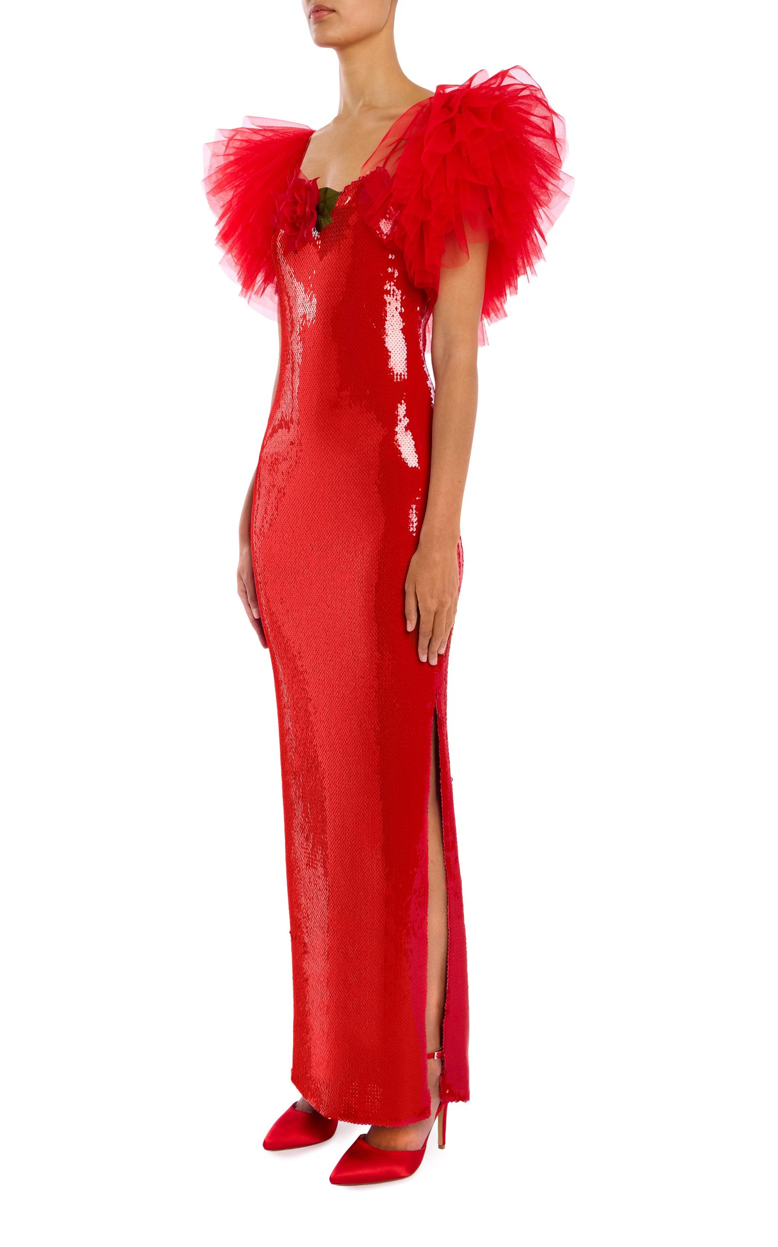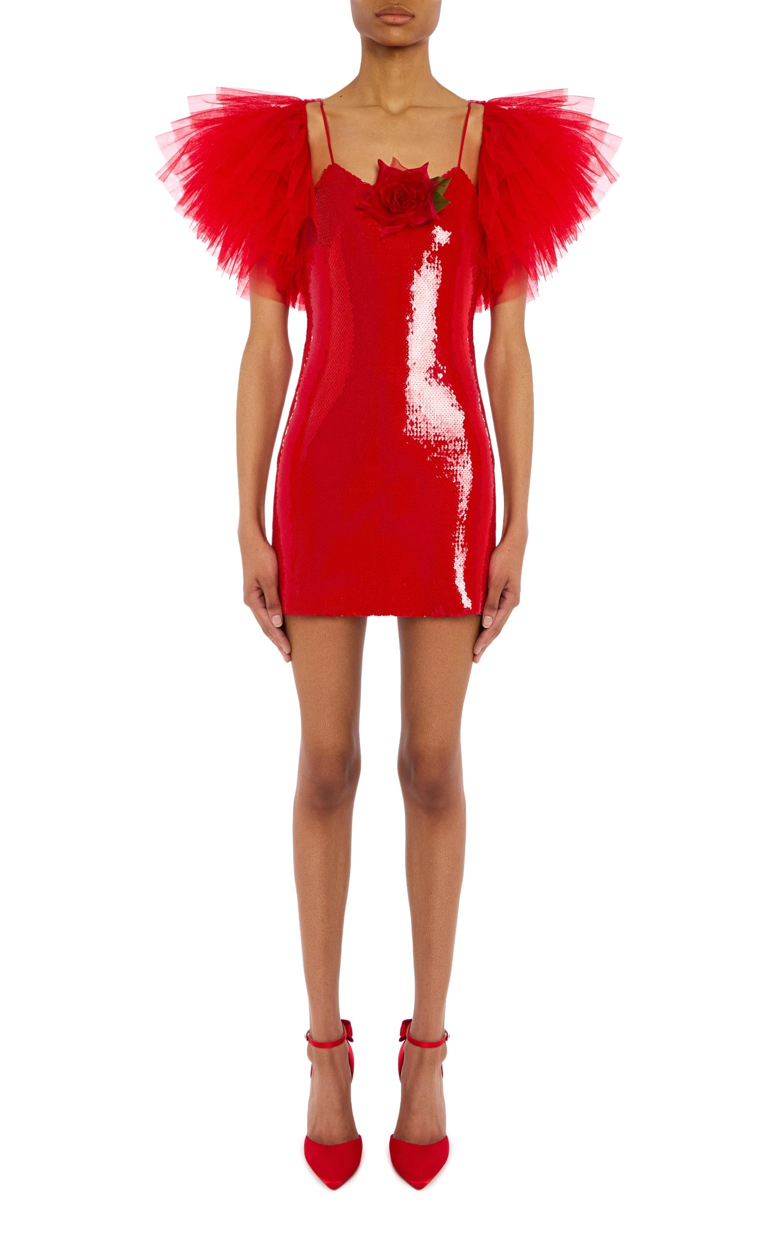 This dramatic ruffled bolero crafted of frothy red tulle provides an elegant finishing touch to your bridal look.