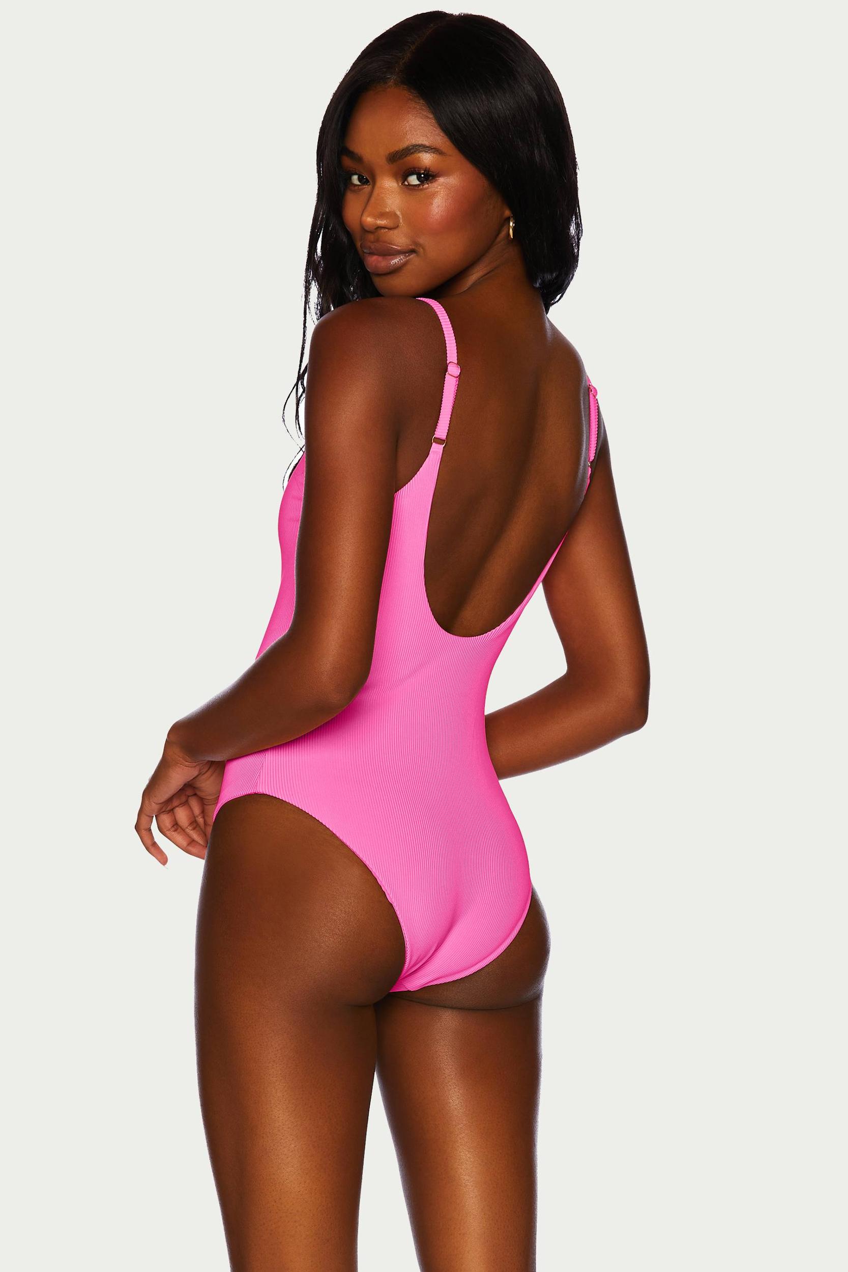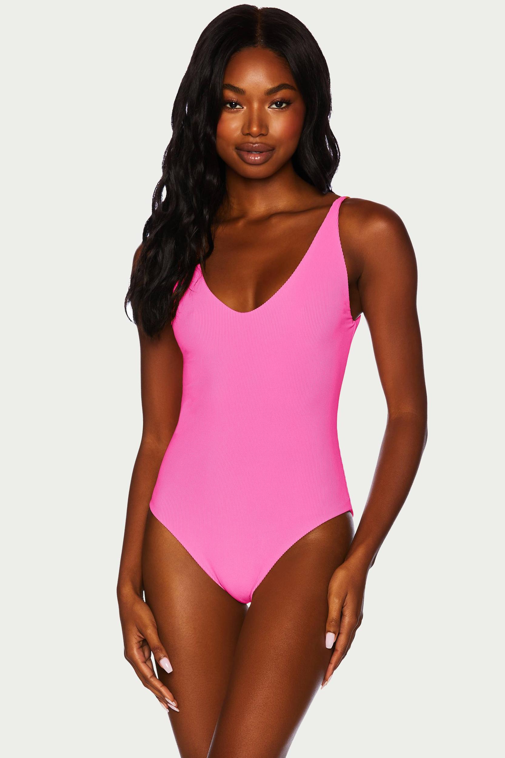 With a classic and flattering fit the Reese one piece features a plunge neckline, low dipped back, adjustable straps and moderate bottom coverage. This swimsuit has a shelf bra and removable cups. Featured in our best-selling ribbed fabric in a bright neon pink shade. Poly/Spandex Blend Hand wash cold; lay flat to dry Made in the USA Model is wearing Size Small