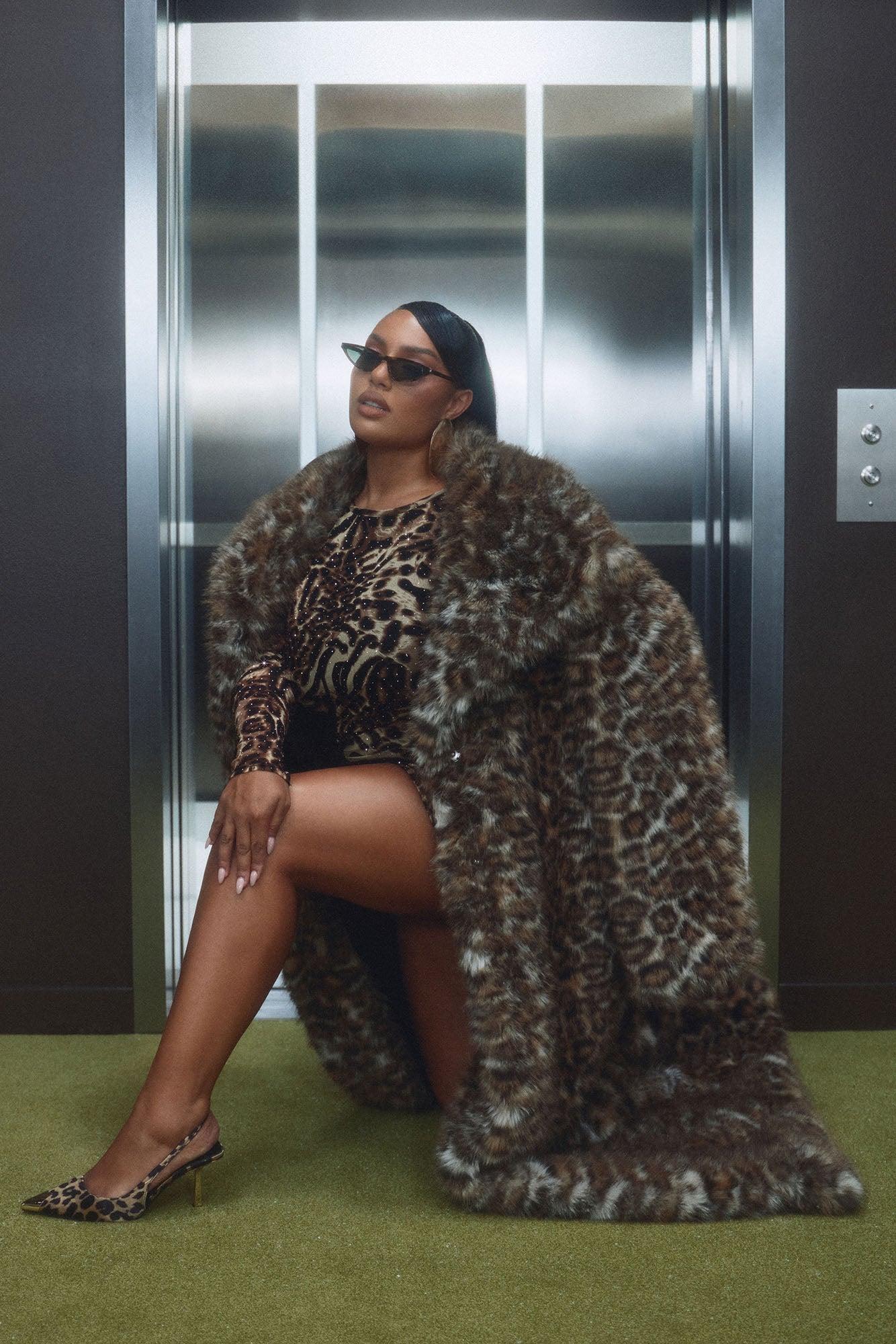 Available In Brown Combo. Mesh Mini Dress High Neck Long Sleeve Ruched Scarf Accessory Included Rhinestone Embellished Stretch Length Measured Flat = 32" Disclaimer: Print Placement Will Vary. Self: 95% Nylon 5% Spandex Lining: 100% Polyester Imported