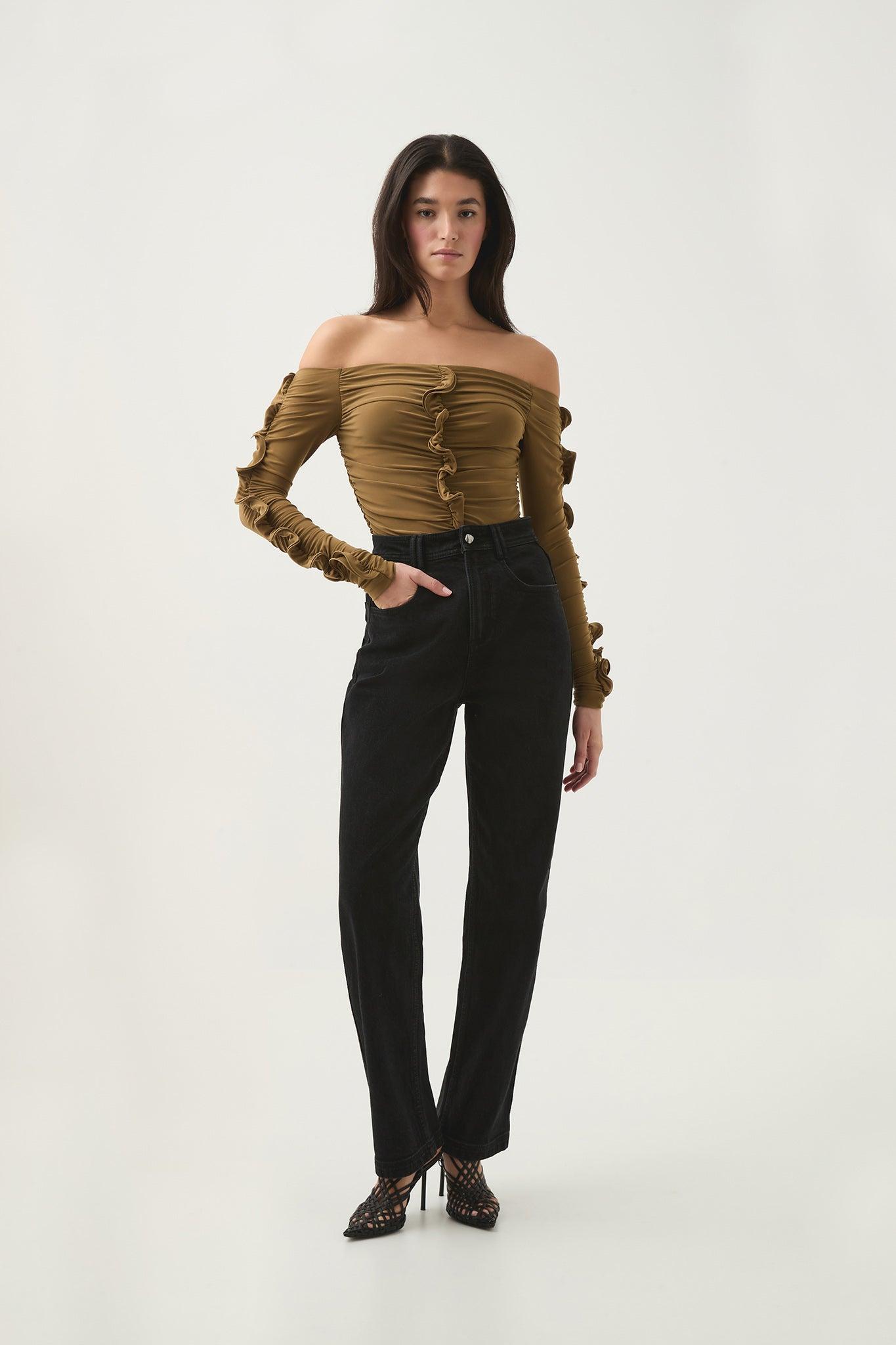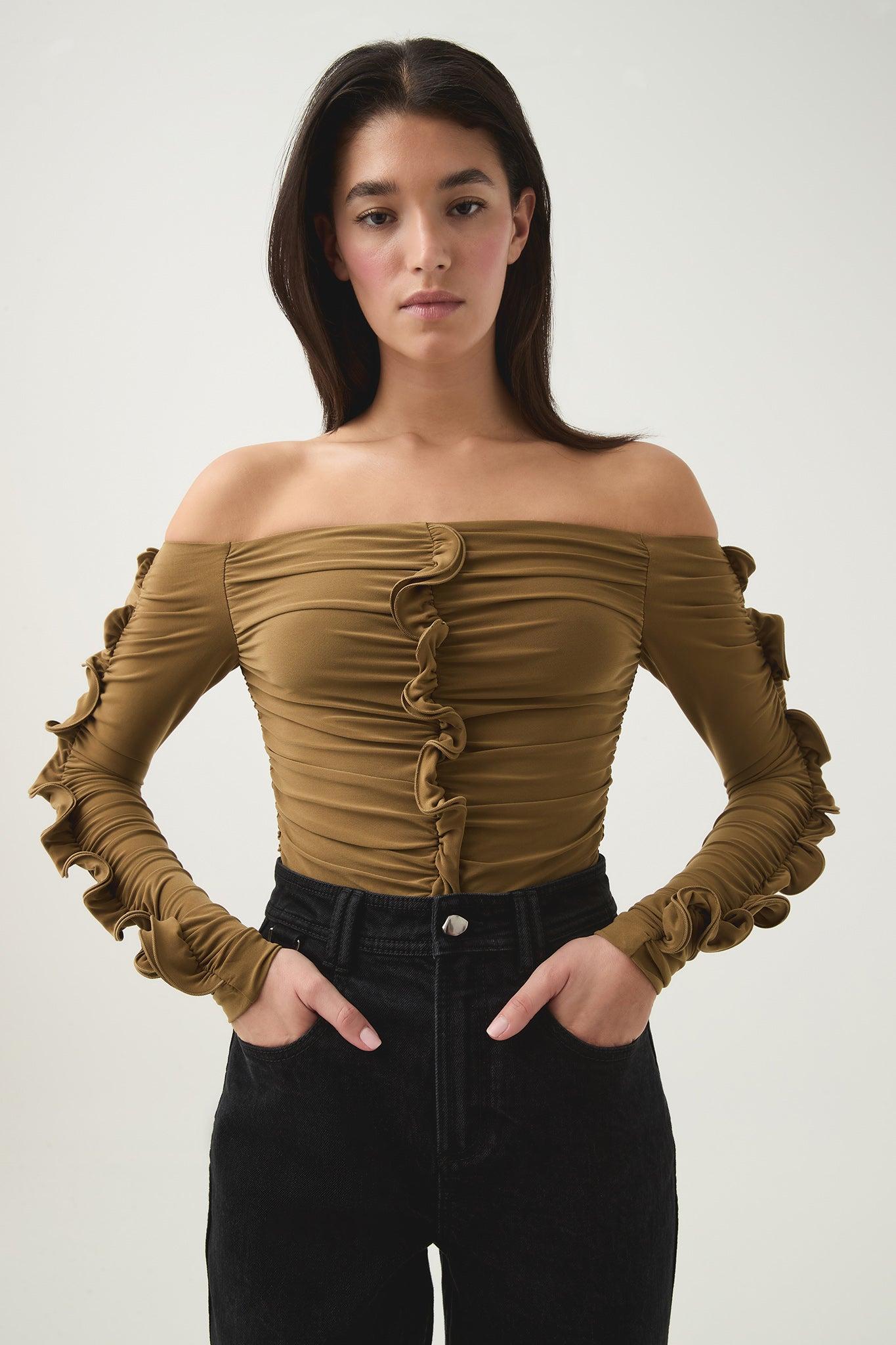 PRODUCT DETAILS Women’s top Fitted off-the-shoulder style Gathered detail throughout Shop All Tops SIZE AND FIT Fitted finish We recommend going up one size for a more comfortable fit Model wears a size 8/S Model: 177cm/ 5'10 Bust: 80cm Waist: 58cm Hips: 88cm FABRICATION 95% Polyester 5% Elastane