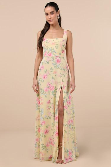 Heads are sure to turn when you step out to dance in the Lulus Remarkable Arrival Yellow Multi Floral Sleeveless Maxi Dress! Lightweight woven chiffon, with a whimsical floral print throughout, shapes this graceful dress that has tank straps and a flattering darted bodice. High, fitted waist sits above a chic and airy skirt that falls to a maxi hem and boasts a stunning side slit. Hidden zipper/clasp at back.