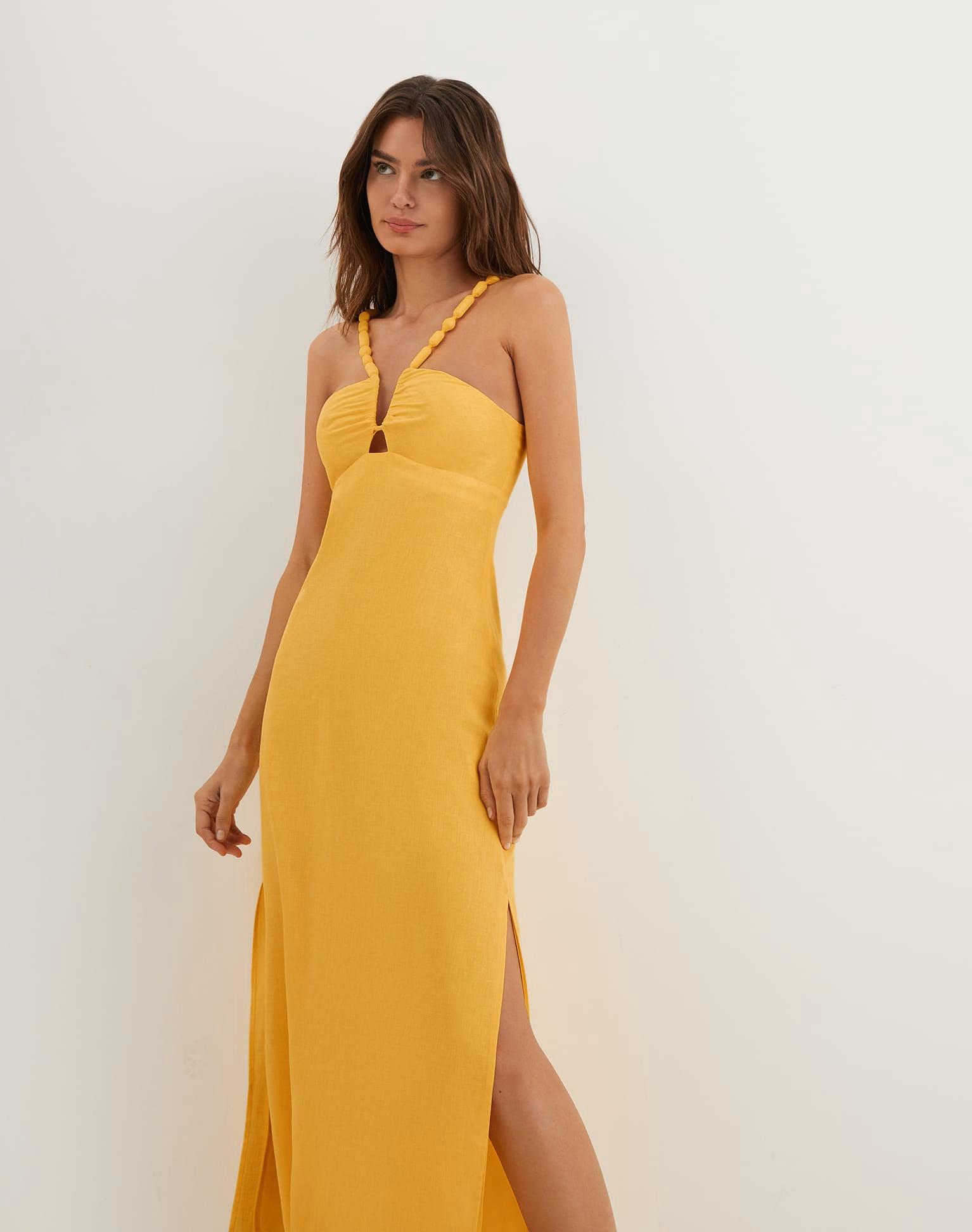 The ViX Renda Midi Dress is a sleeveless halter design with intricate Atena detailing along the neckline. It features a subtle cutout below the bust, dual side slits, a smocked back, adjustable shoulder straps, and a hidden back zipper for a sleek finish. Style the Renda Midi Dress with sandals and ViX accessories for