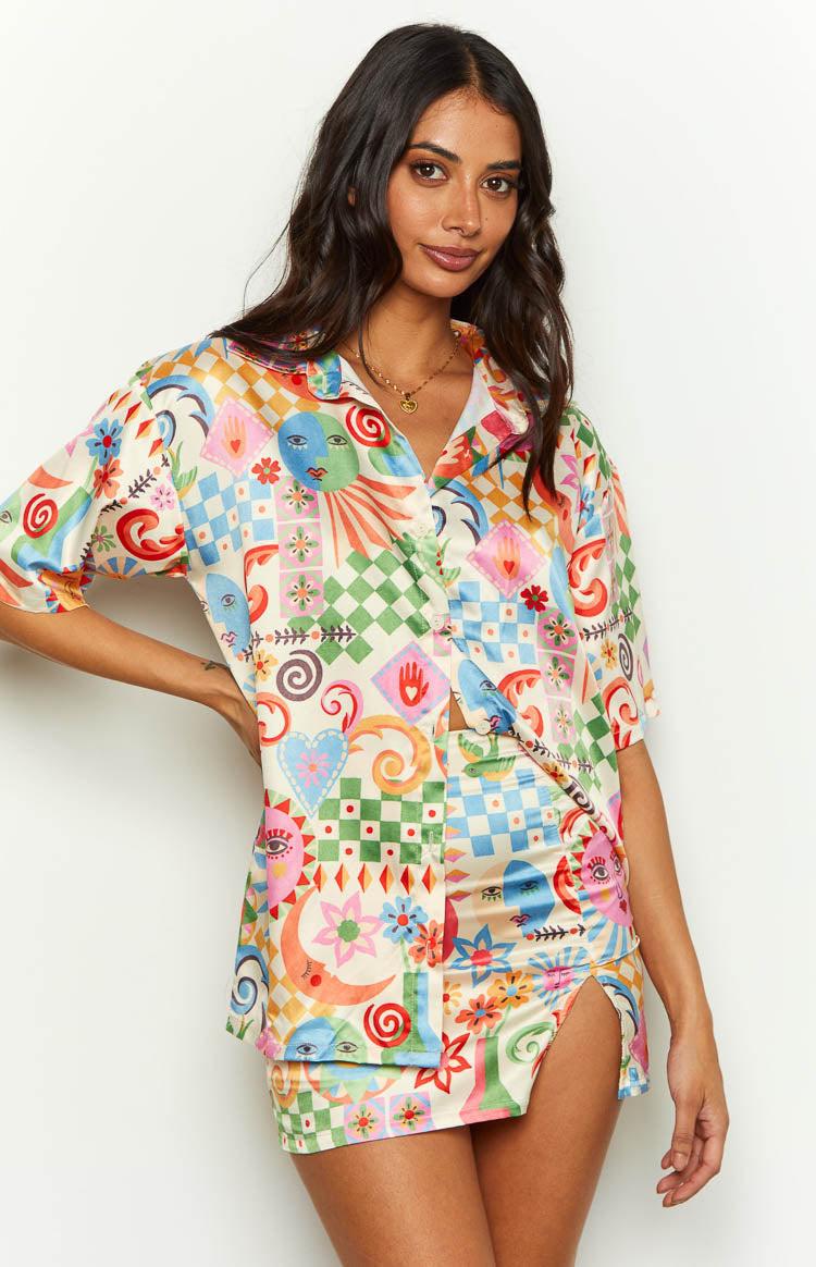 Summer Print Button Up Shirt HOW TO STYLE Our colourful print top styled with our matching print mini skirt is the perfect staple for your summer wardrobe! Wear over swimmers as a beach cover up or style with some sandals and sunglasses for the ultimate vacation outfit. FEATURES Buttons down centre front Light weight satin material Short sleeves Flowy fit Slight stretch