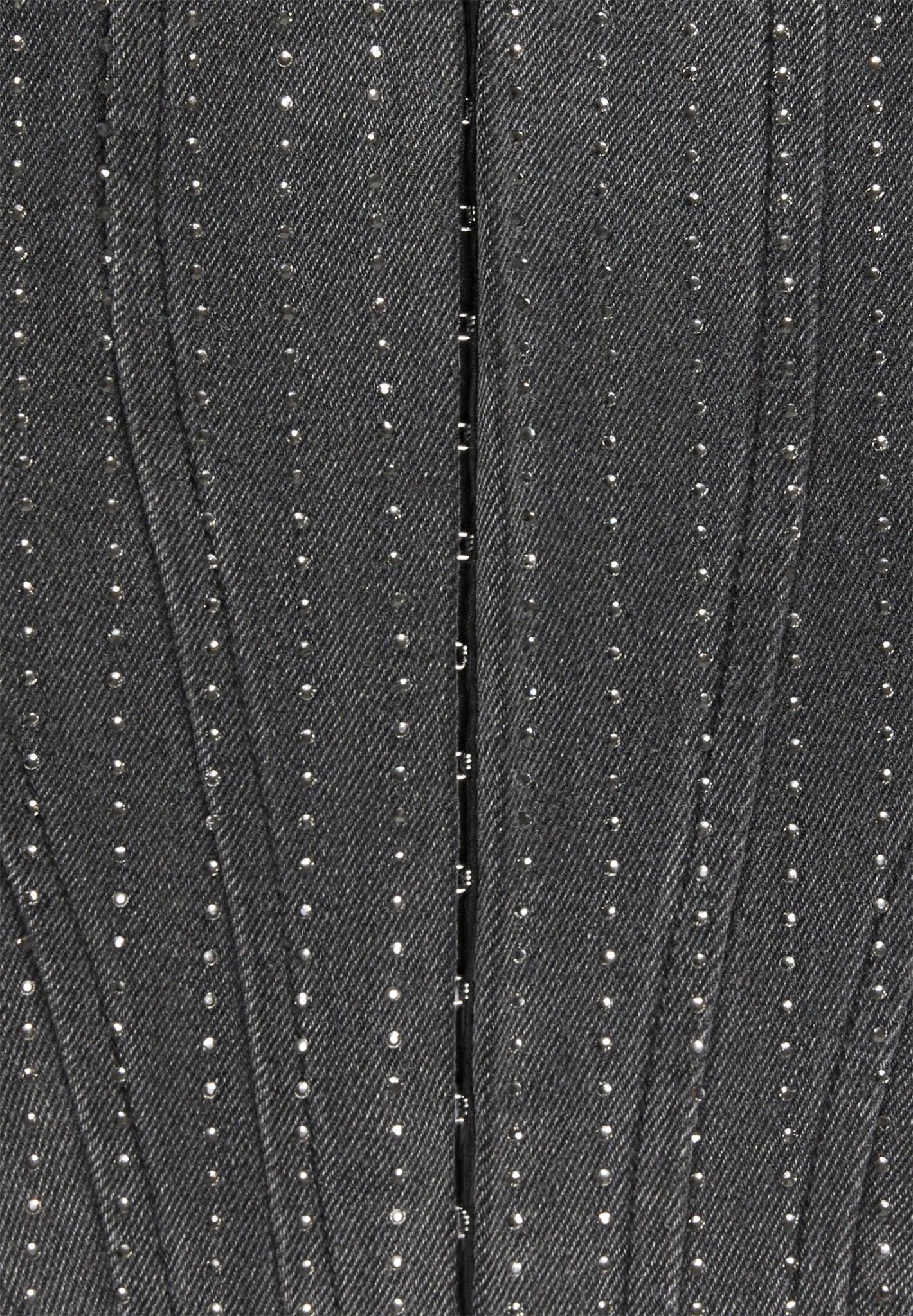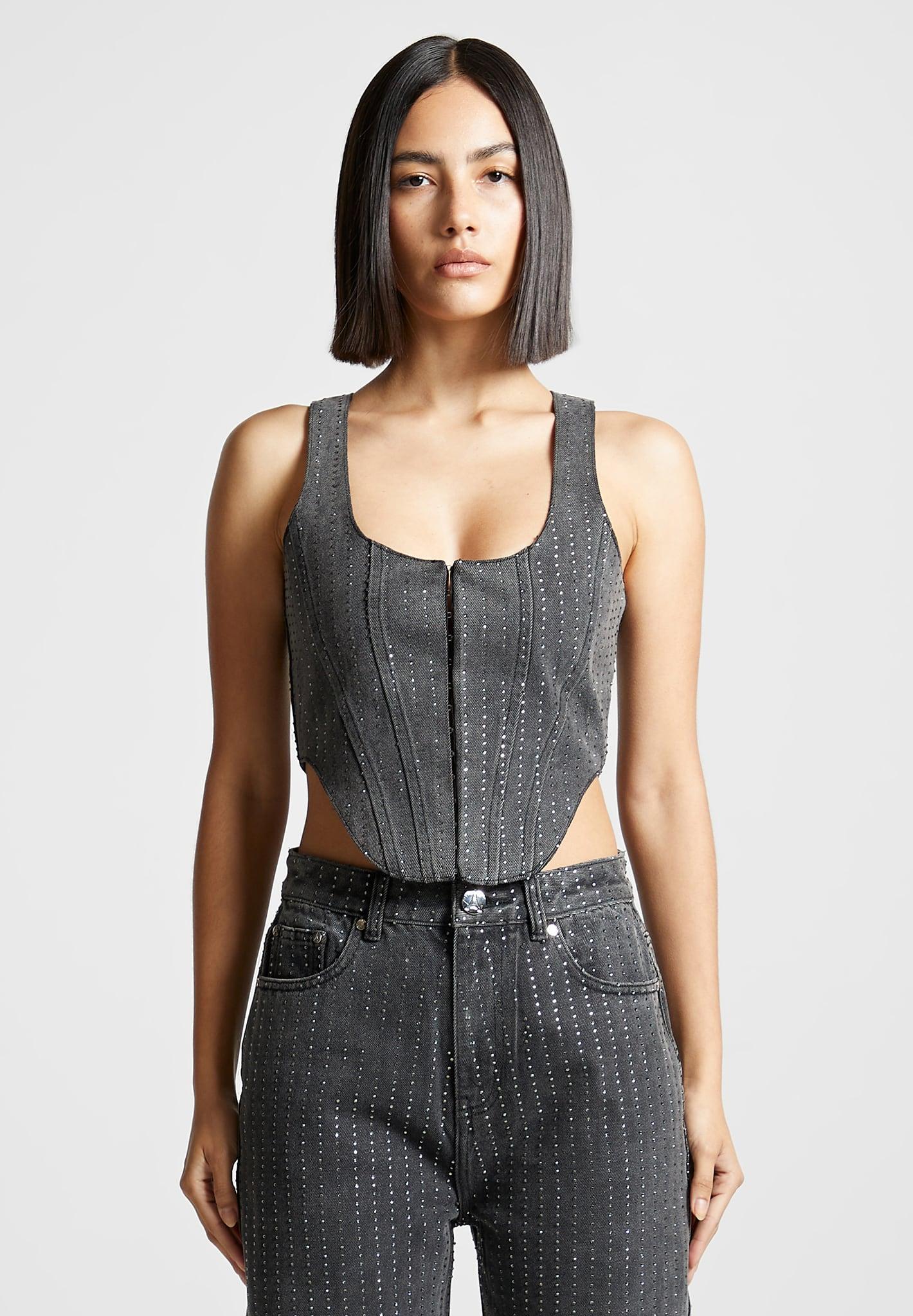 This Rhinestone Denim Corset is the perfect choice for your night out. Made with a flattering fit and sparkle detail, it is sure to make you stand out. The washed grey colour adds an extra eye-catching touch to this stylish piece. Corset Top Silhouette Rhinestone Embellishment Hook & Eye Front Fastening Dipped Hem Structured Design Silver Manière De Voir Eiffel Plaque 100% CottonAlways check the care label for wash instructions.