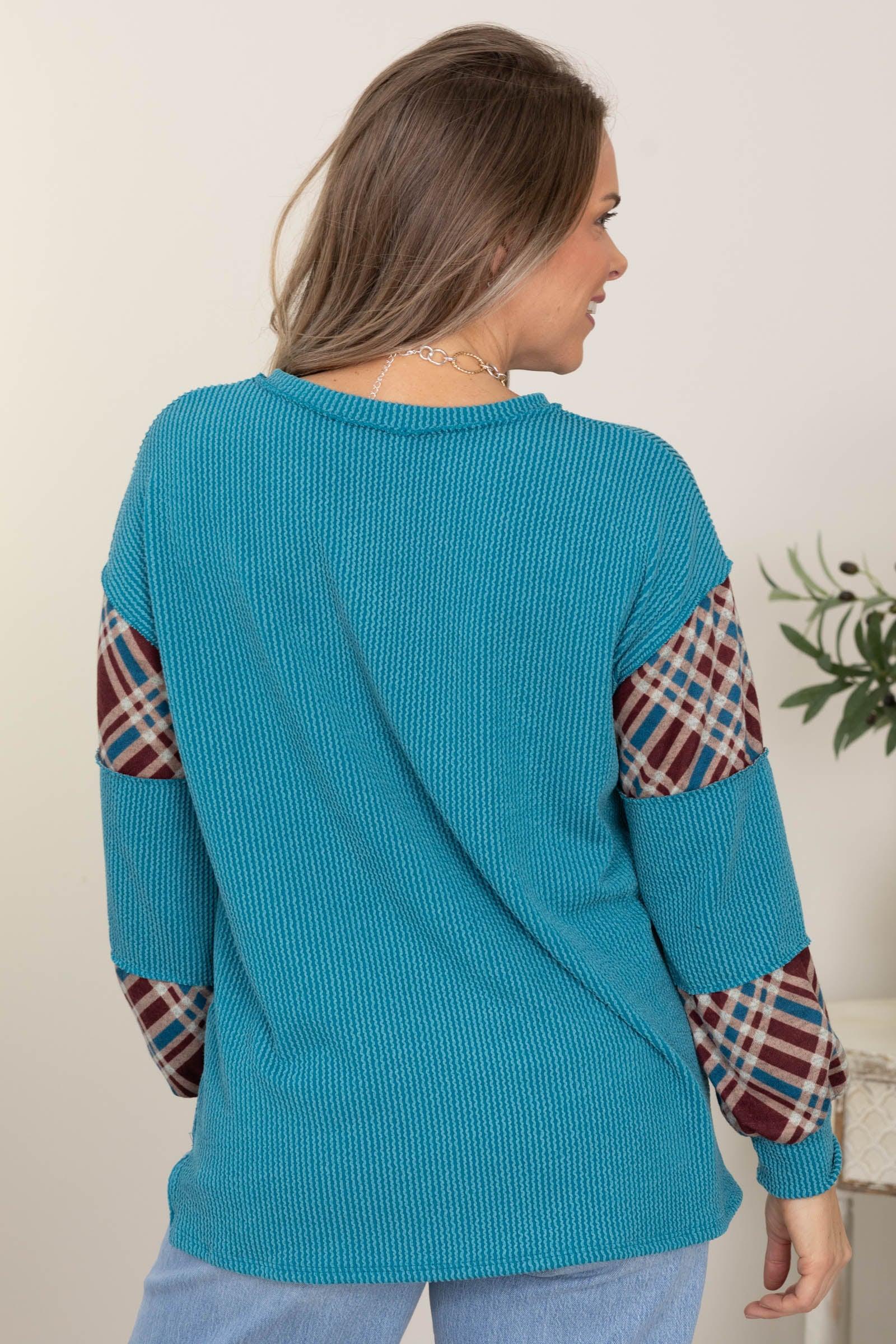 Details: Made in the USA Style: Lightweight Top Neckline: Henley Sleeve: Long Sleeve Hemline: Straight Buttons: 4 Functional Buttons on Neckline Colors: Rust, Navy, Terra Cotta, Grey/ Bright Teal, Teal, Terra Cotta, Burgundy, Grey Print: Ribbed/Plaid Texture: Raised Rib Brand: Lovely Melody Garment Measurements: Small: Bust: 44" Waist: 42" Length: 23"/26.5" Medium: Bust: 46" Waist: 44" Length: 23.5"/27" Large: Bust: 48" Waist: 46" Length: 24"/27.5" X Large: Bust: 50" Waist: 48" Length: 24.5"/28" **Erica is 5'7 + 34C Bust Wearing Size Small** Our Team Size Recommendation: We recommend true to size. Small: 2-4 Medium: 6-8 Large: 10-12 X Large: 14-16 Fabric: 76% Polyester, 21% Rayon, + 3% Spandex Care: Machine Wash Cold + Tumble Dry Low