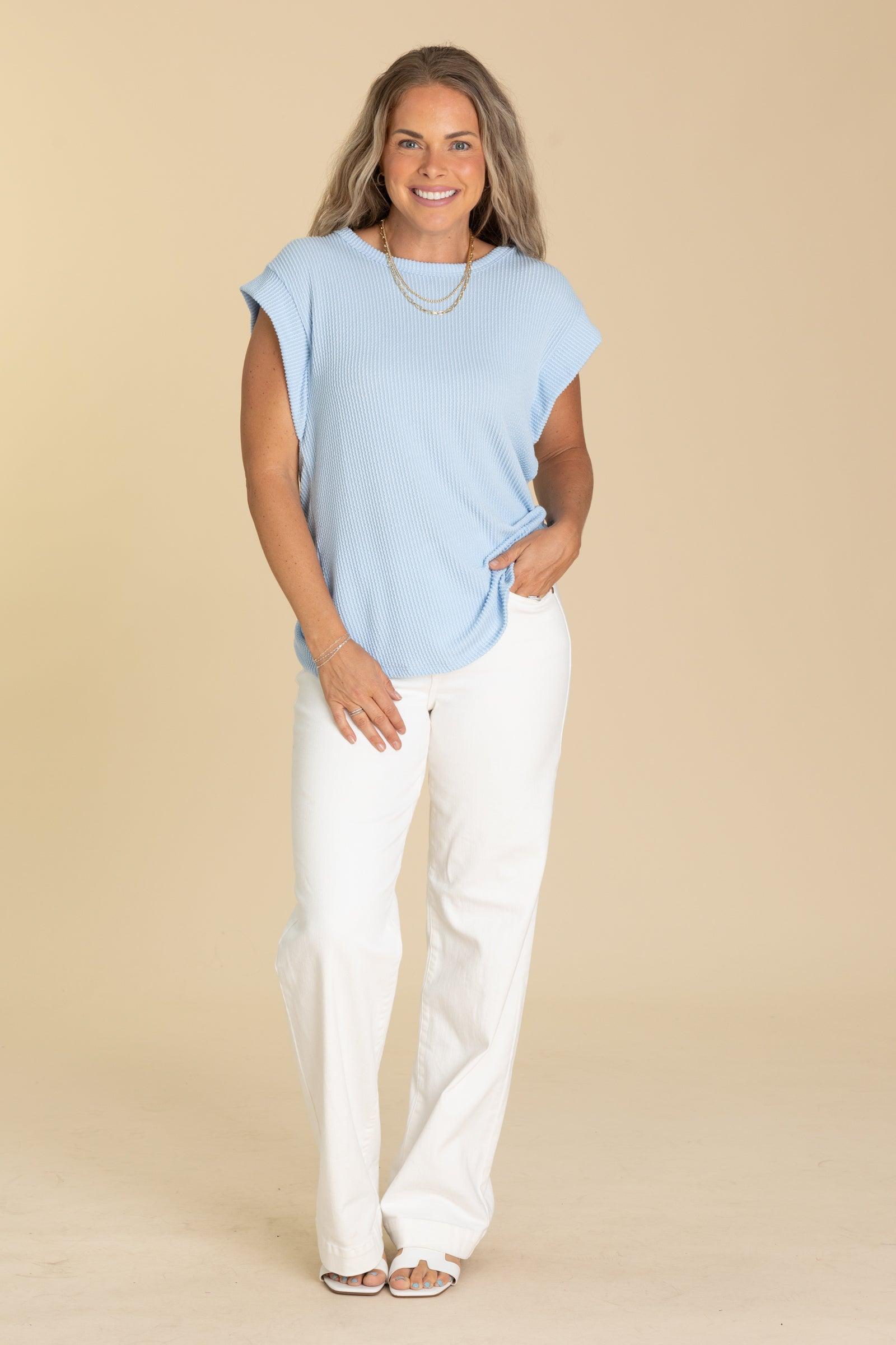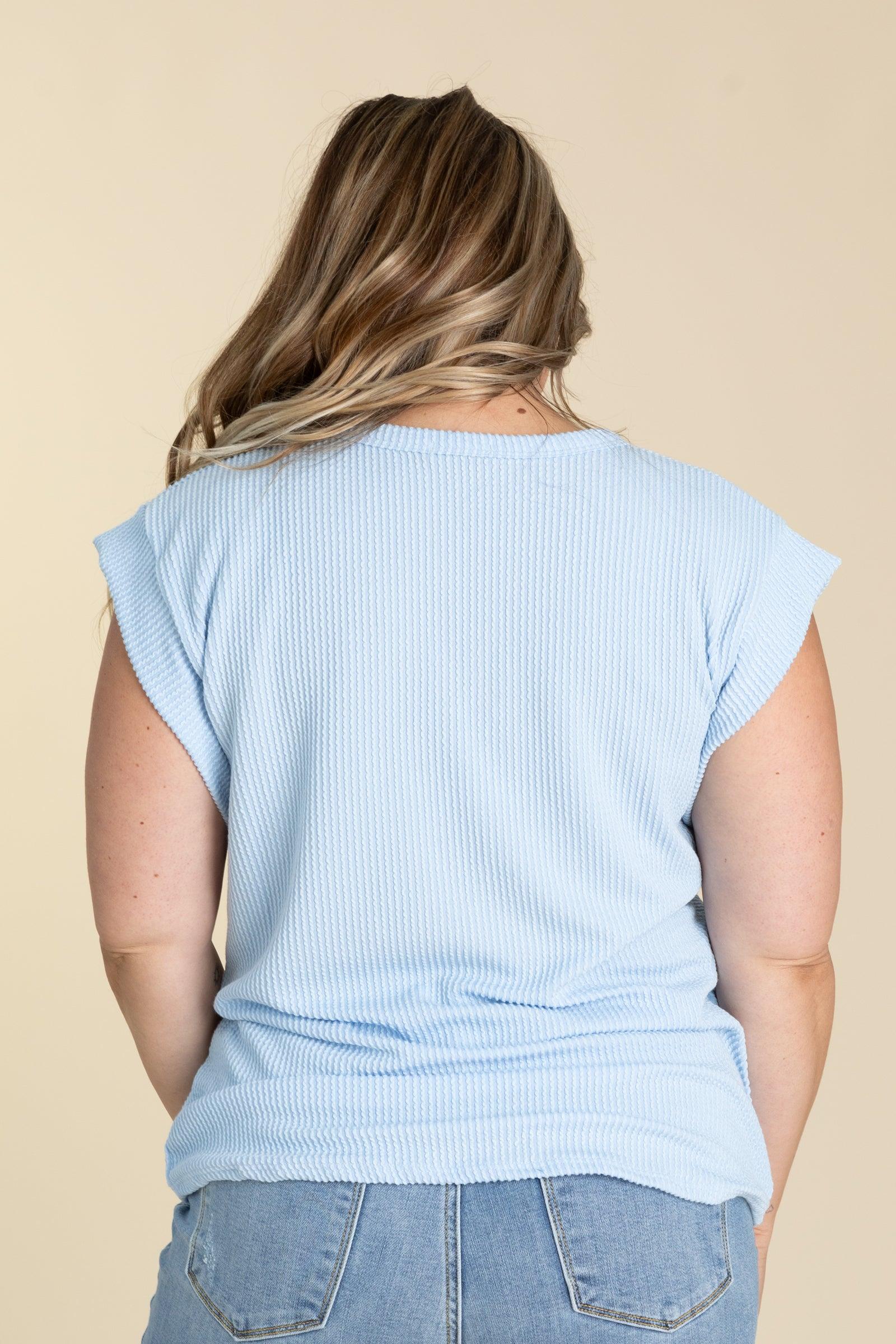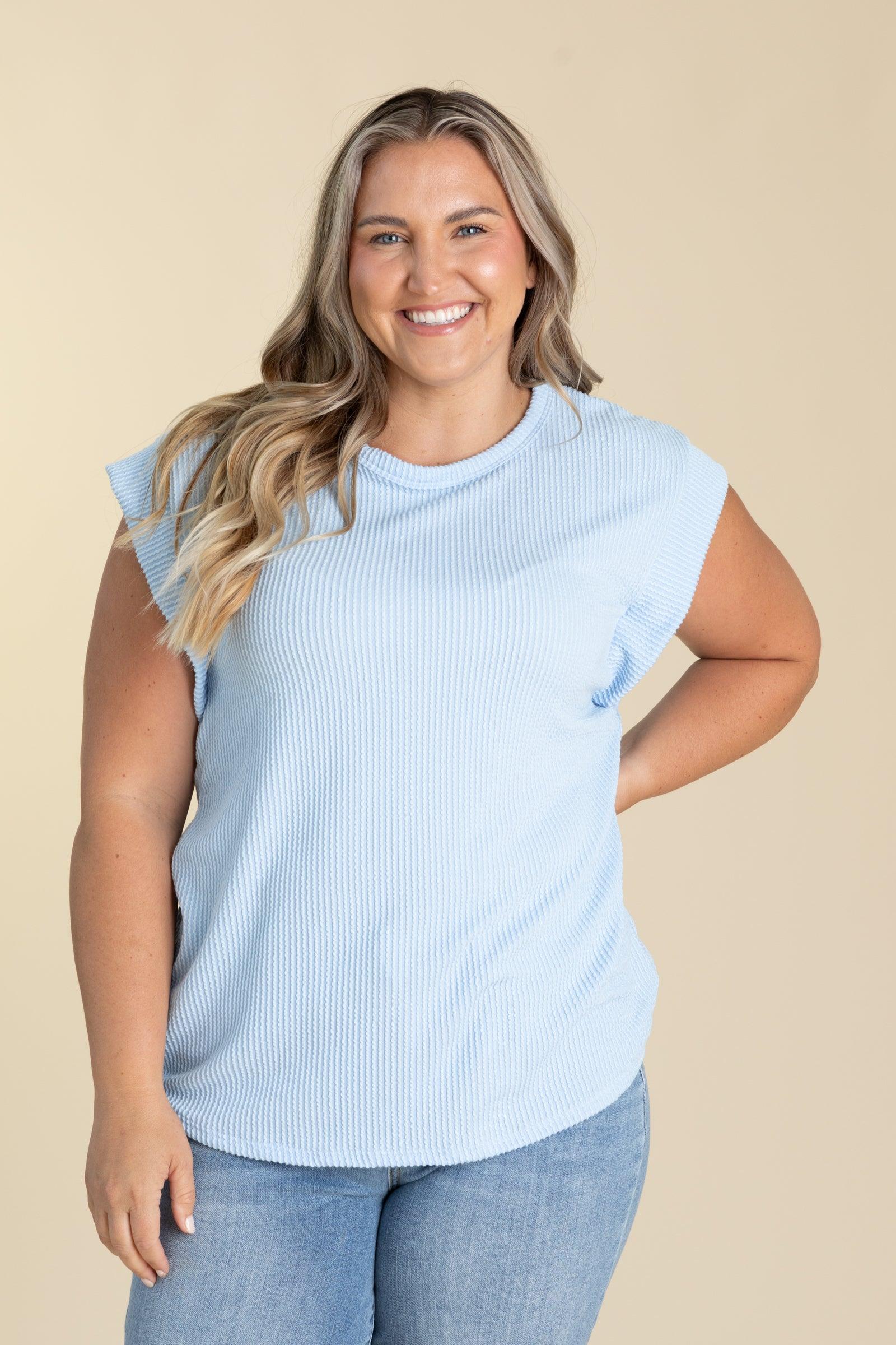 Product Details Colors: Black/ Beige/ Pastel Blue/ Hot Pink/ Yellow Print: Ribbed Neckline: Round Sleeve: Short Sleeve Hemline: Straight Brand: Heimish Material and Care 95% Polyester 5% Spandex Hand Wash Cold Hang/Line Dry Size and Fit Small: Bust 36" Waist 38" Length 26" Medium: Bust 38" Waist 40" Length 26.5" Large: Bust 40" Waist 42" Length 27" 1X Large: Bust 42" Waist 44" Length 27.5" 2X Large: Bust 44" Waist 46" Length 28" 3X Large: Bust 46" Waist 48" Length 28.5" Erica is 5’7” and wearing her true size small Courtney is 5’8” and wearing her true size large